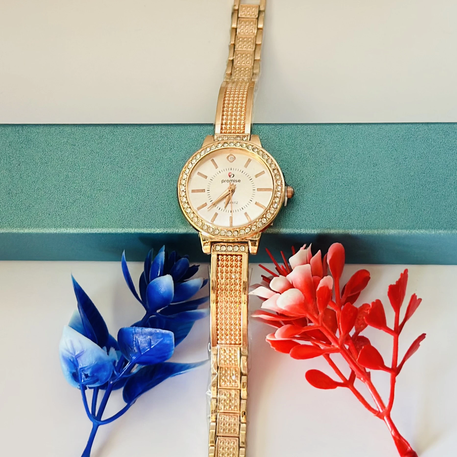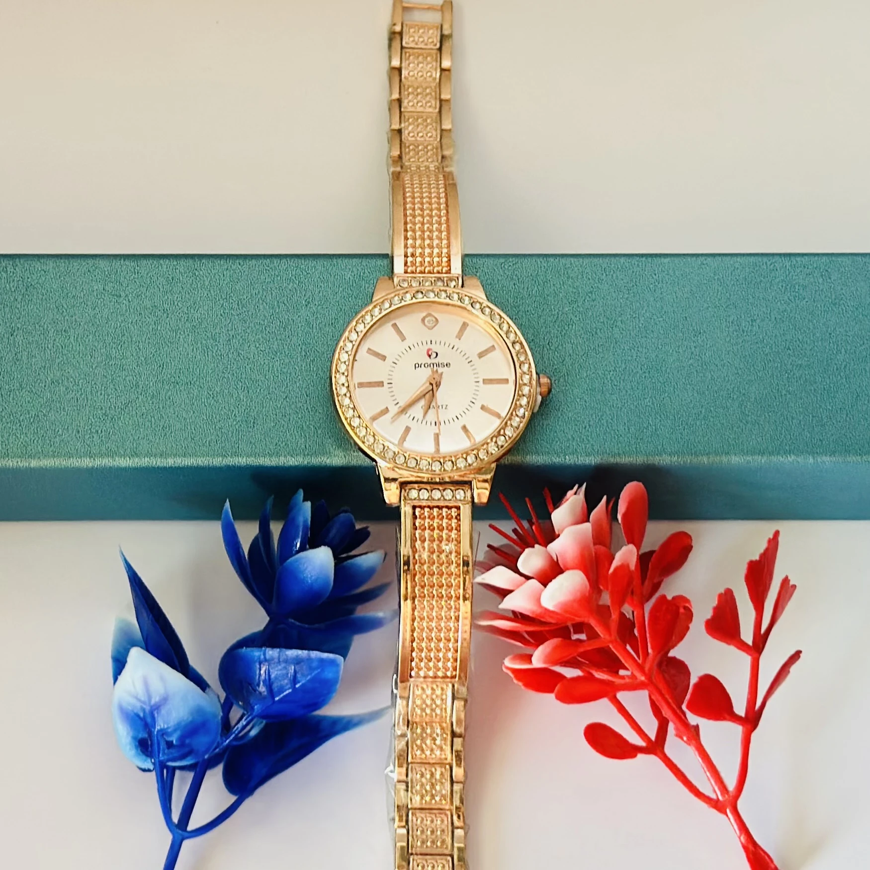 👉 Theme :- Gold tone women's analog watch with a crystal-encrusted bezel and a metal link strap