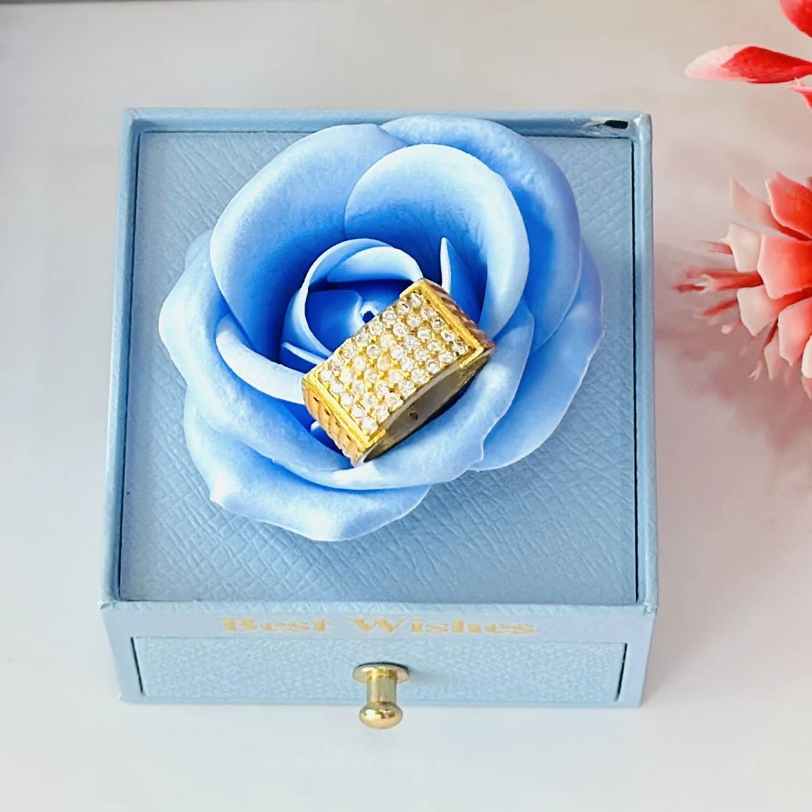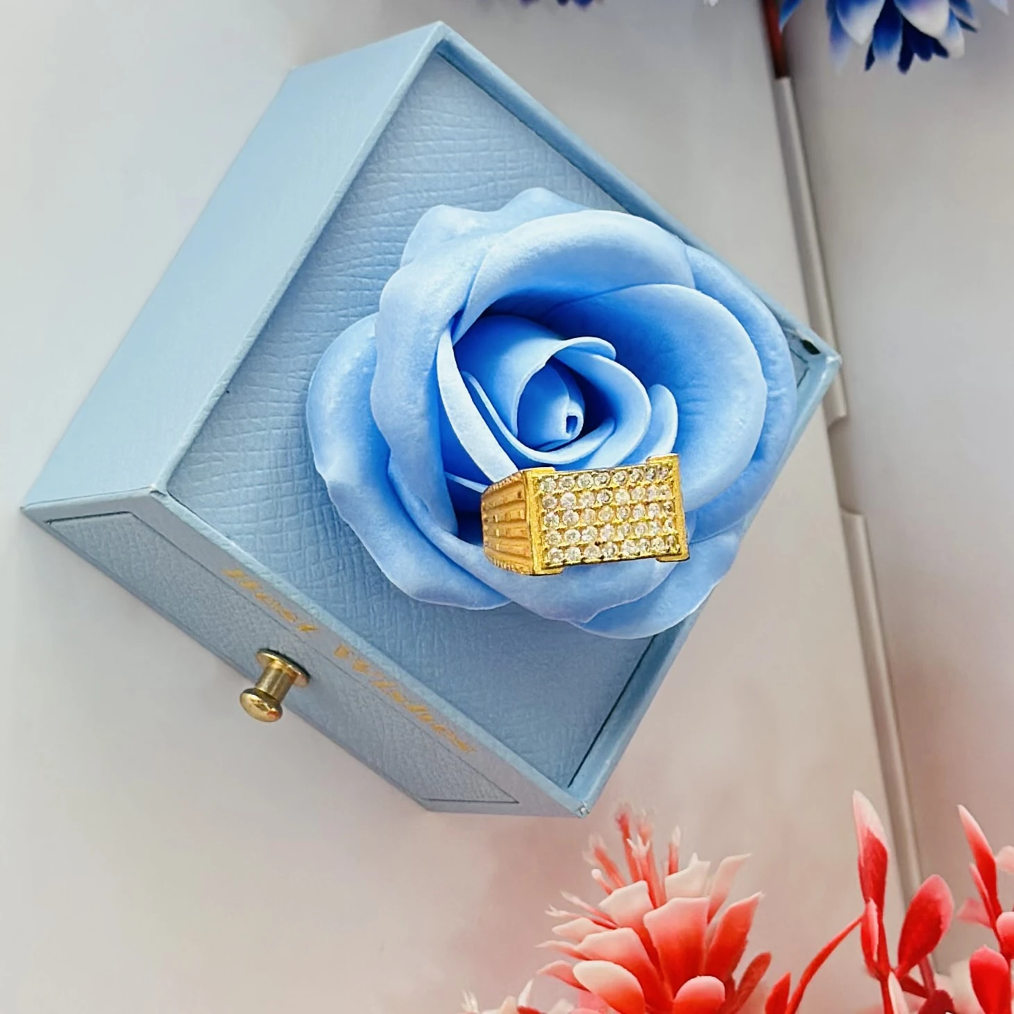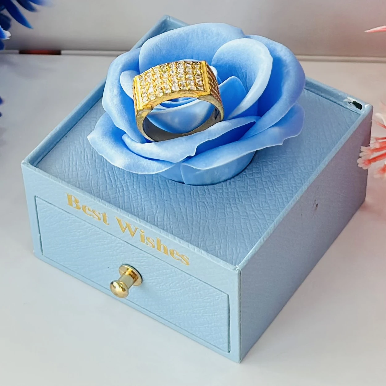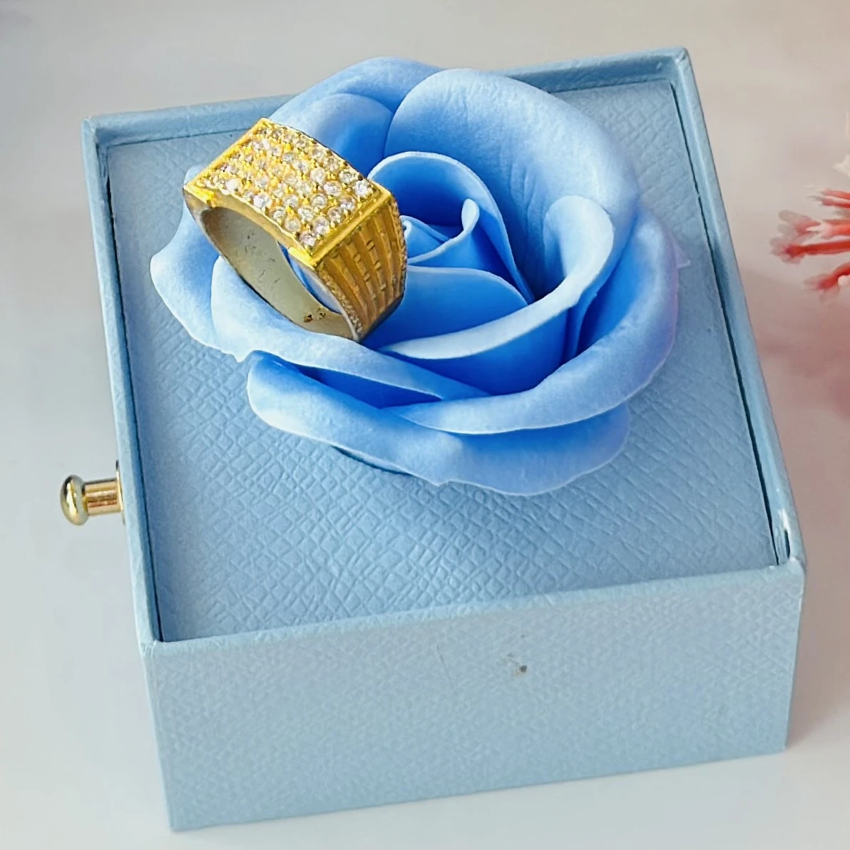 👉 Theme :- Gold gent's ring with a textured design and diamond accents.