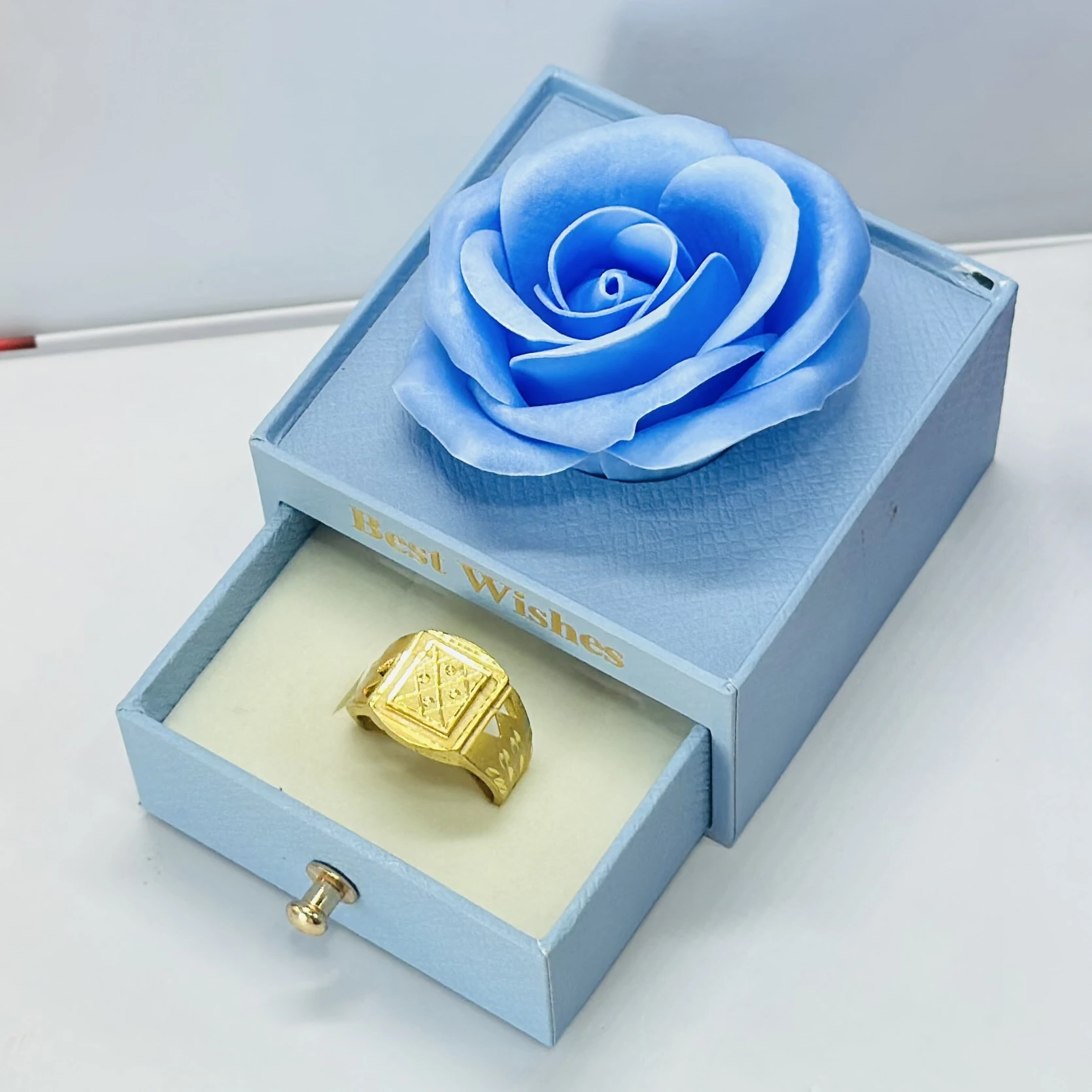 👉 Theme :- Gold plated men's ring with a square face featuring a grid of small, clear stones.