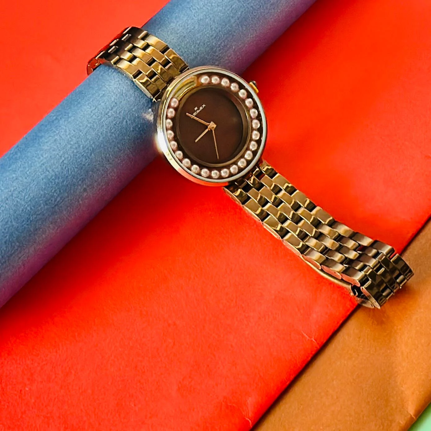 👉 Theme :- analog watch with a white dial and a rose gold metal strap