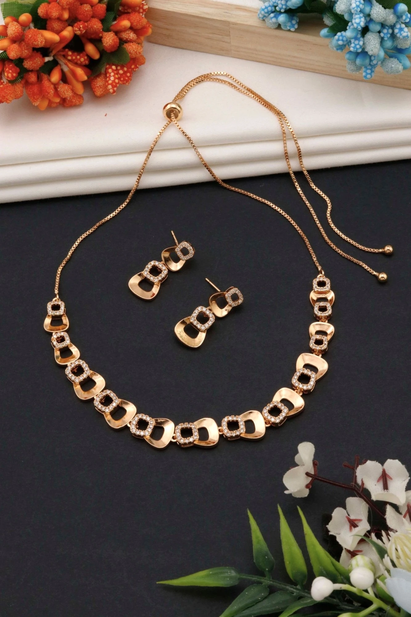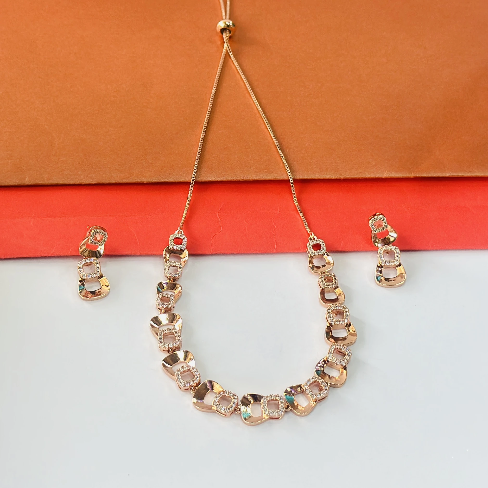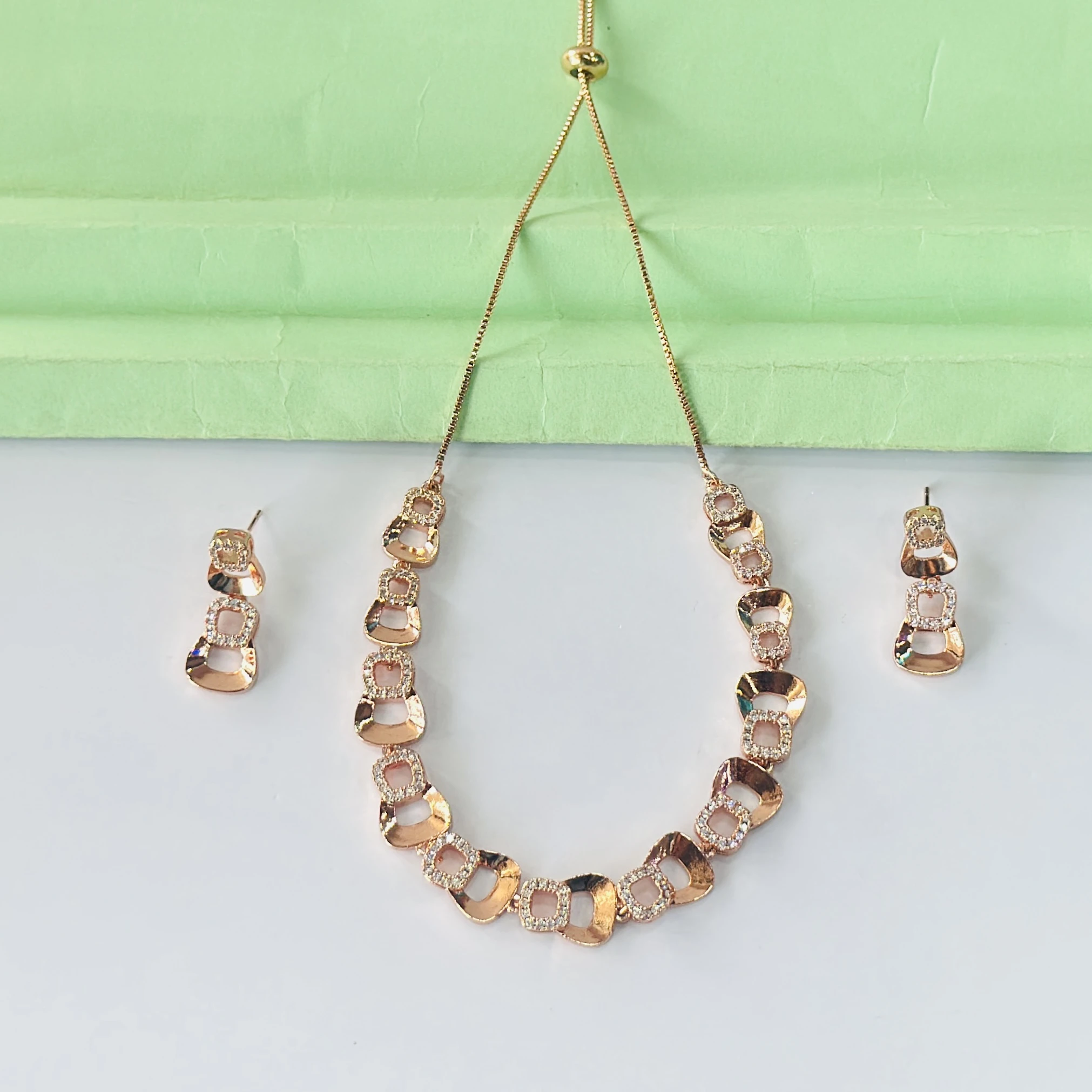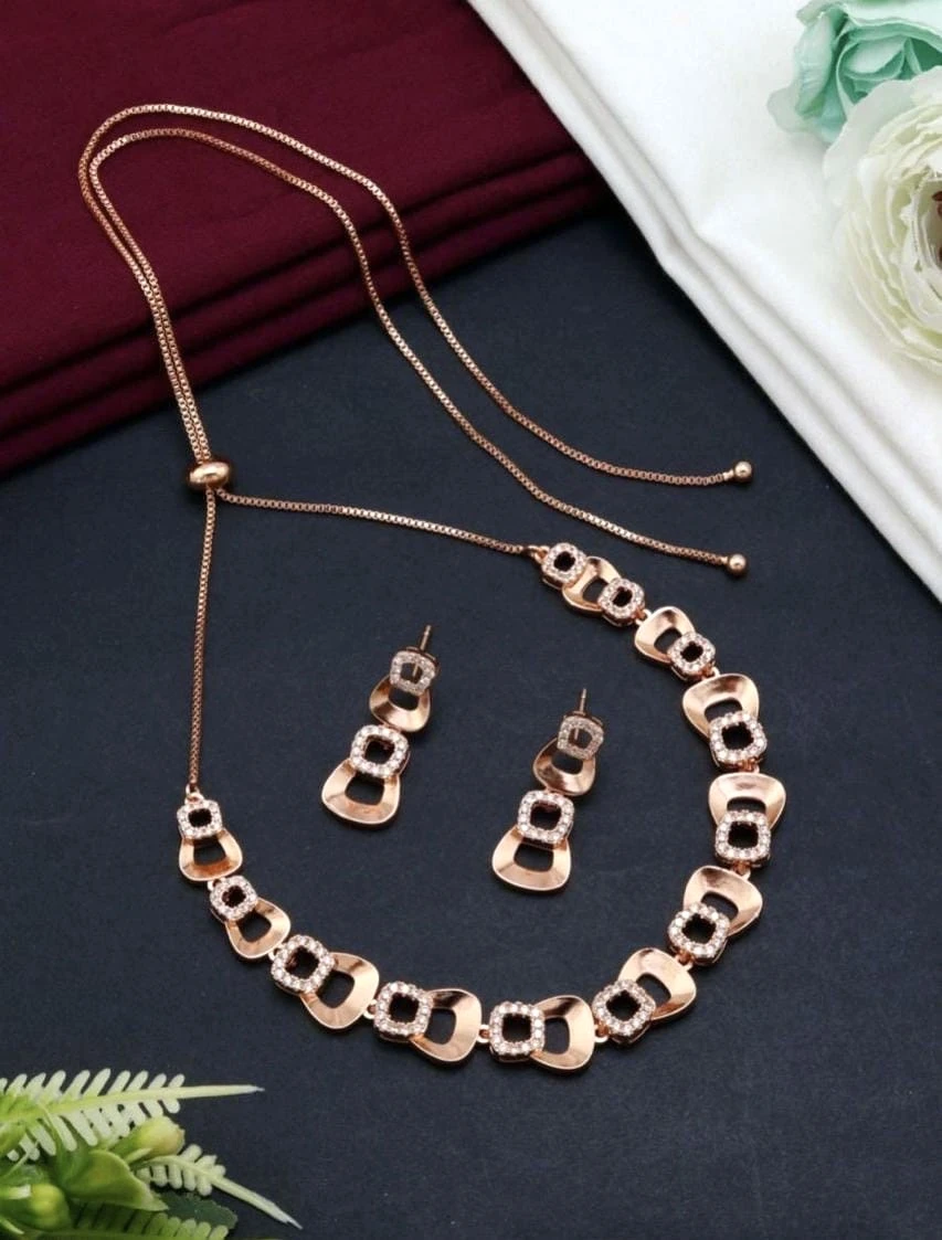 👉Theme :- Rose gold-plated American diamond-studded contemporary jewellery set consisting of a necklace and a pair of earrings.