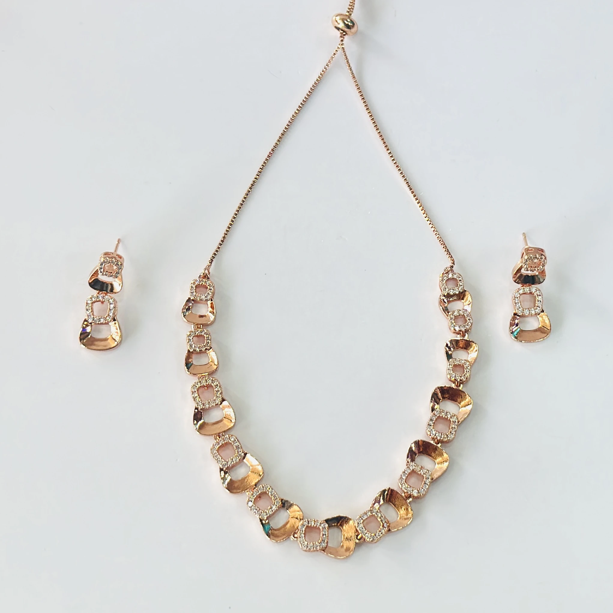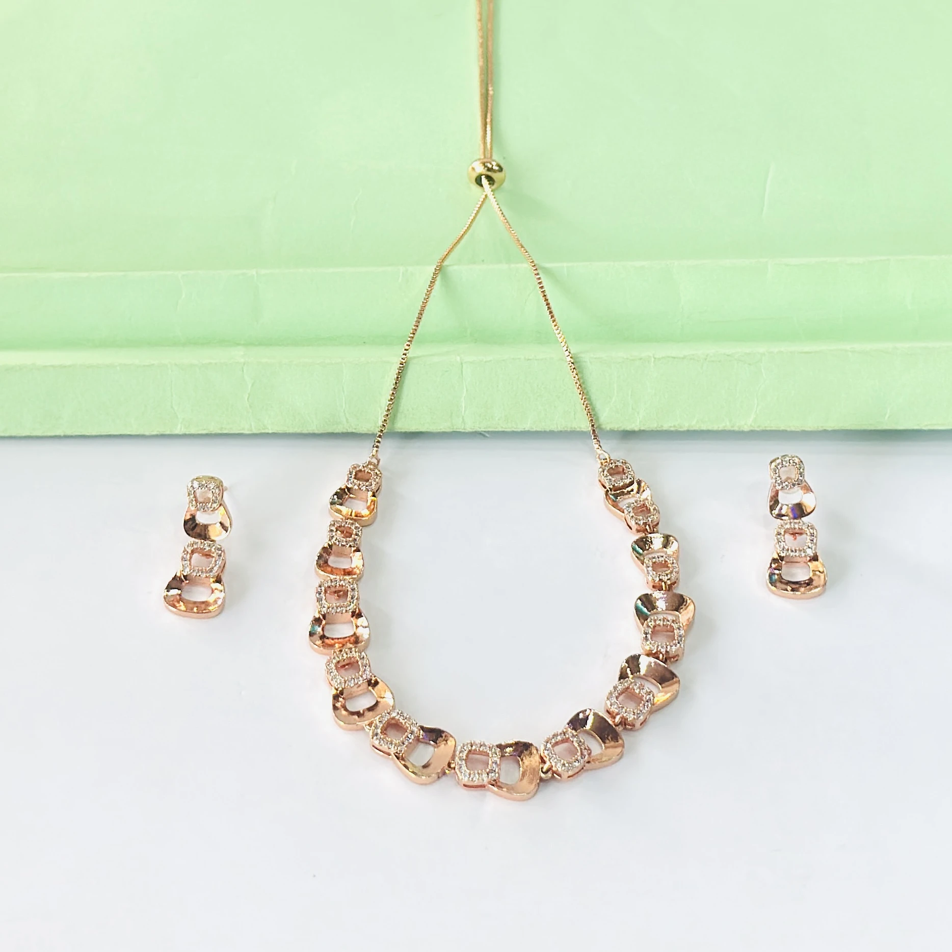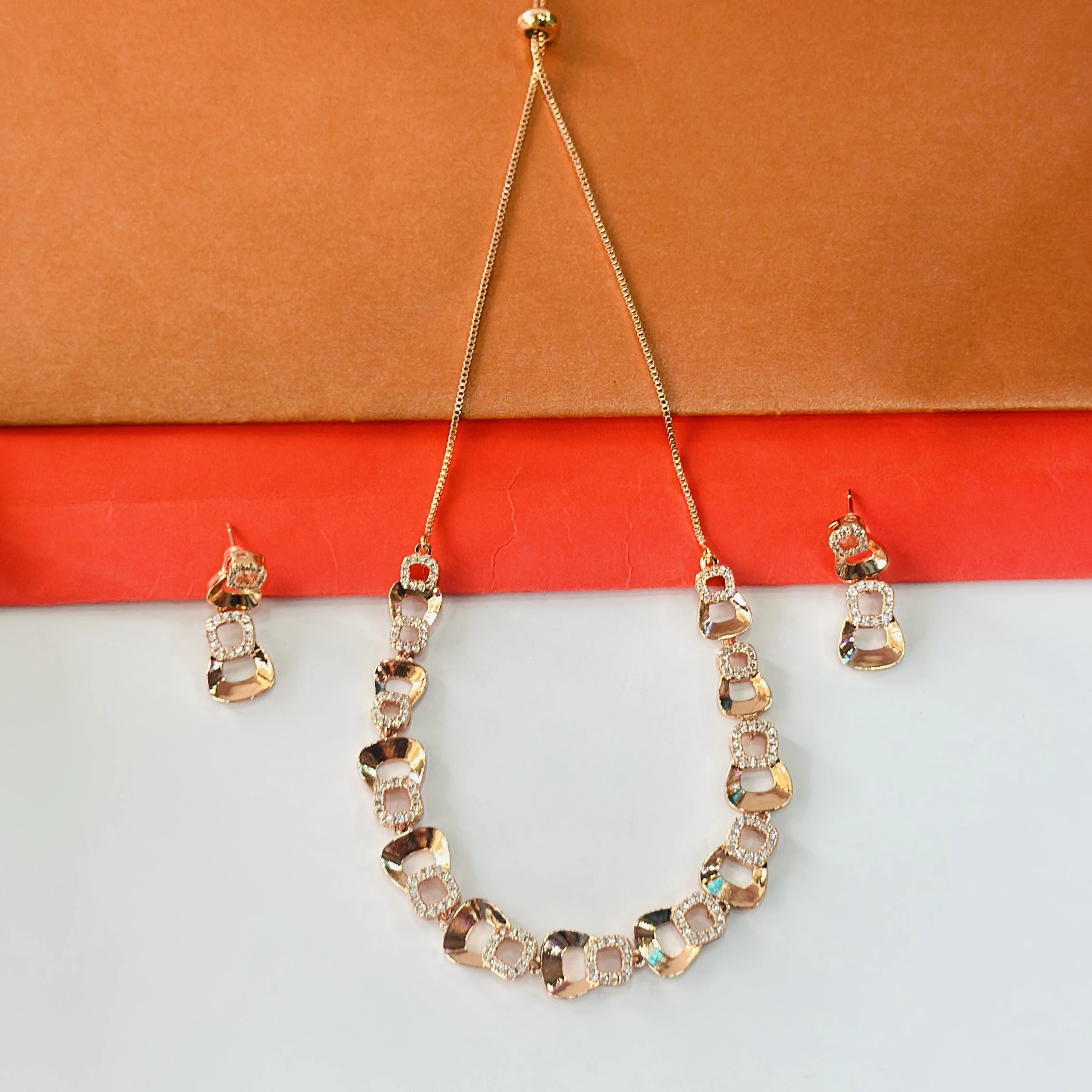 👉Theme :- Rose gold-plated American diamond-studded contemporary jewellery set consisting of a necklace and a pair of earrings.
