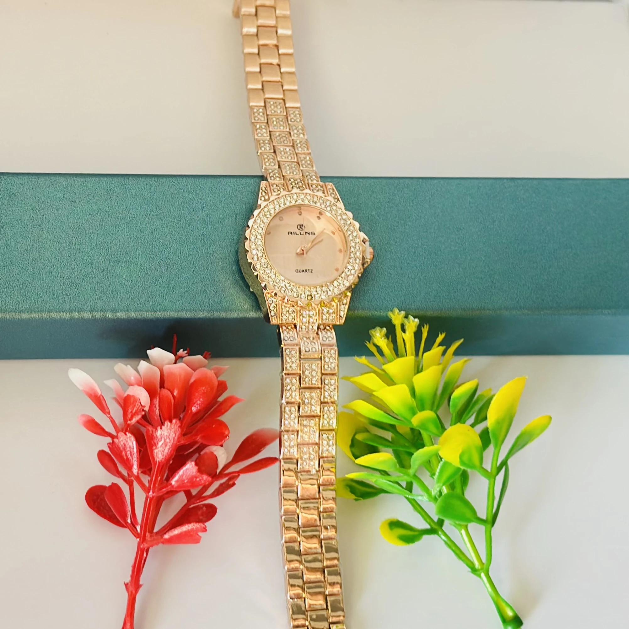 👉 Theme :- ladies' quartz watch with a gold-tone crystal bracelet.