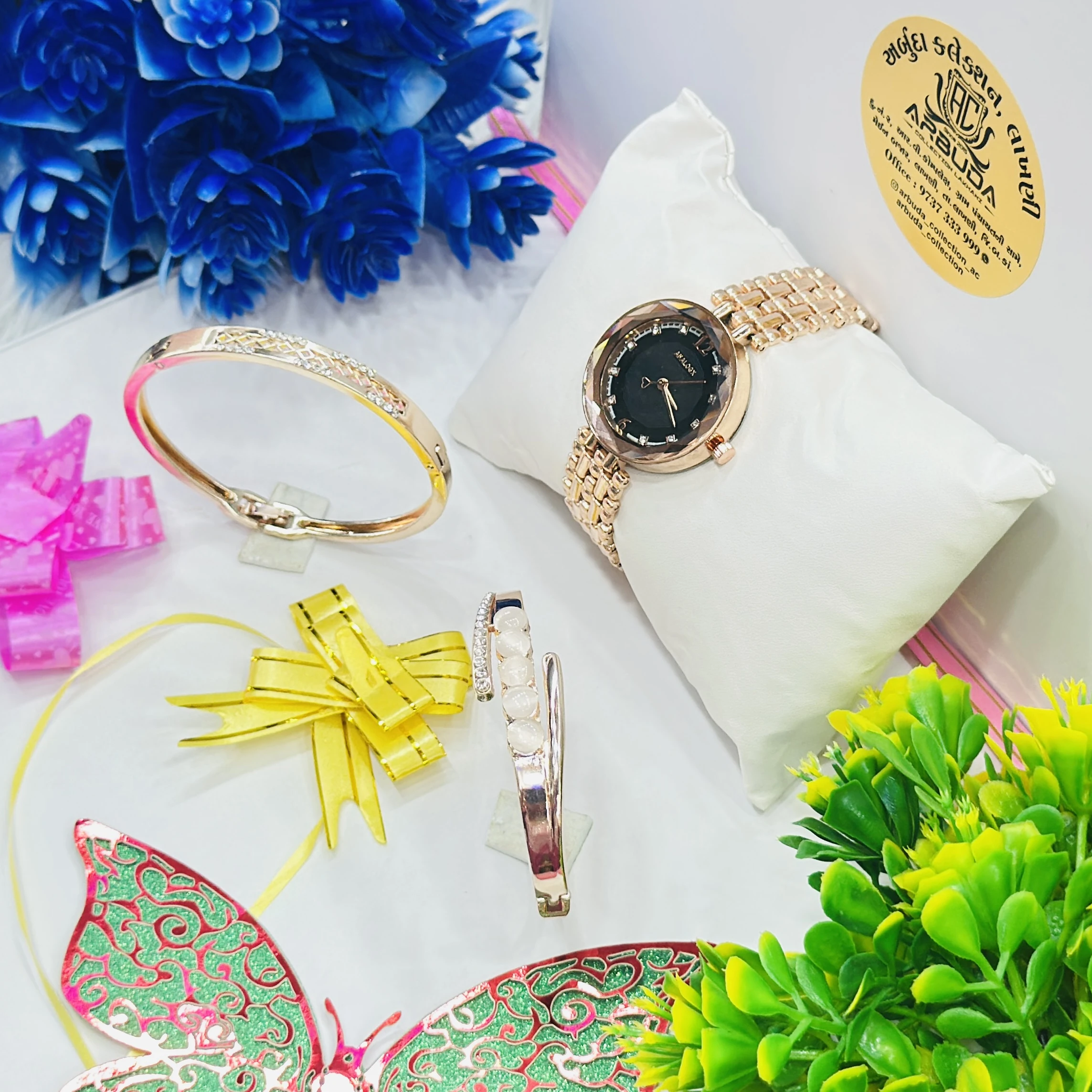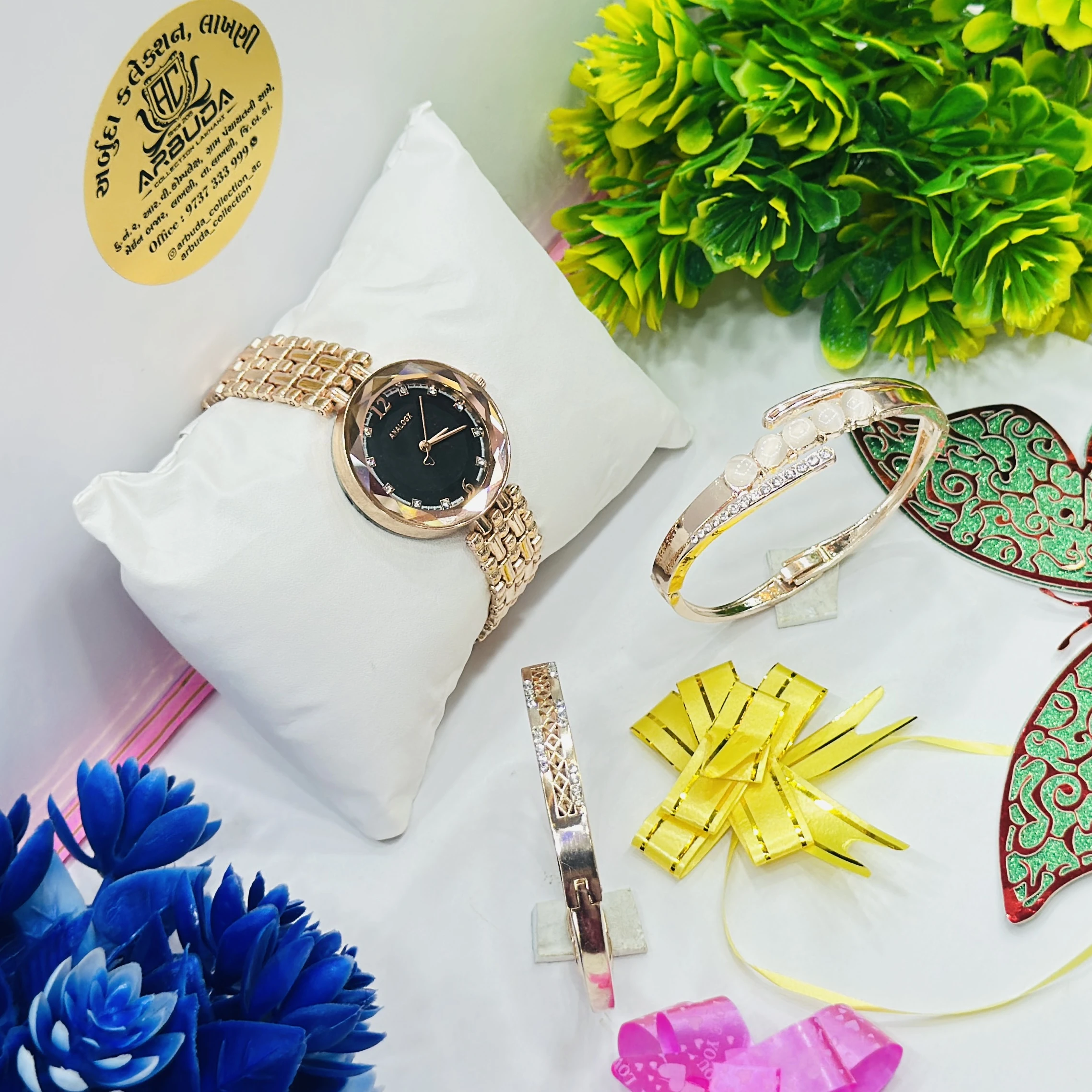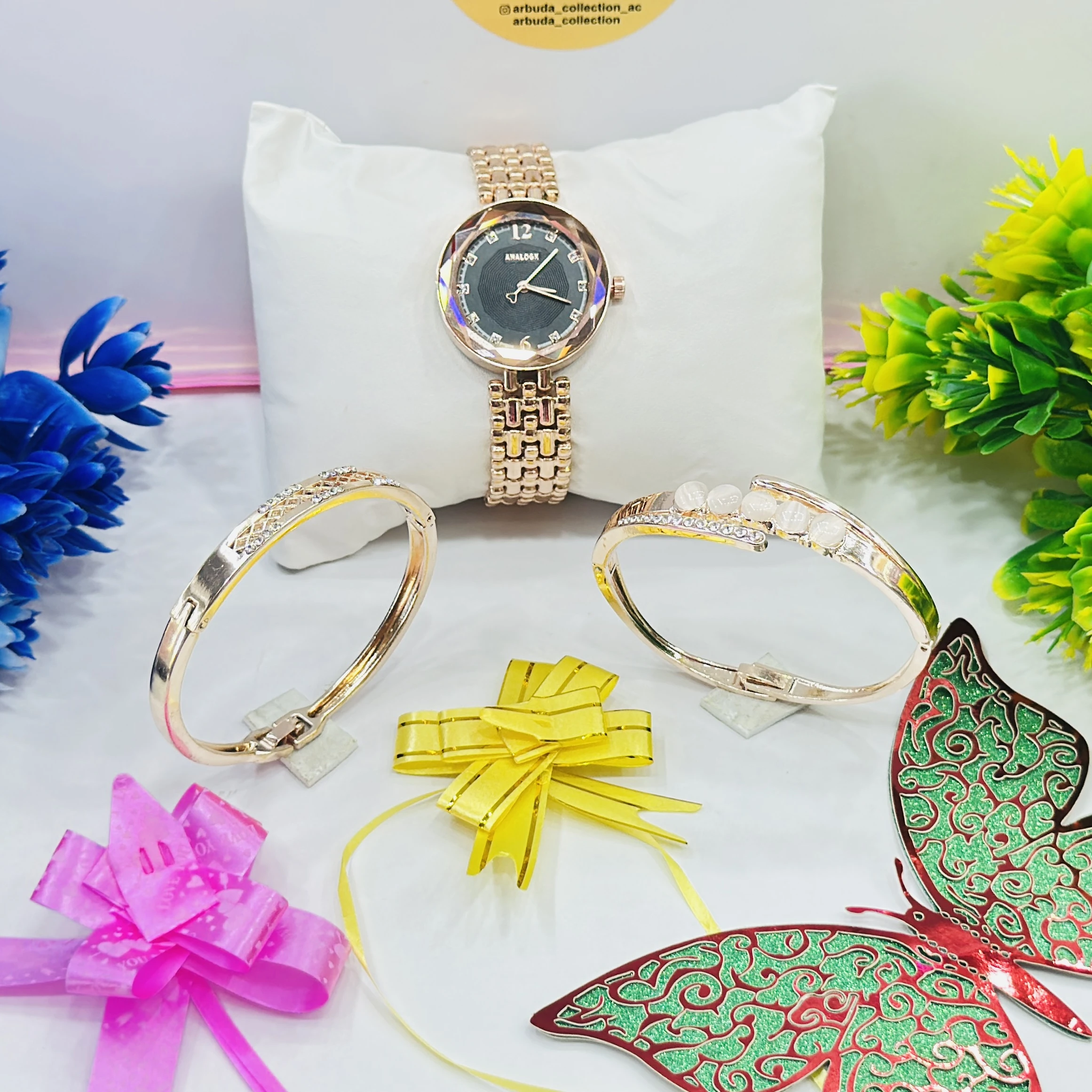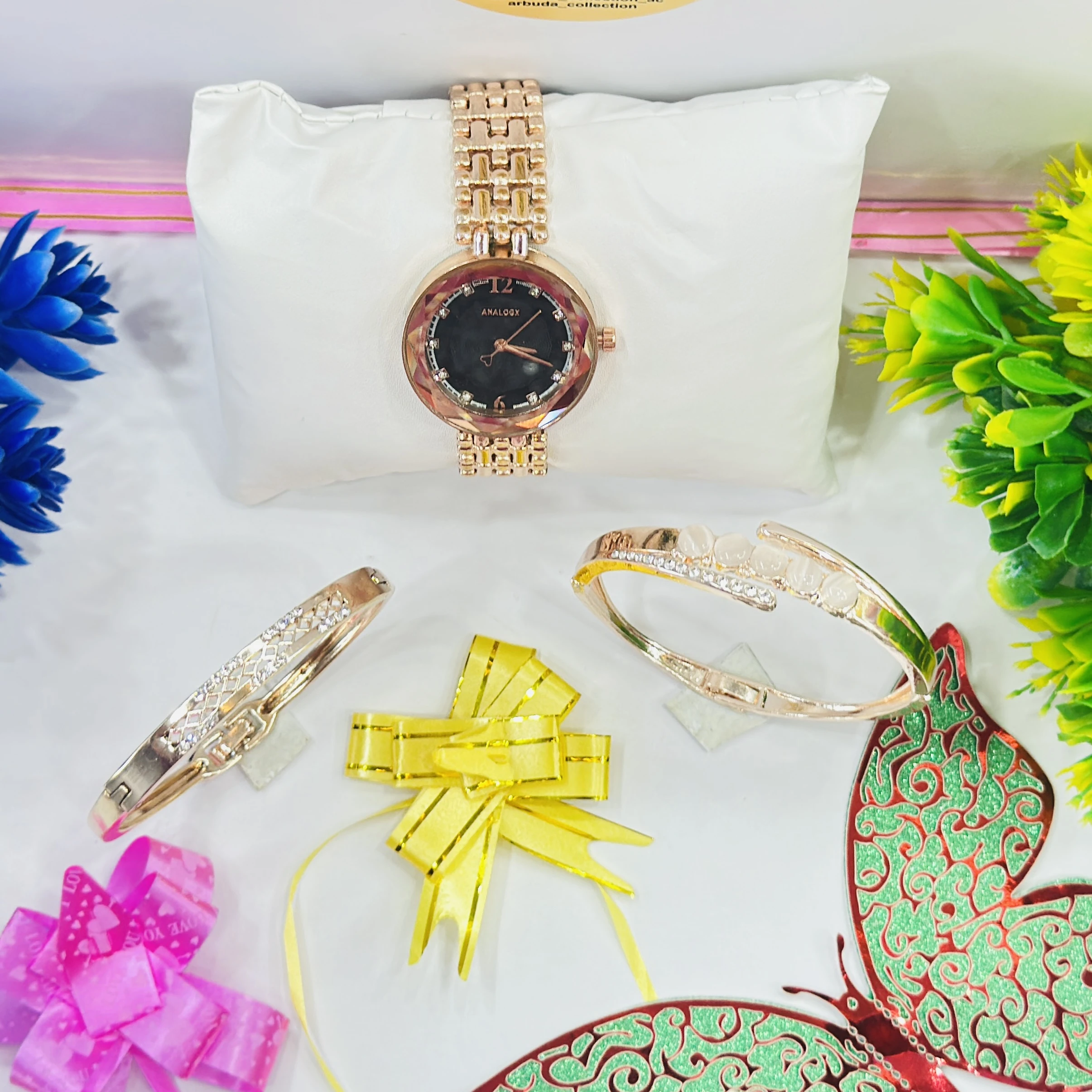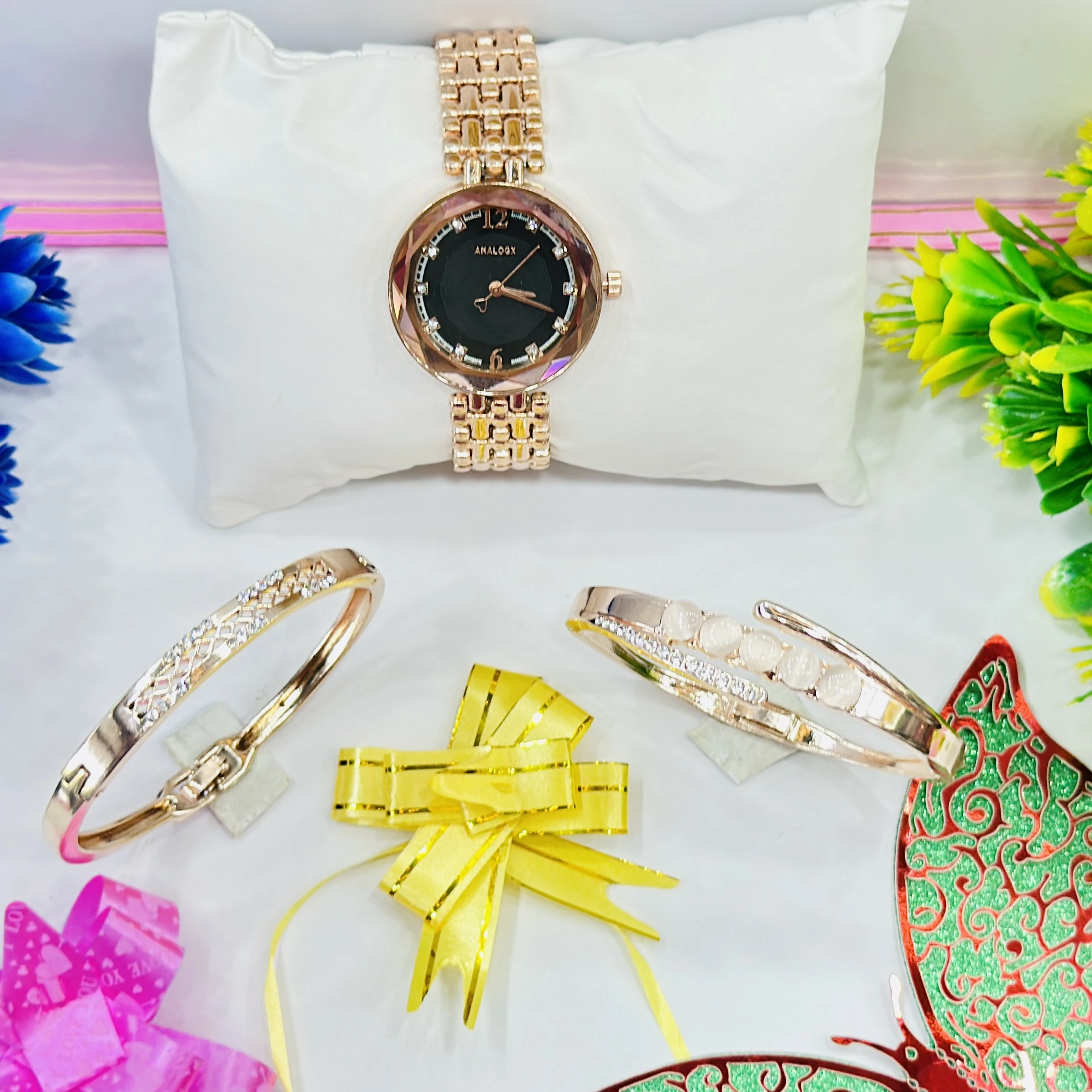 ladies' rose gold-tone Analogx brand watch set that includes matching bracelets.