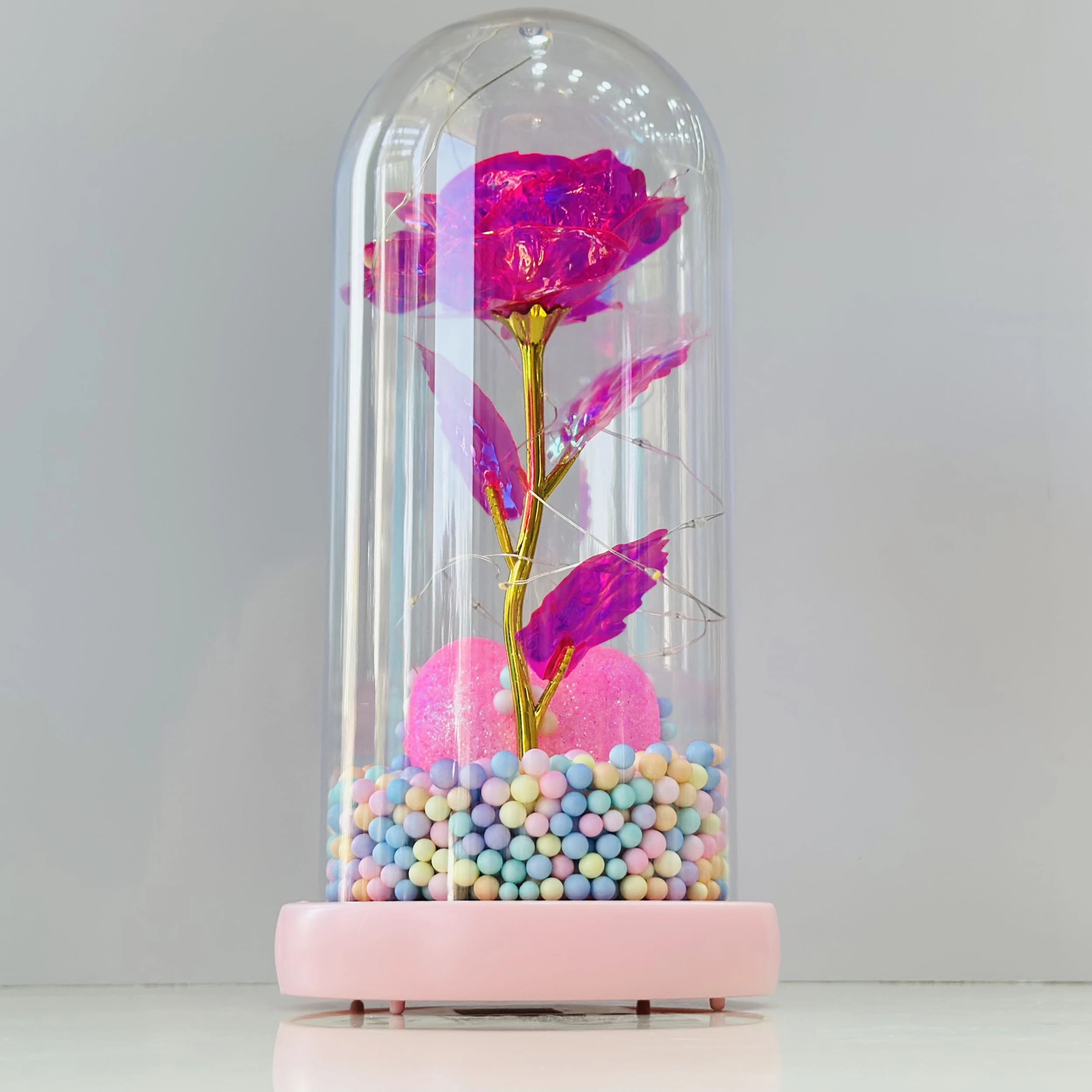 👉 Theme :- an LED eternal rose dome light, also known as a galaxy rose in a glass dome. It is an artificial flower with LED lights inside a glass dome, often with a decorative base.