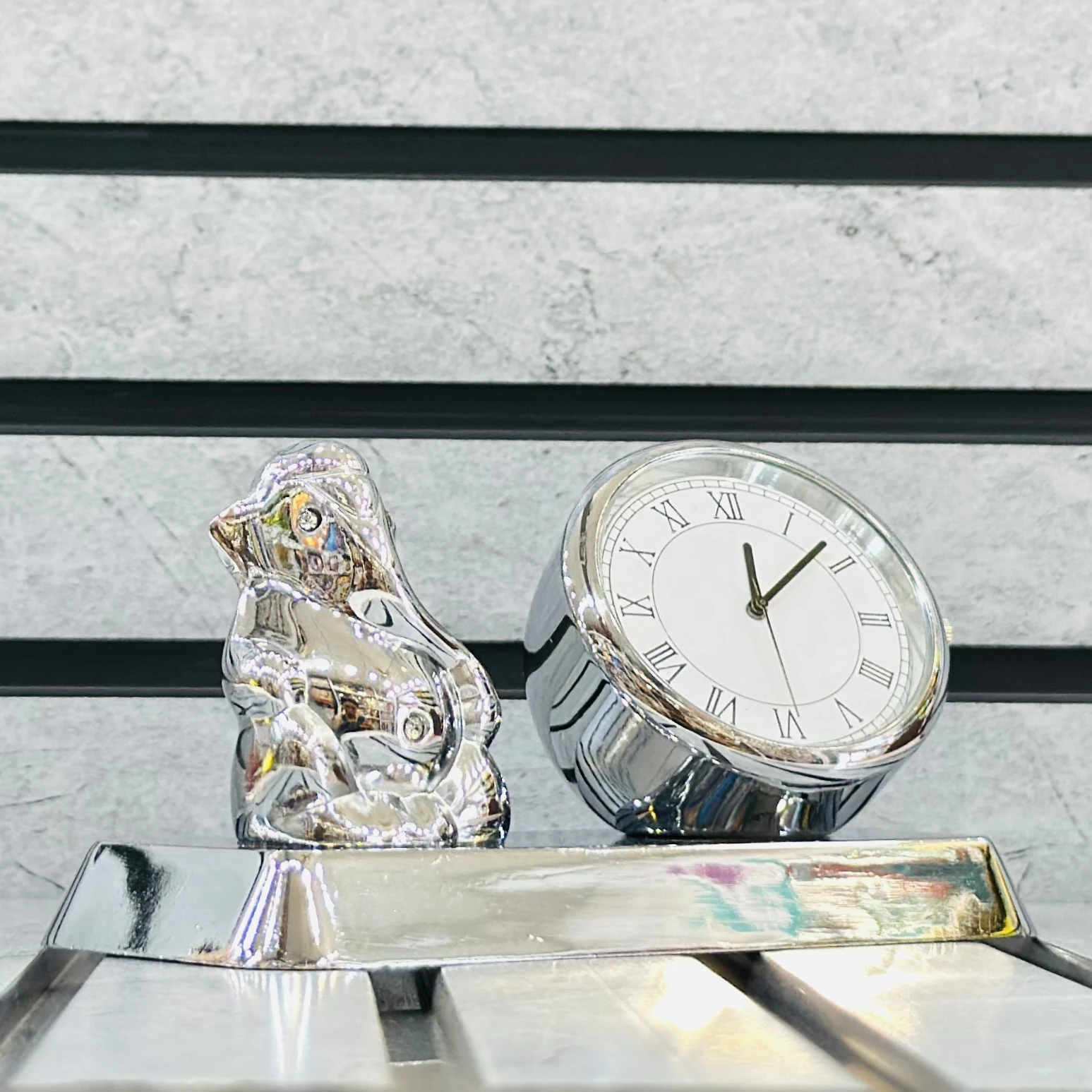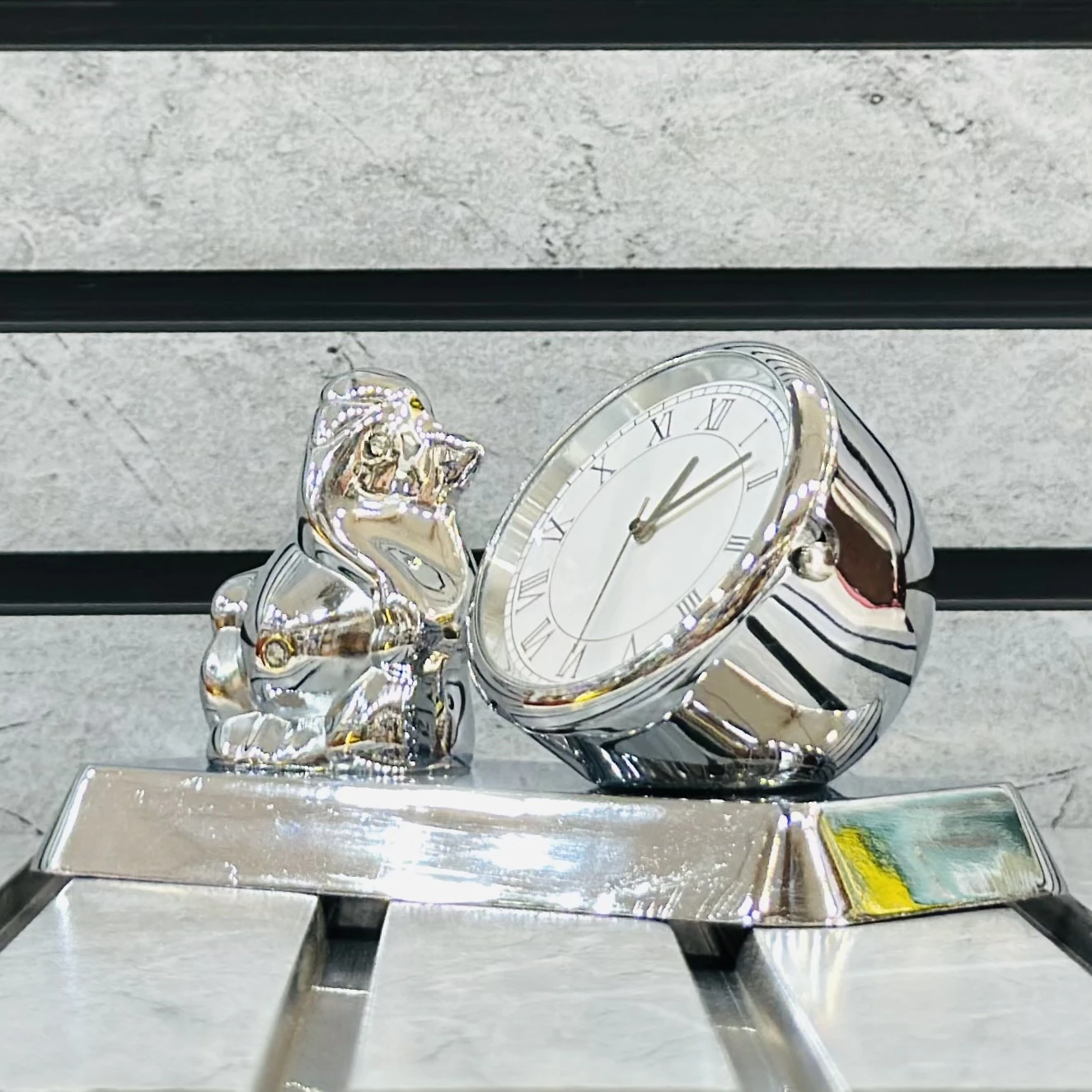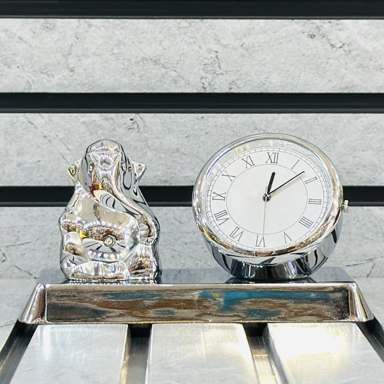 👉 Theme :-silver-plated Lord Ganesha idol with an integrated analog table clock, often used as a decorative showpiece or corporate gift.