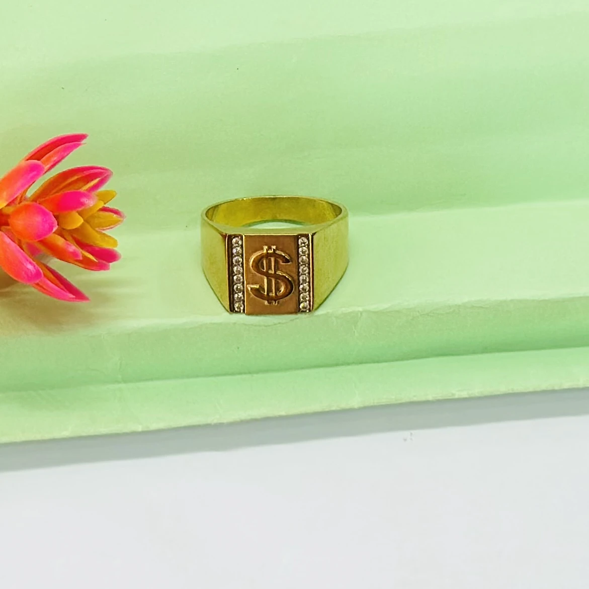 👉 Theme :- Men’s 14k gold dollar sign ring with side stones.