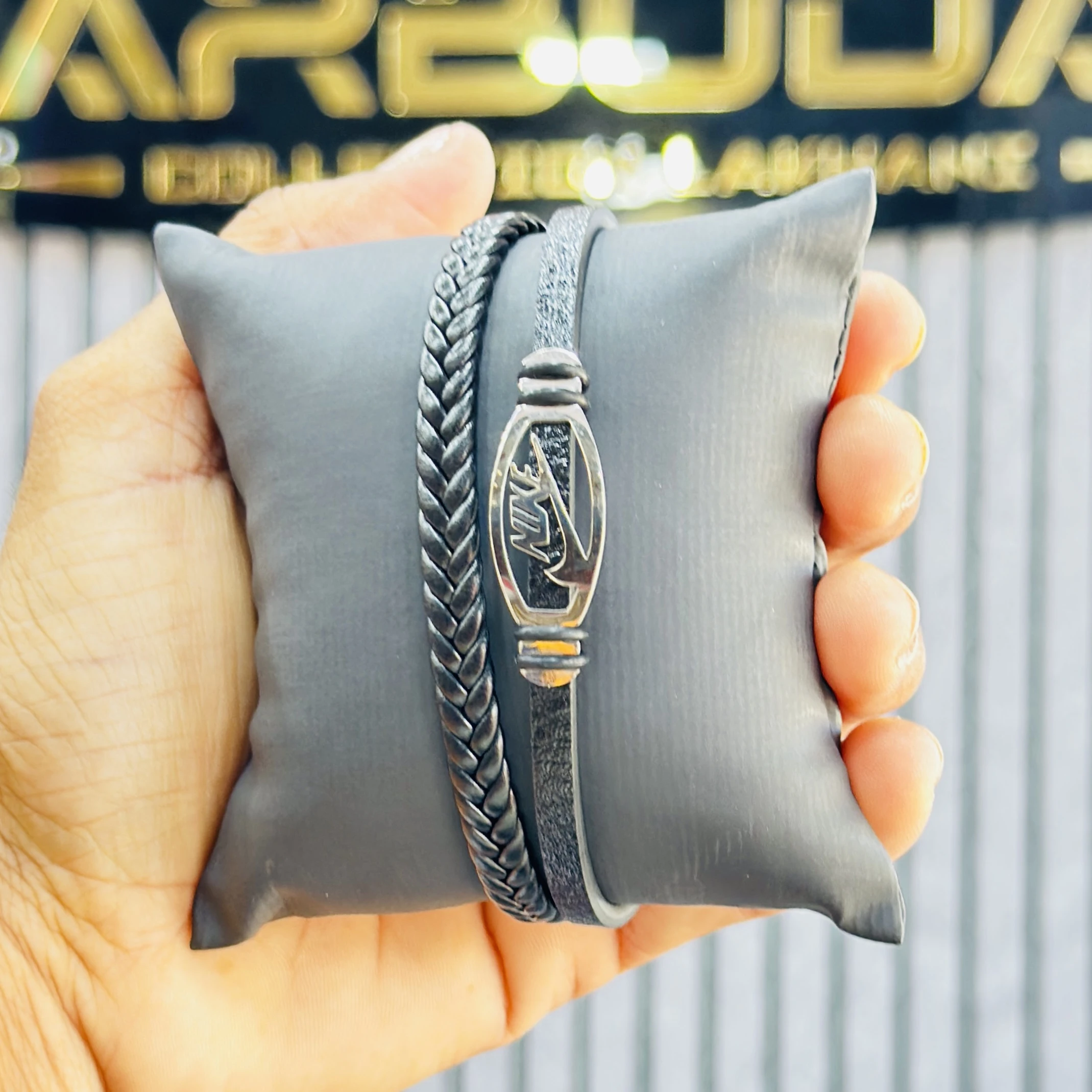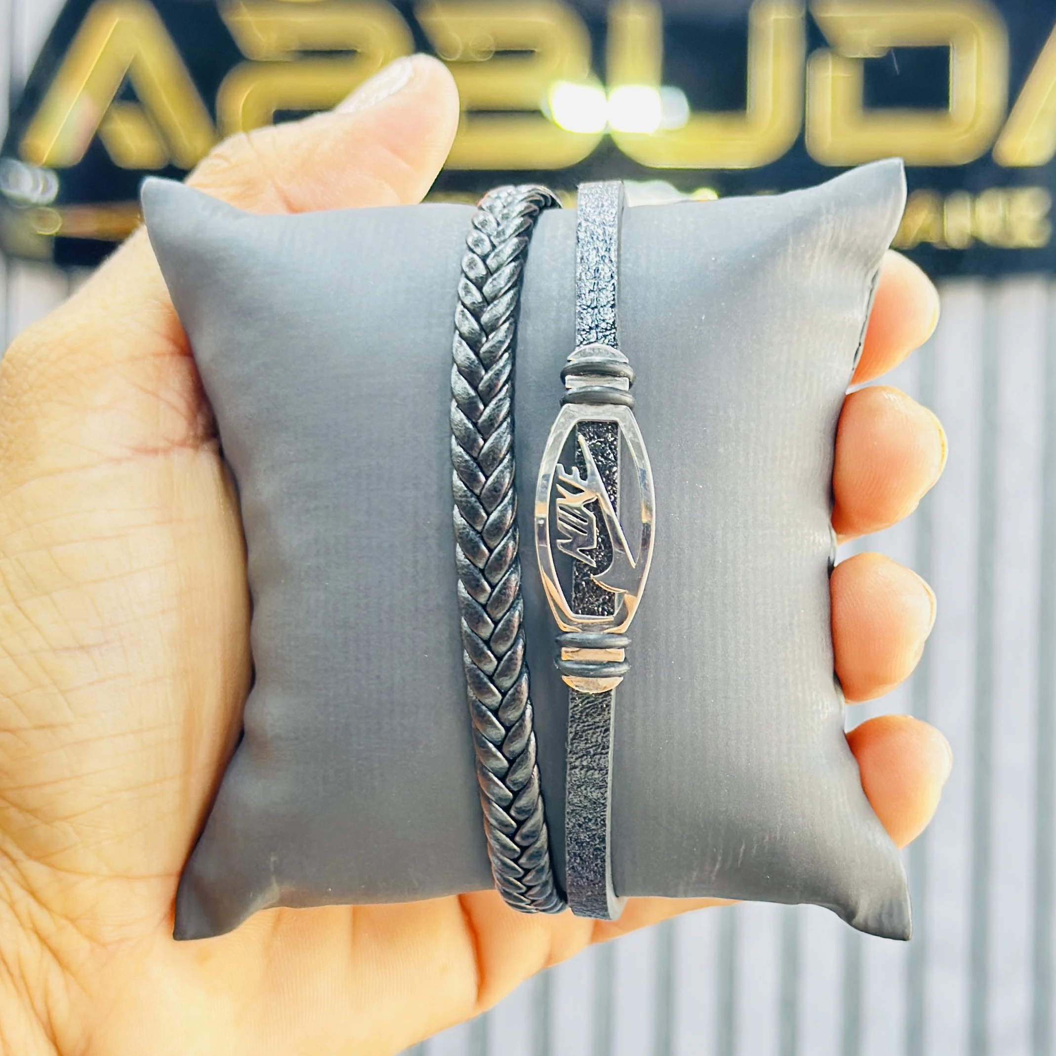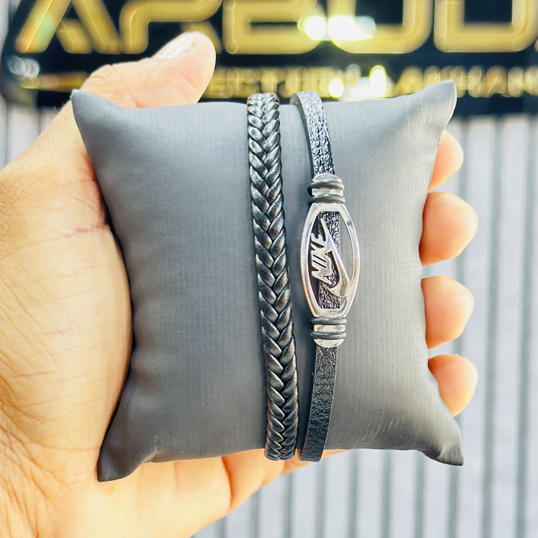 👉 Theme :- men's braided leather bracelet featuring a Nike branded metallic element.