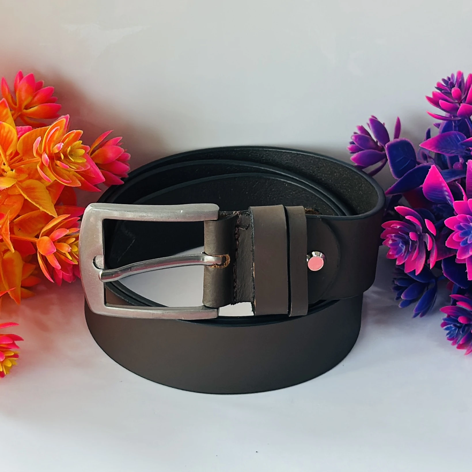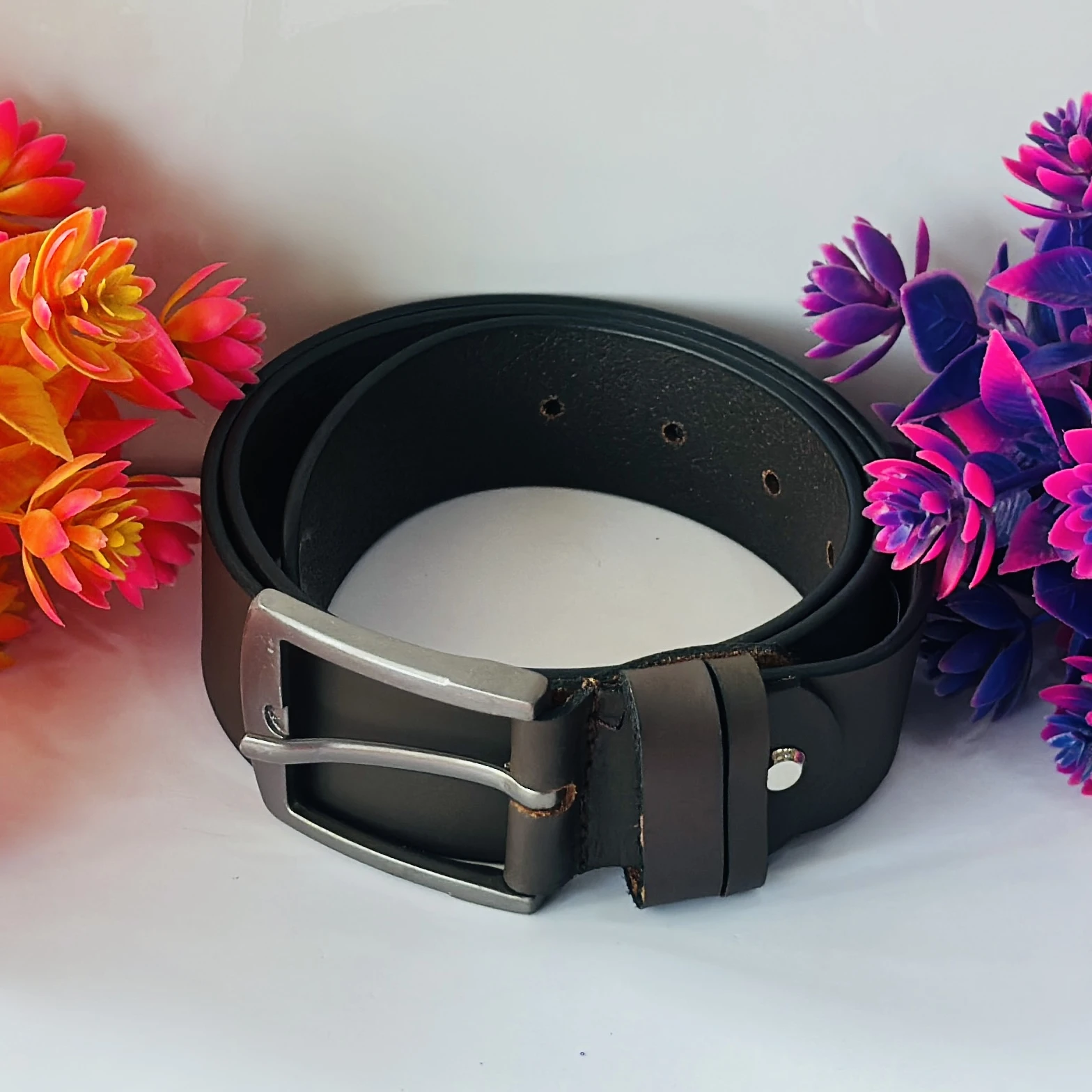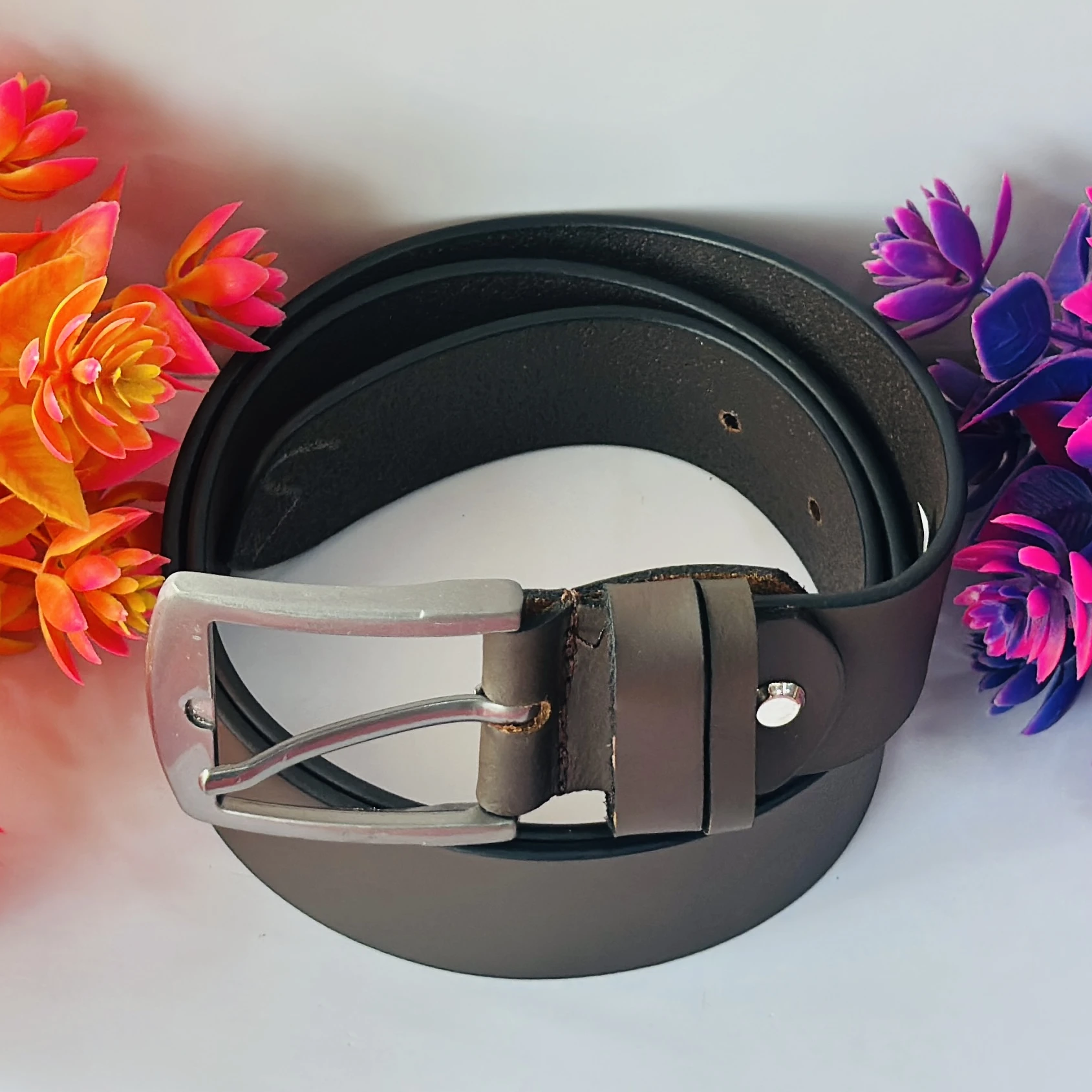 👉 Theme :- men's brown leather belt with a silver-tone buckle.