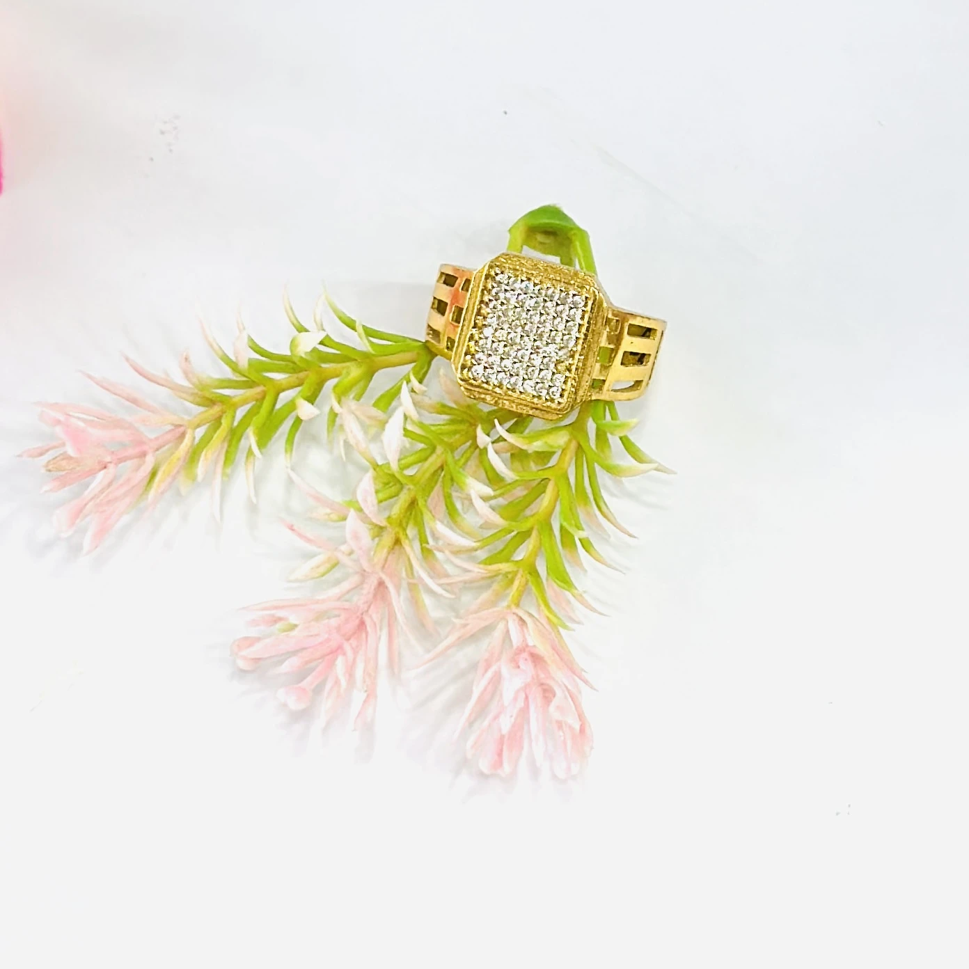👉 Theme :- Gold gent's ring with a textured design and diamond accents.