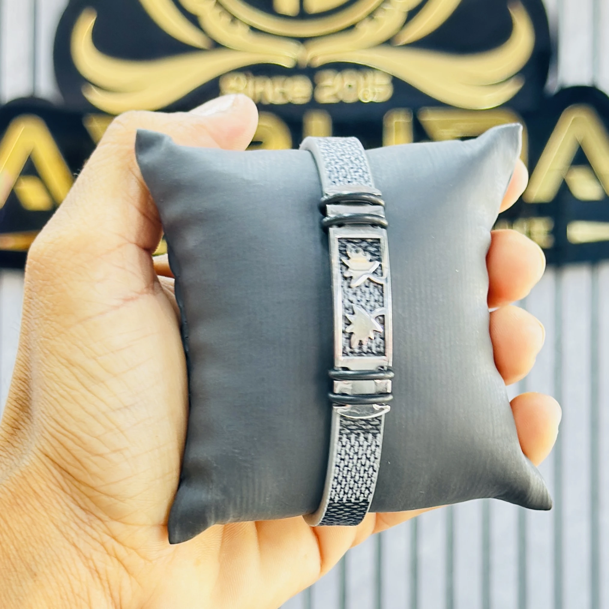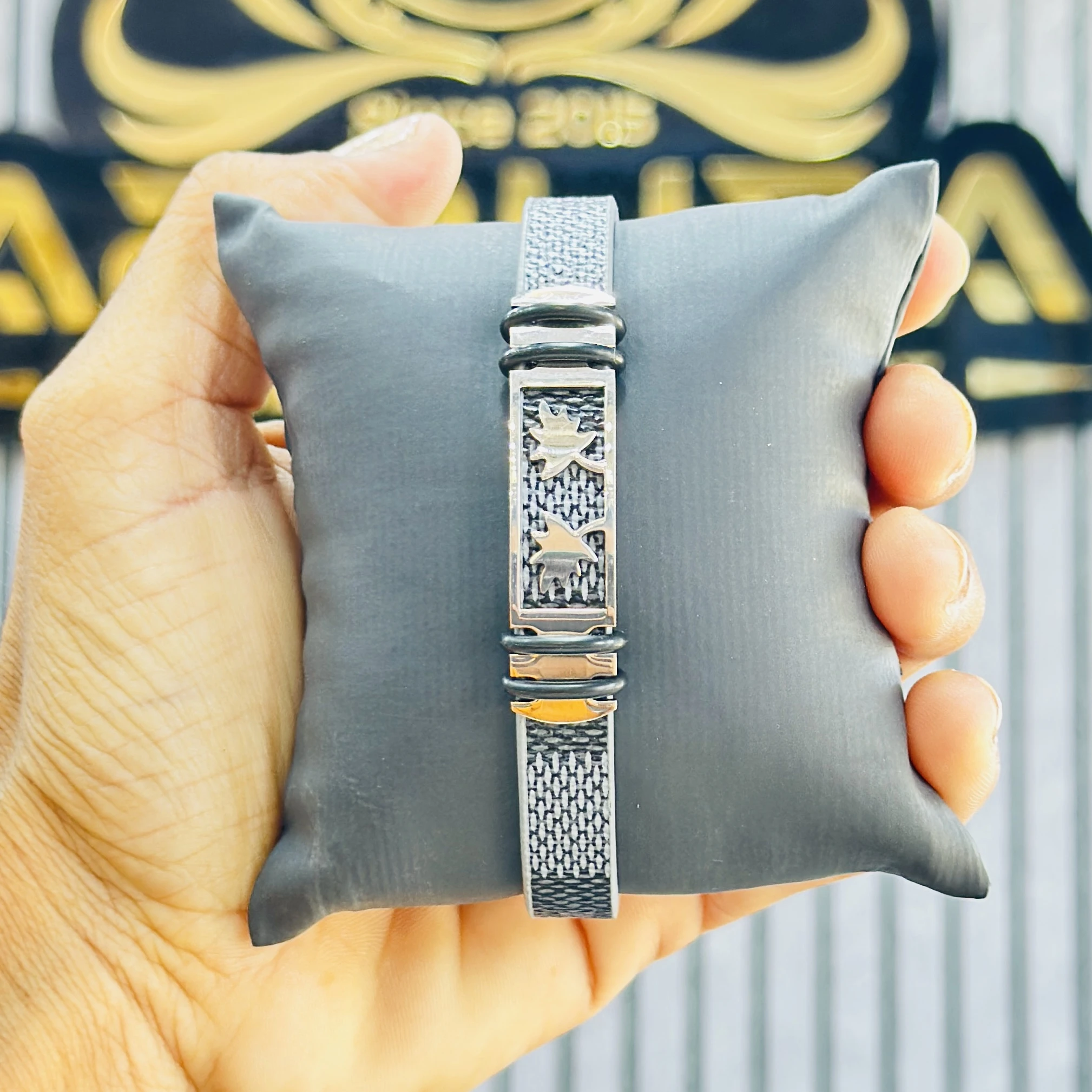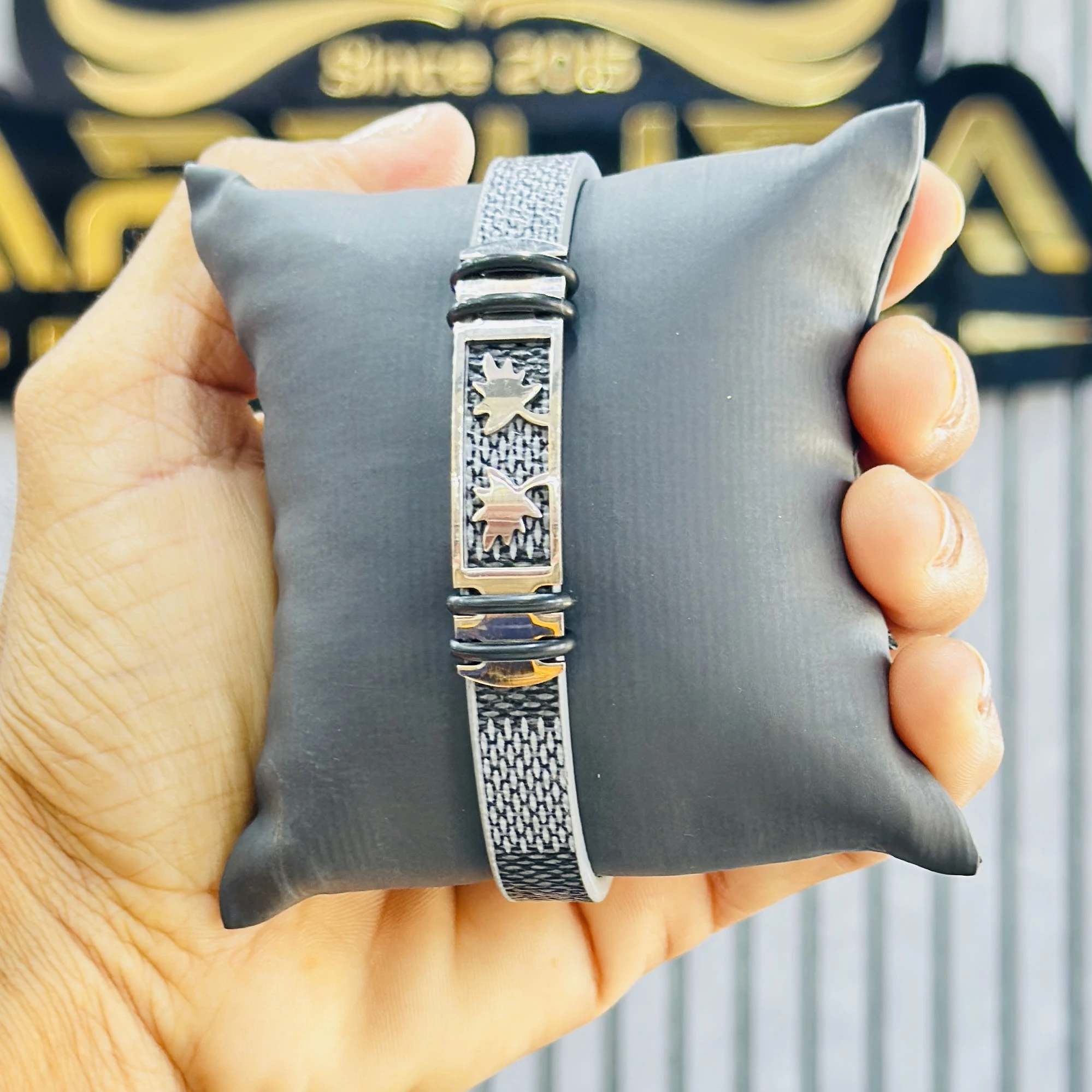 👉 Theme :- men's bracelet featuring a brown patterned leather strap and a silver-colored metal clasp.