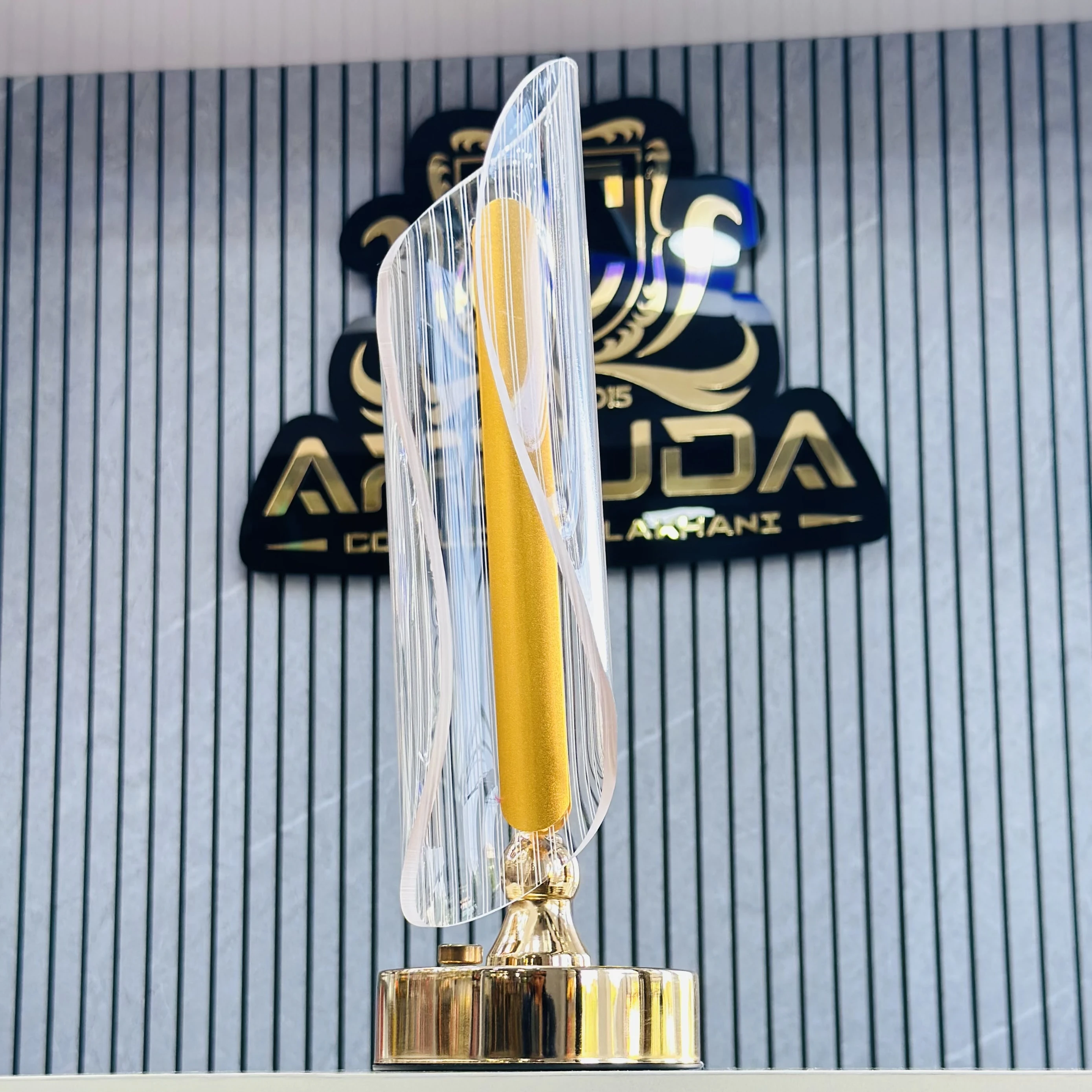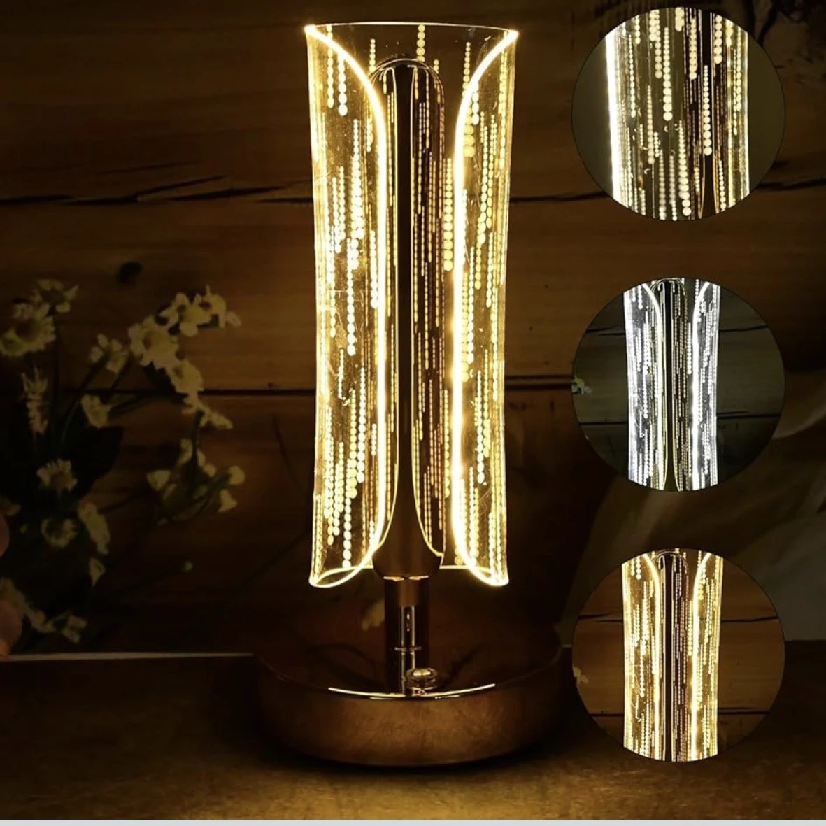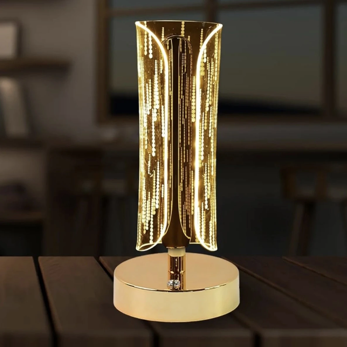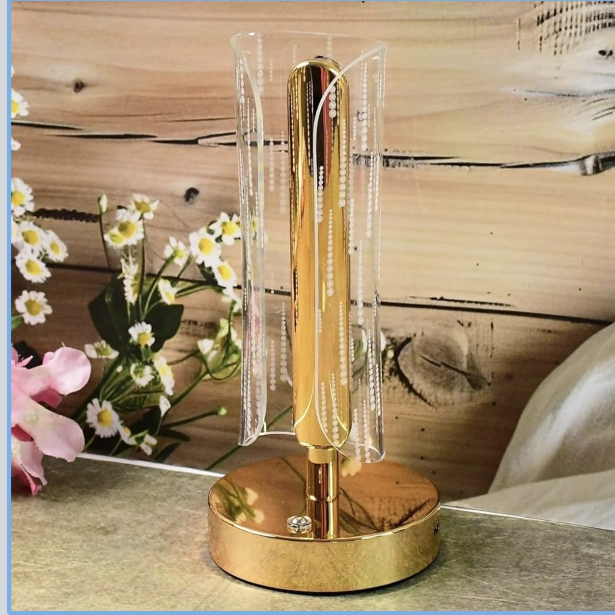 👉 Theme :- modern table lamp with a gold-toned base and a clear, ribbed acrylic shade