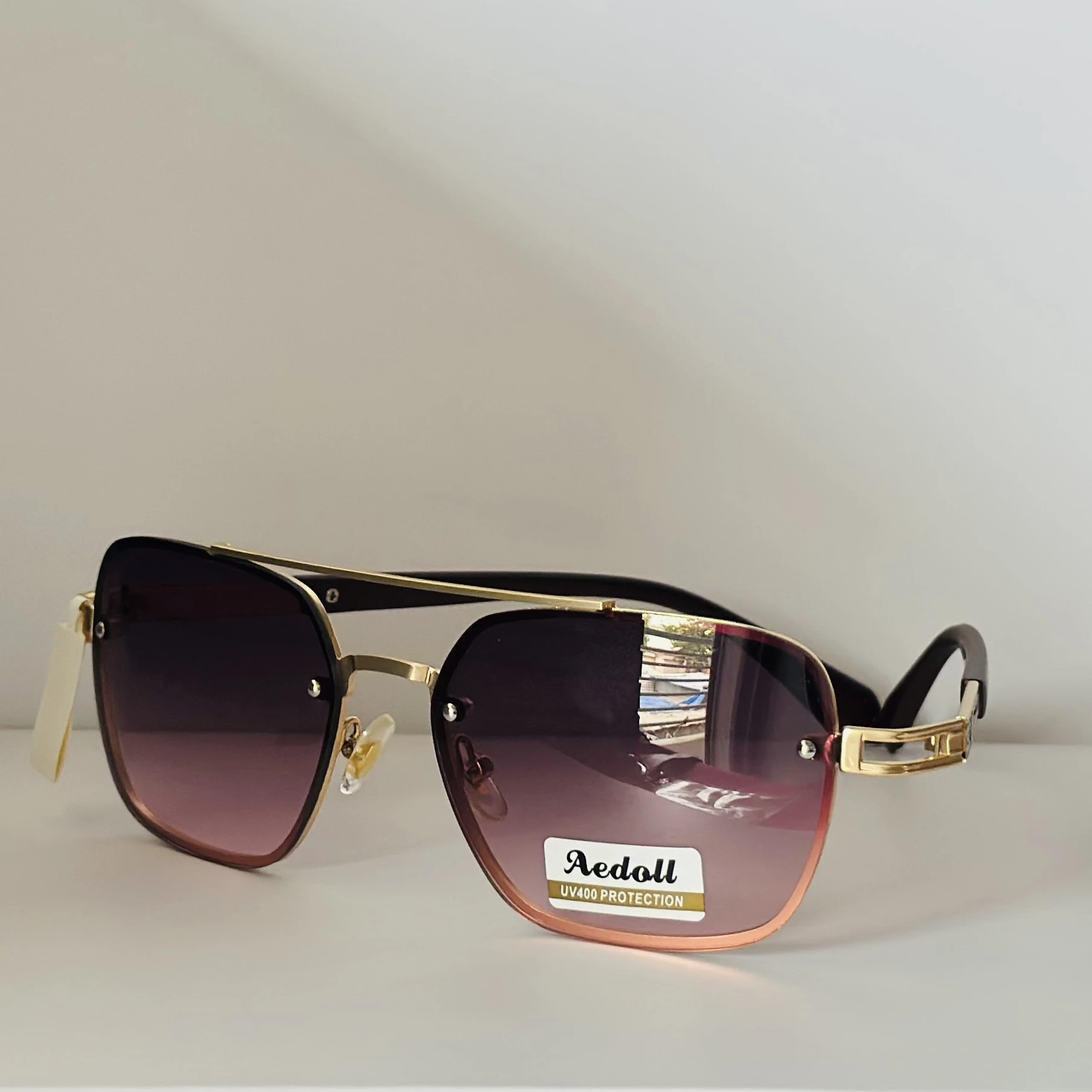 π Theme :- pair of Aedoll Goggle sunglasses with a gold metal frame and pink gradient lenses.