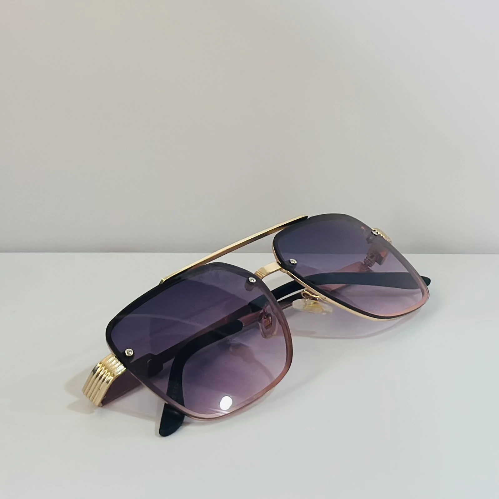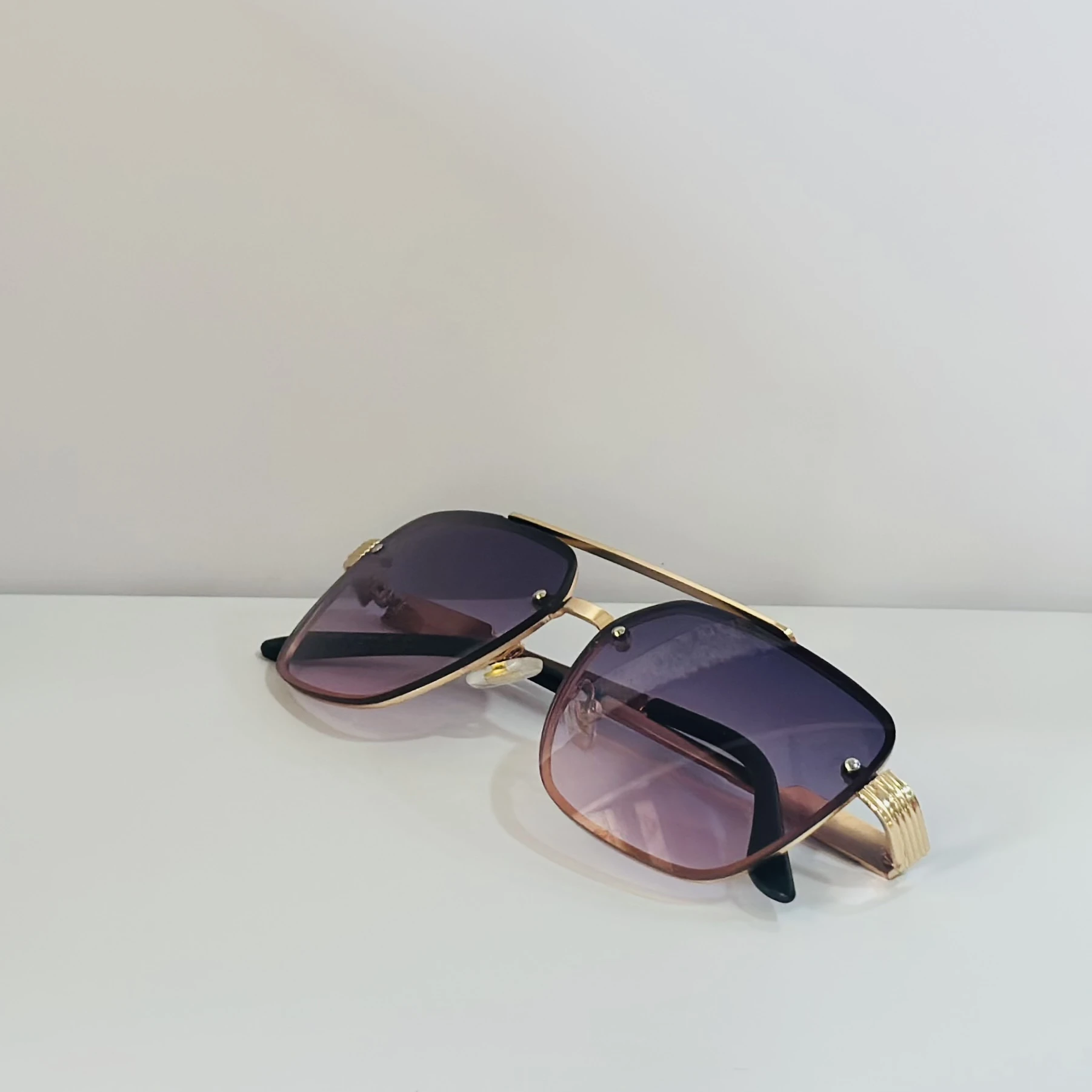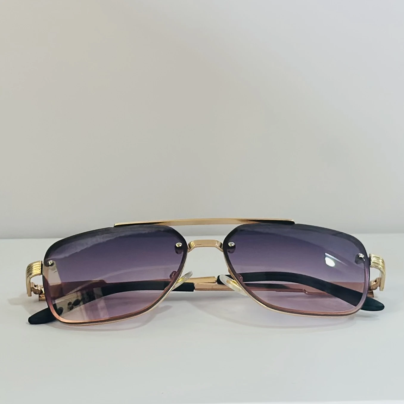 π Theme :- pair of fashionable sunglasses with a gold frame and purple gradient lenses.