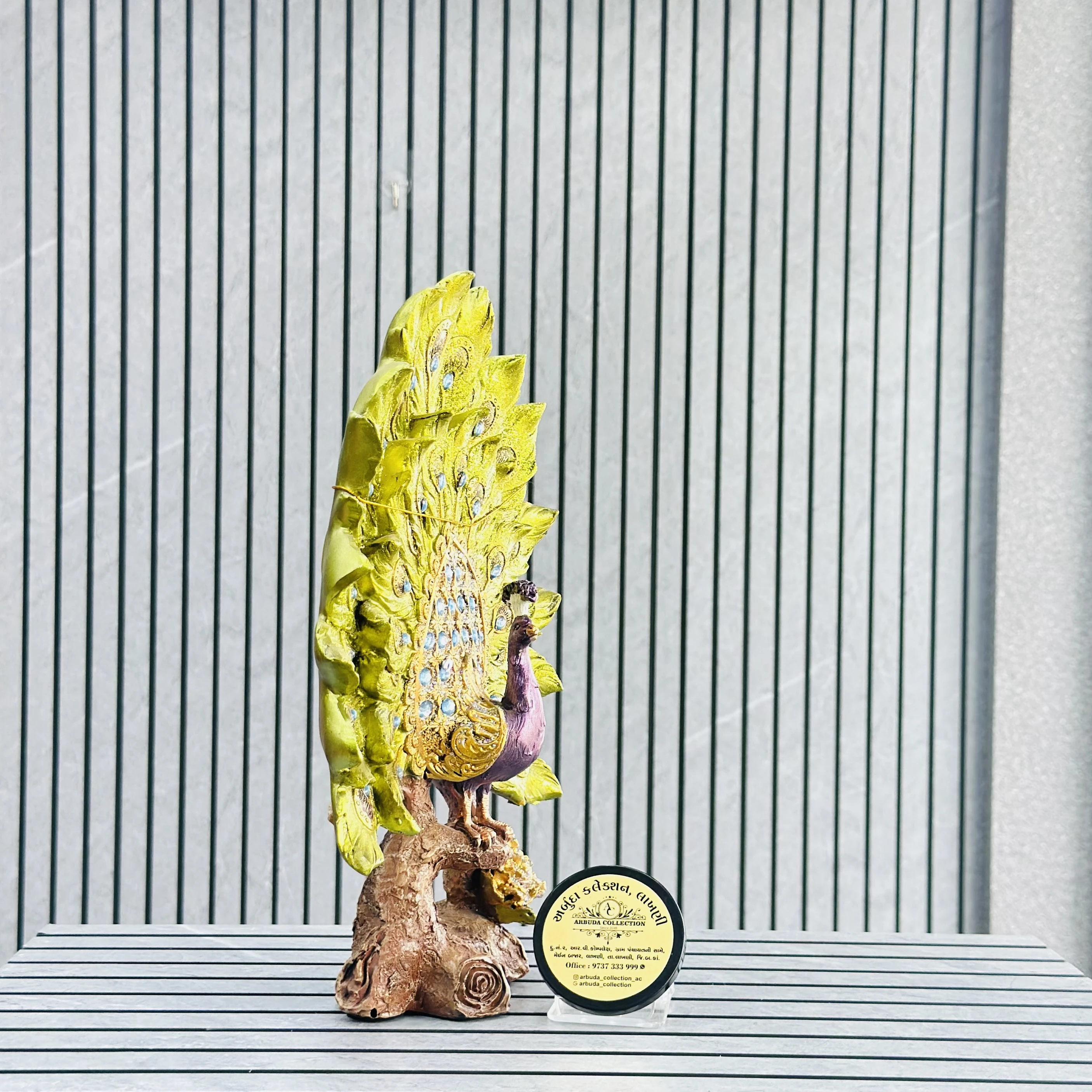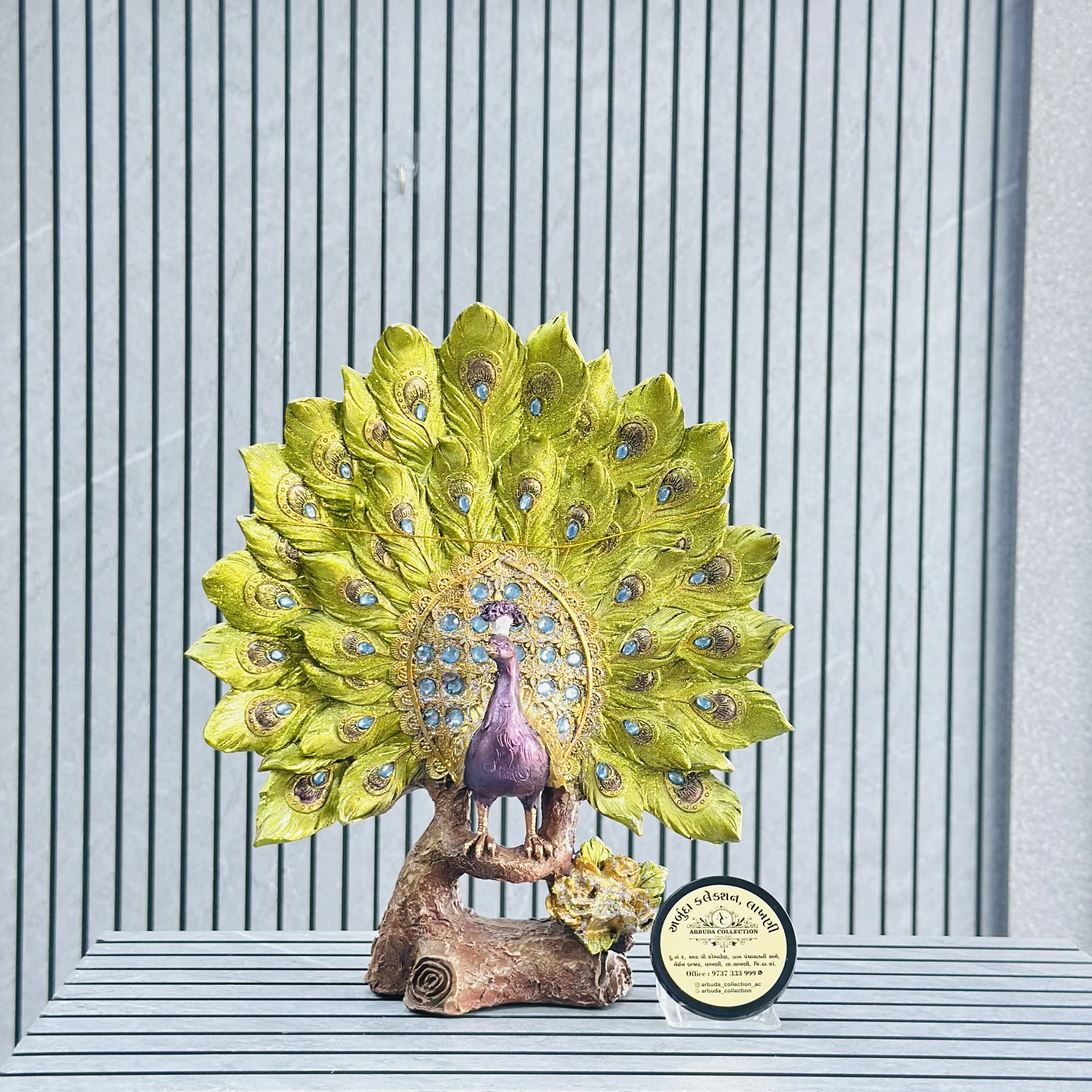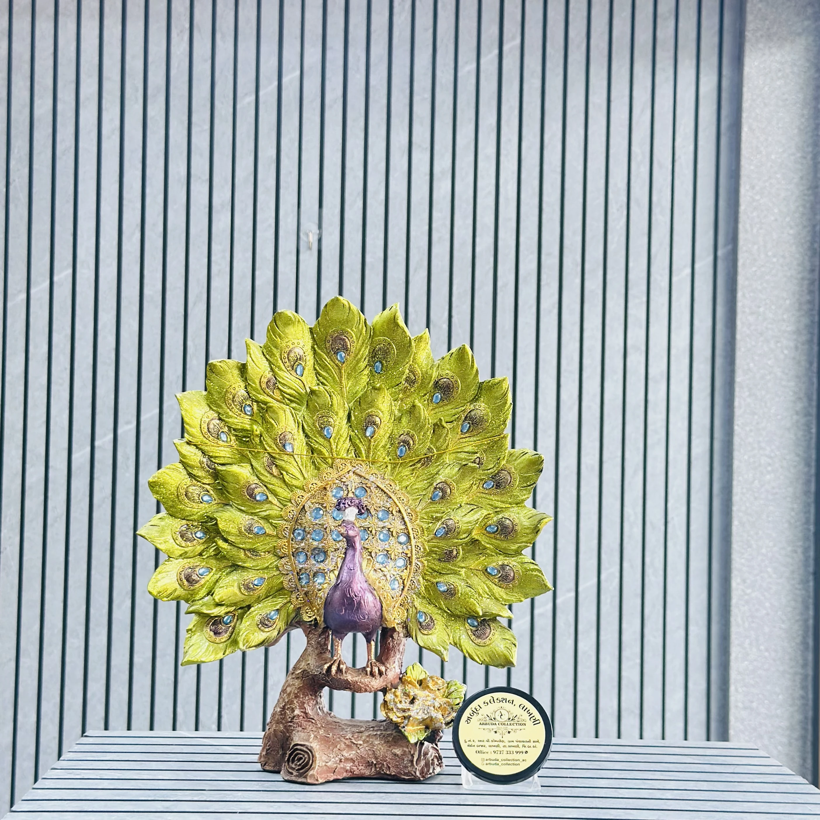 *✅ ARBUDA COLLECTION ✅* *✅9737333999✅* Theme :- Peacock pride Showpiece Brand :- arbuda collection lakhani Colour:- mixed Style:- Designer Fancy look Material:- decorative sculpture Dimensions :- 10 hight, 3 width Uses :- peacock statue table decor, crafted from resin and featuring a majestic peacock with a glittering tail Cleaning:- wipe clean with a dry cloth Origin:- made in India by local artists Other words:- limited addition…