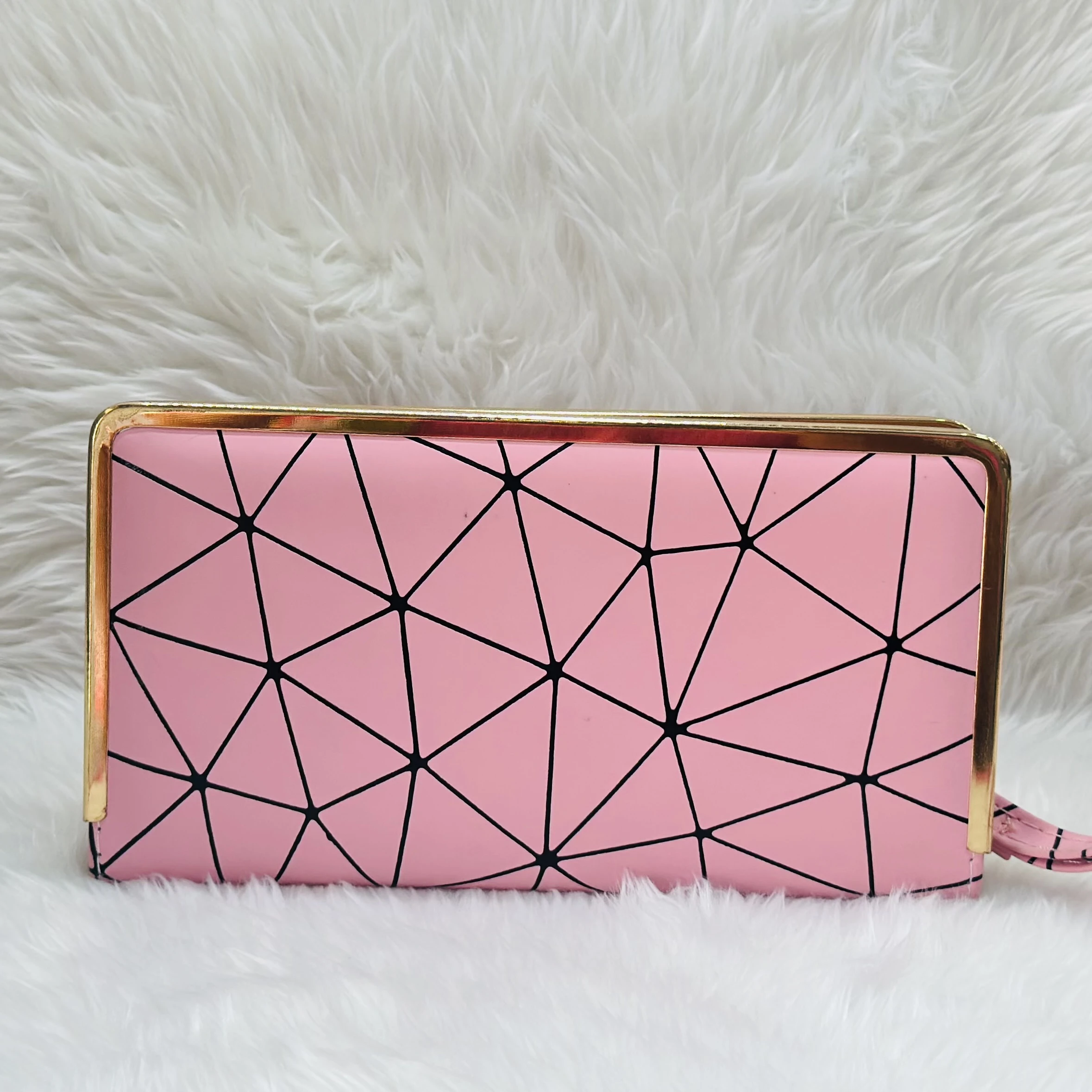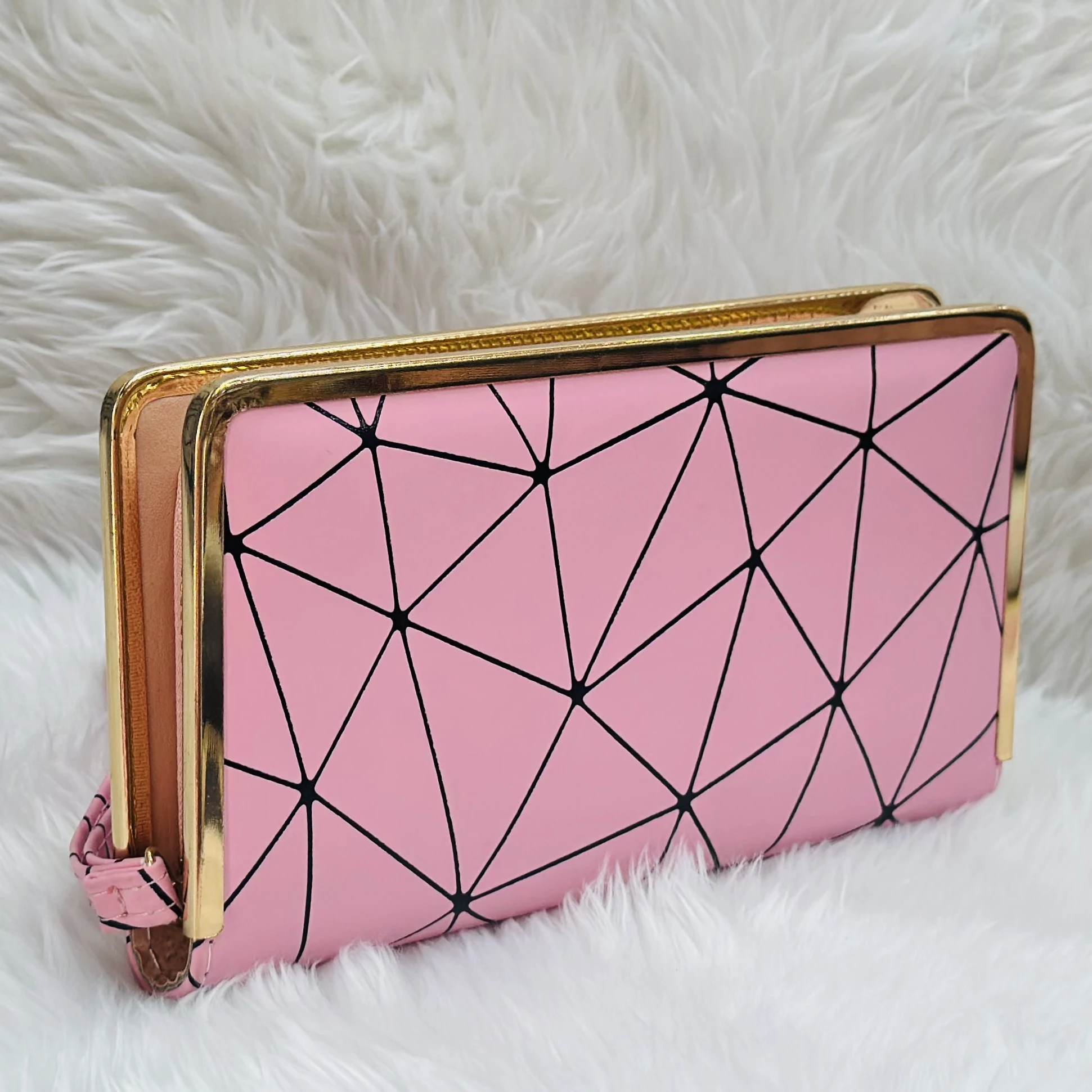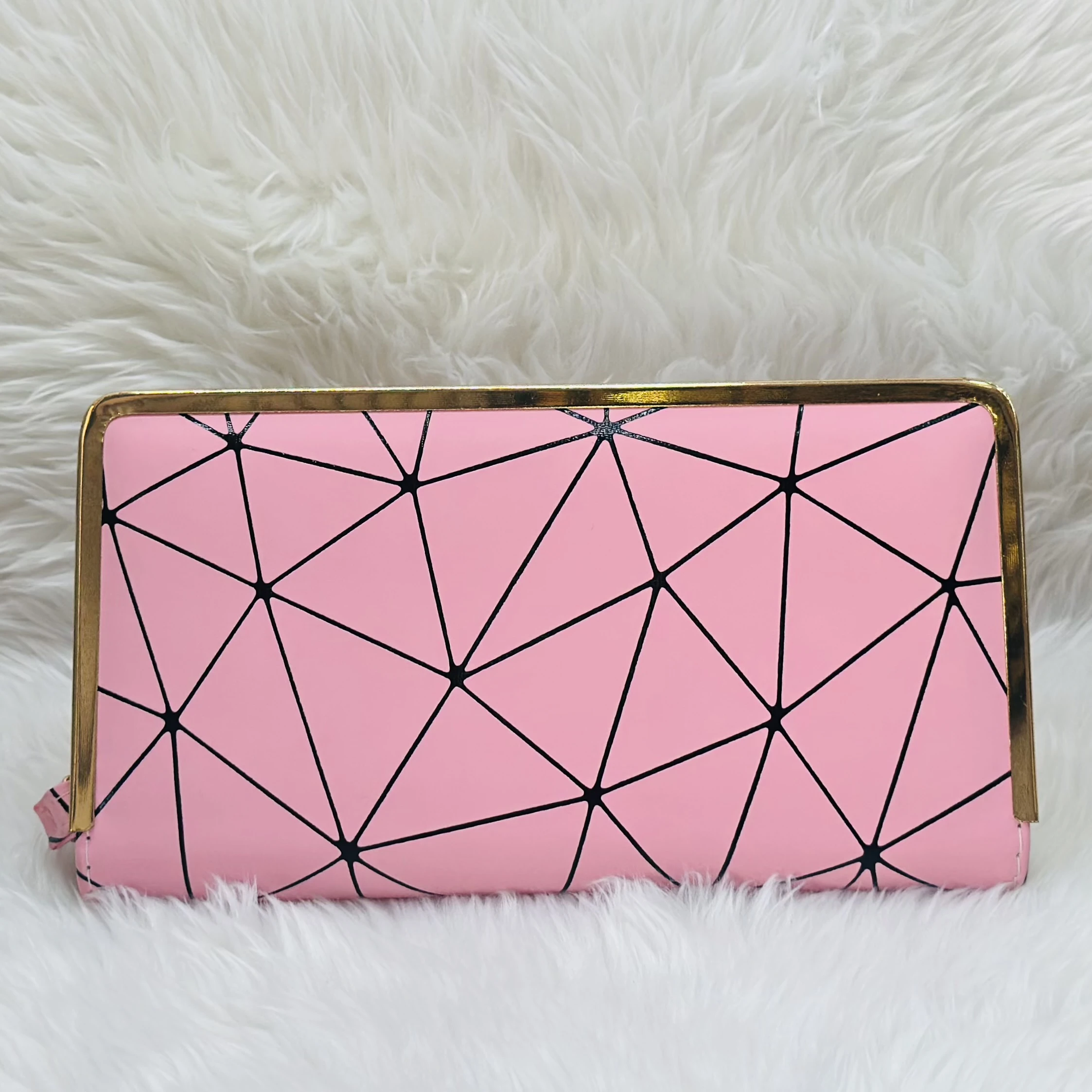 π Theme :- pink cosmetic bag with a black geometric pattern and a gold clasp closure.