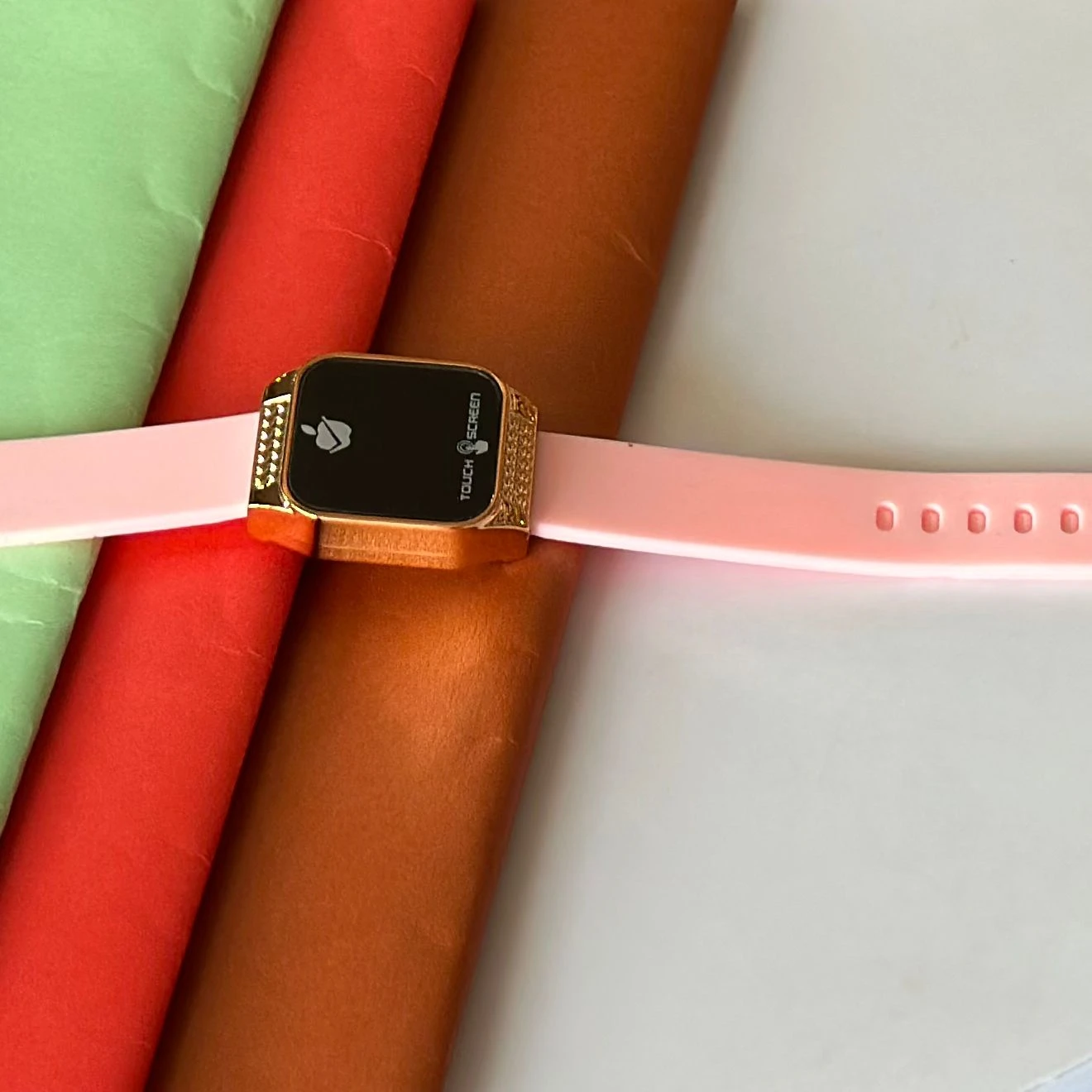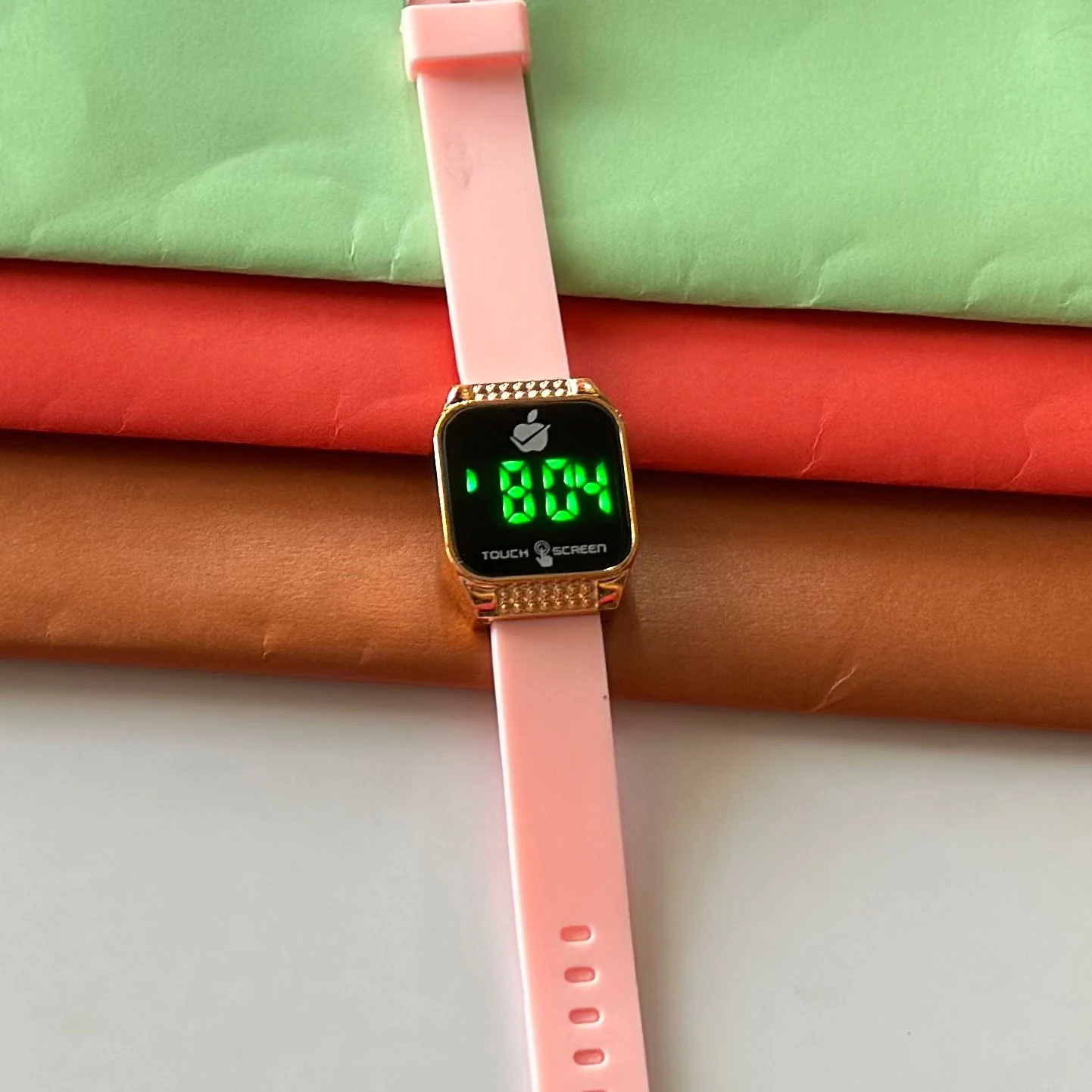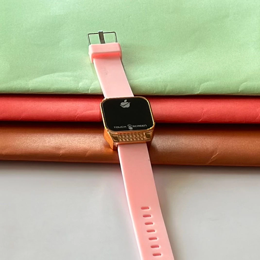 👉 Theme :- pink digital wristwatch with a pink silicone strap.