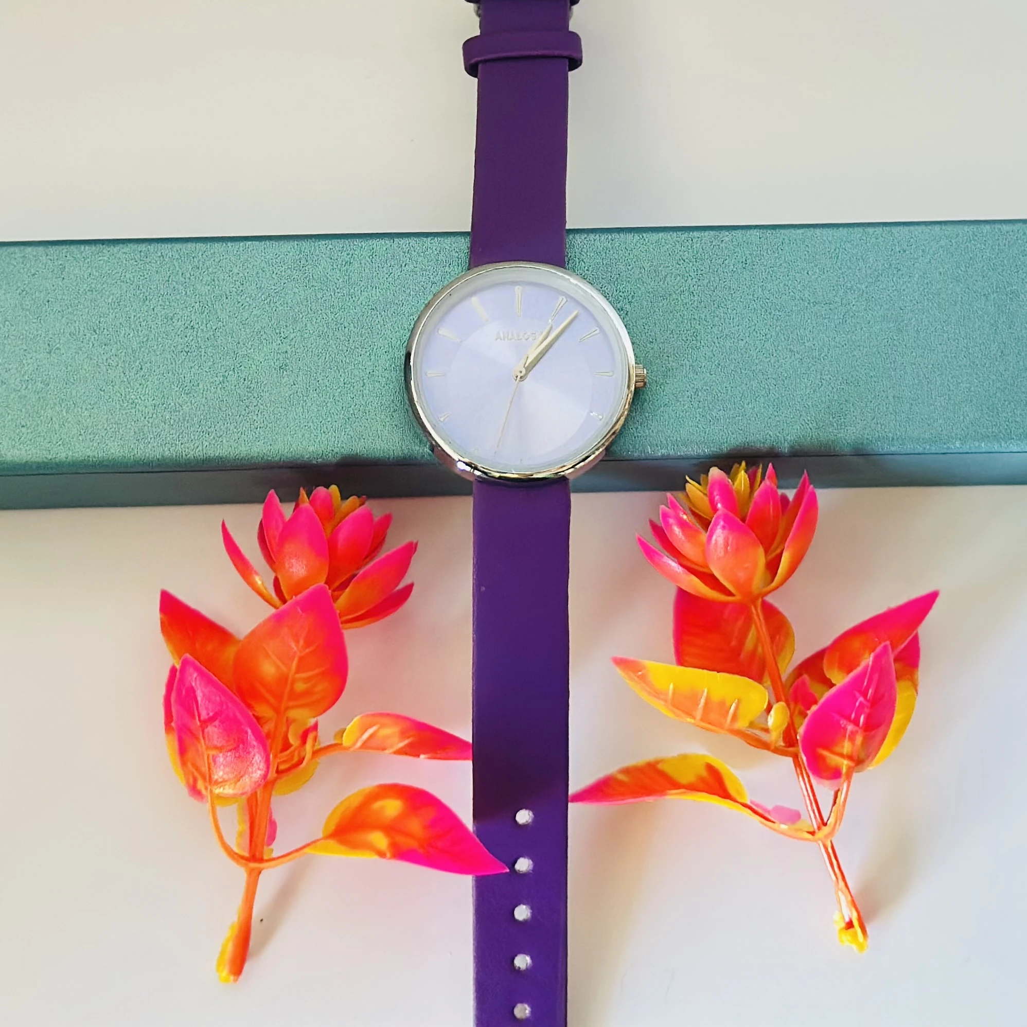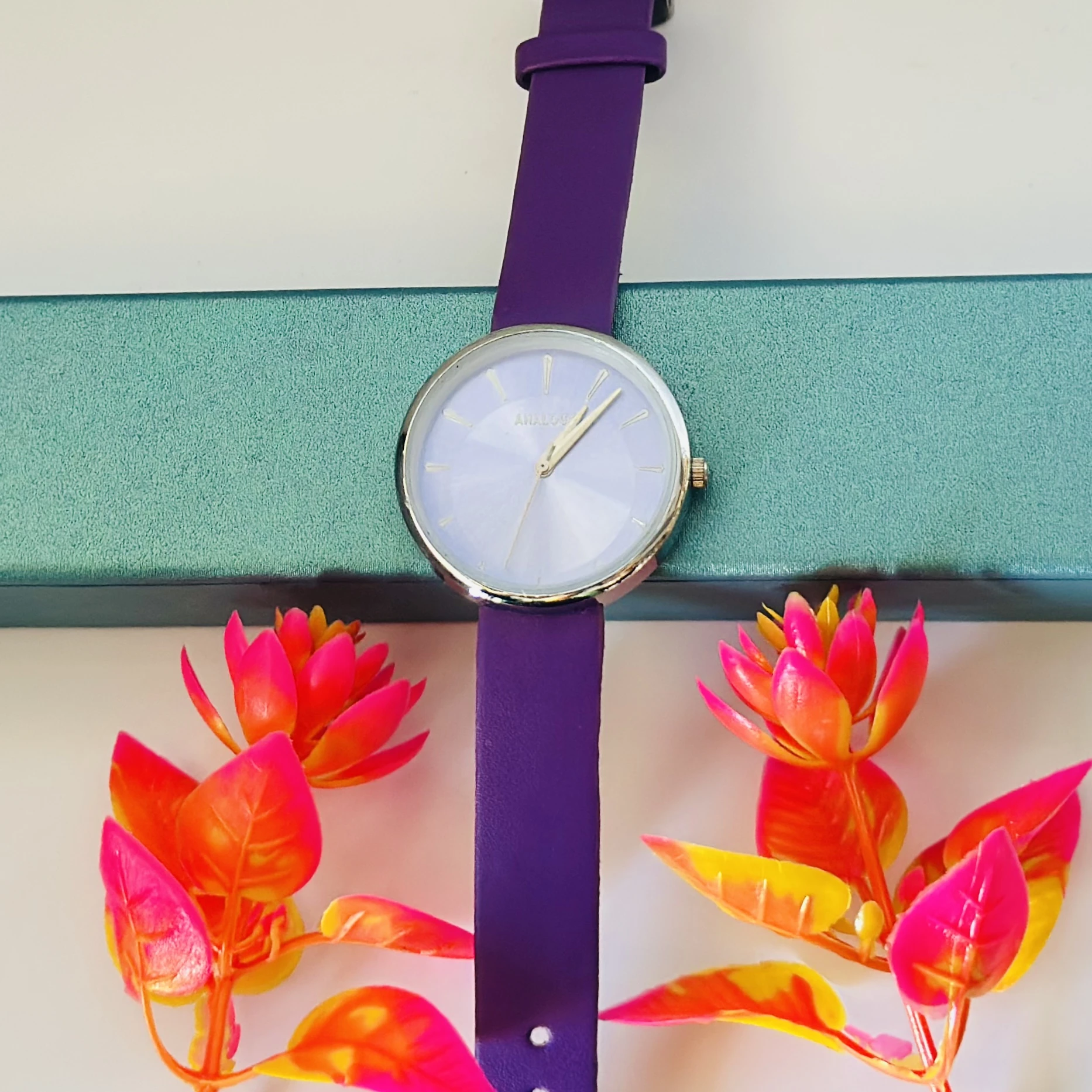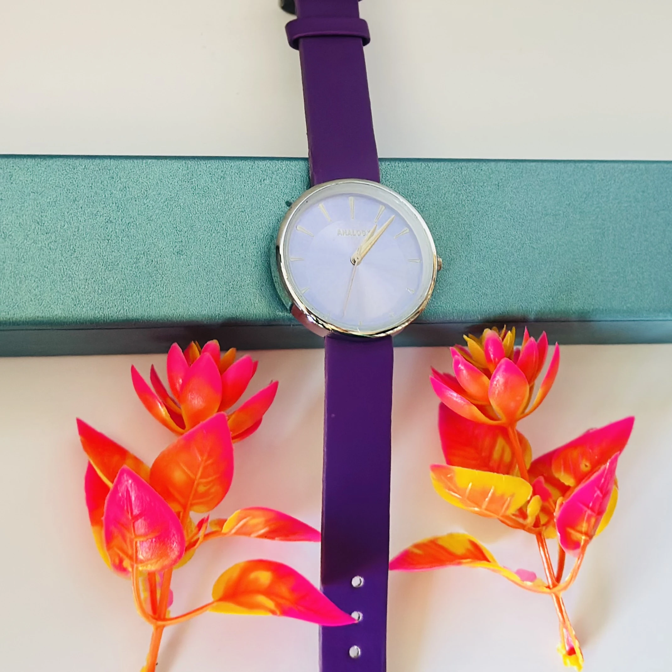 👉 Theme :- purple analog watch with a black leather strap.