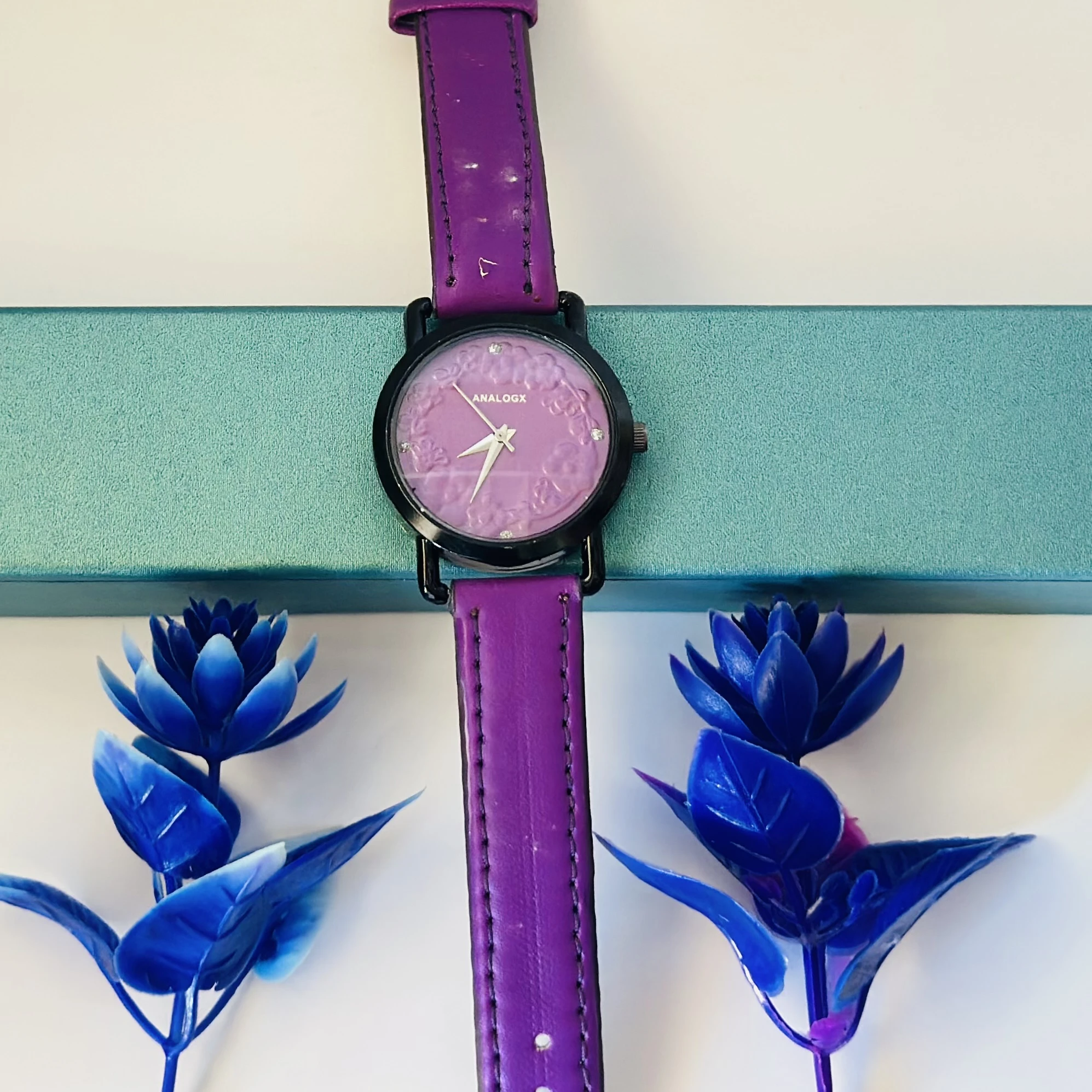 👉 Theme :- purple analog watch with a black leather strap.