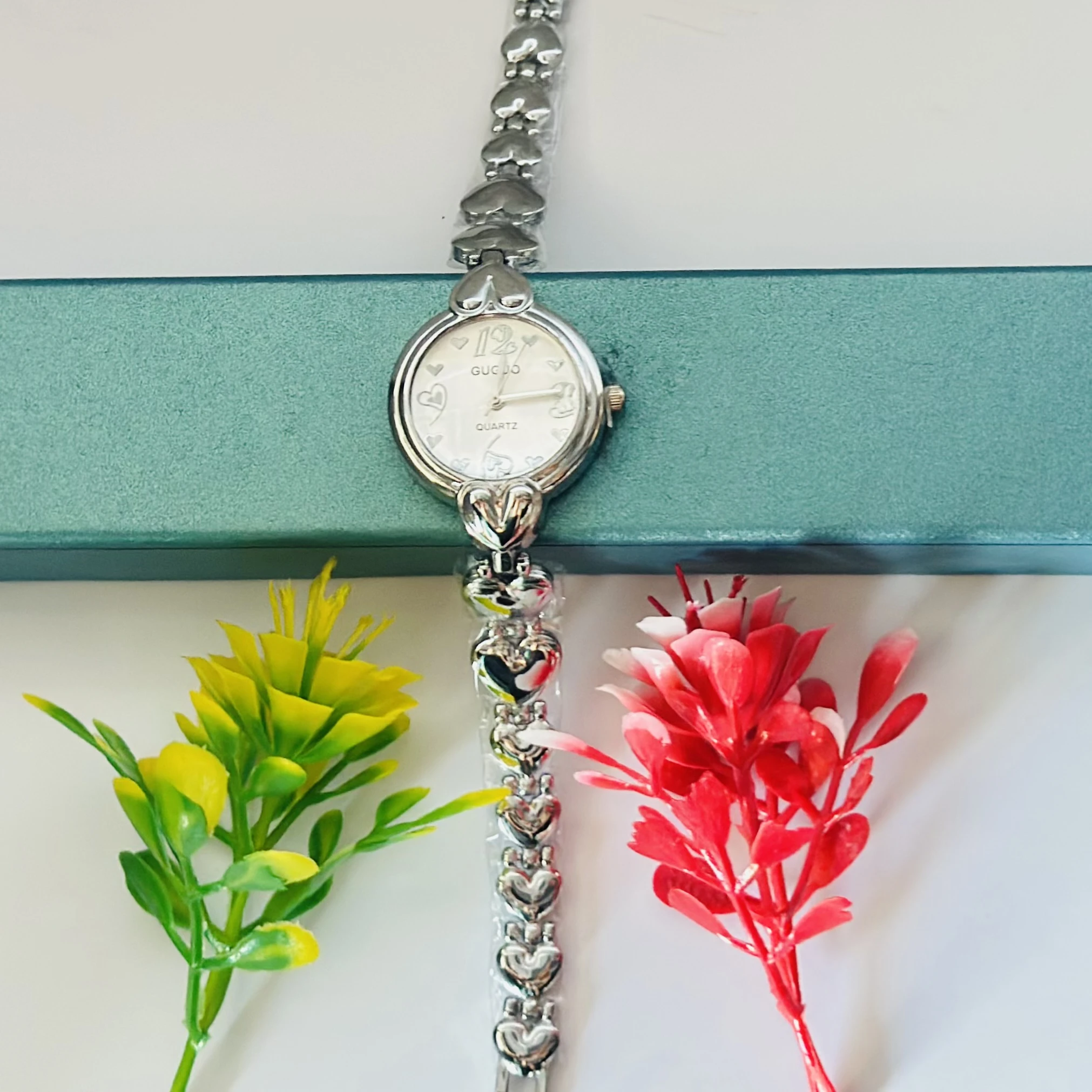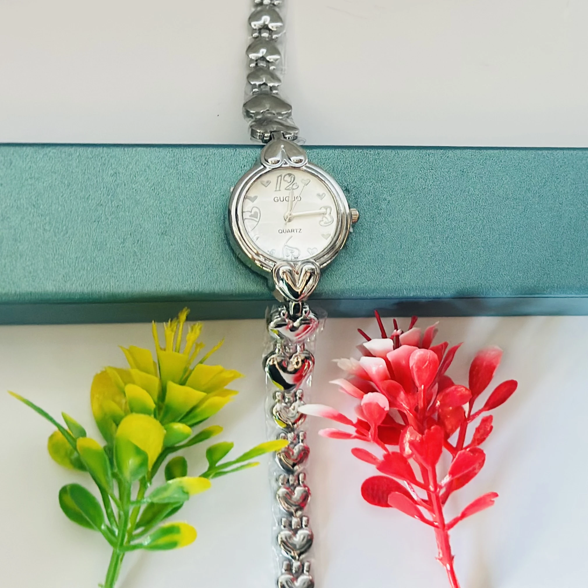👉 Theme :- Gucio Quartz analog watch for women with a silver heart-link bracelet.