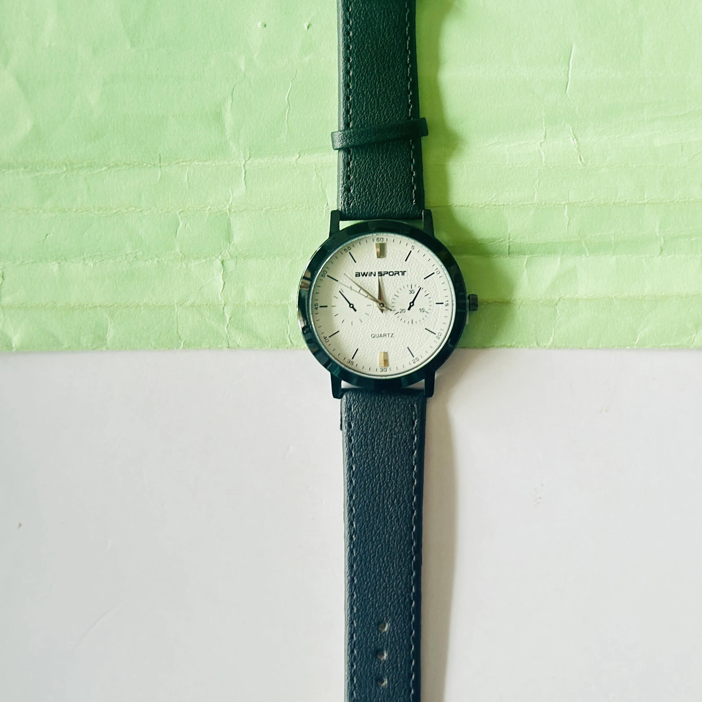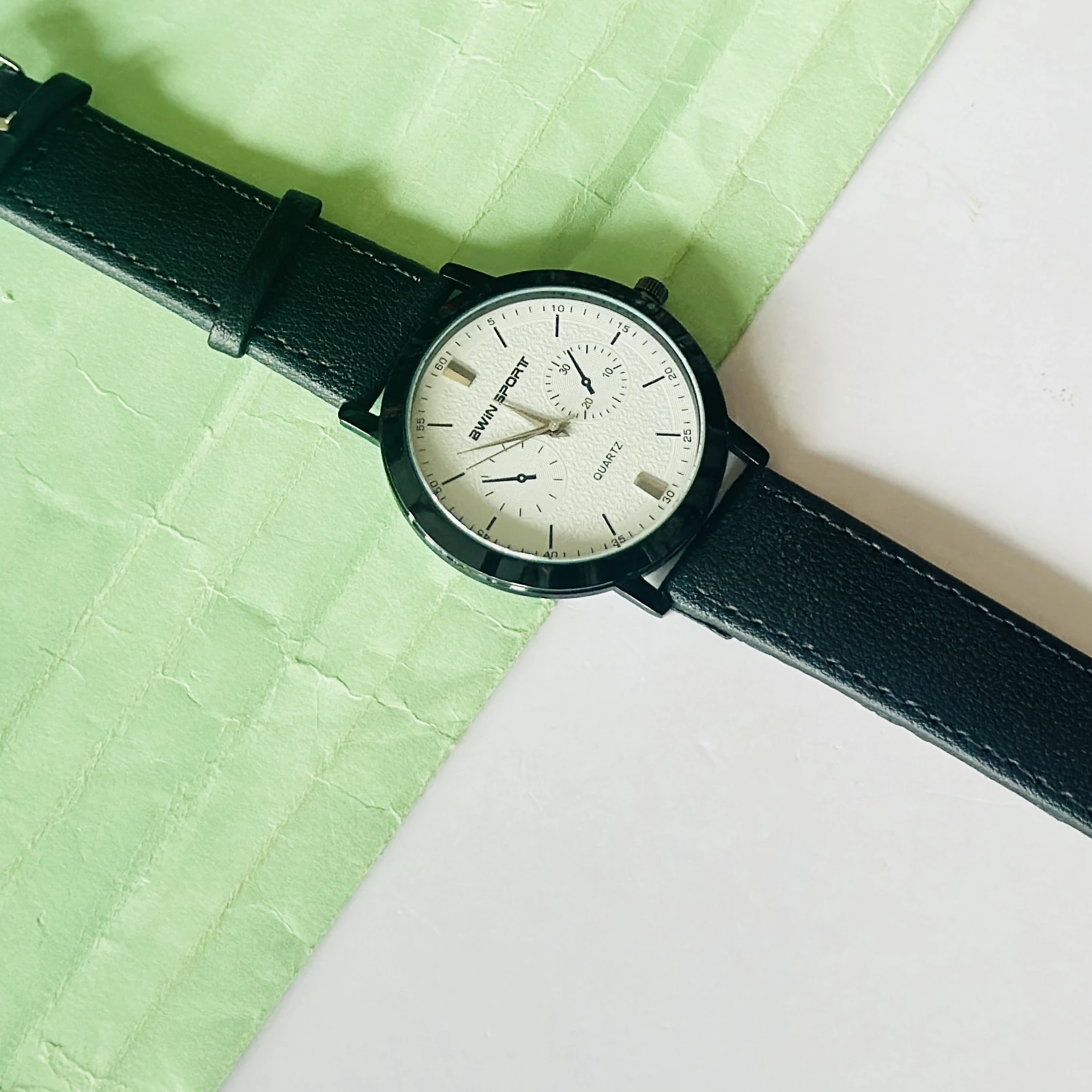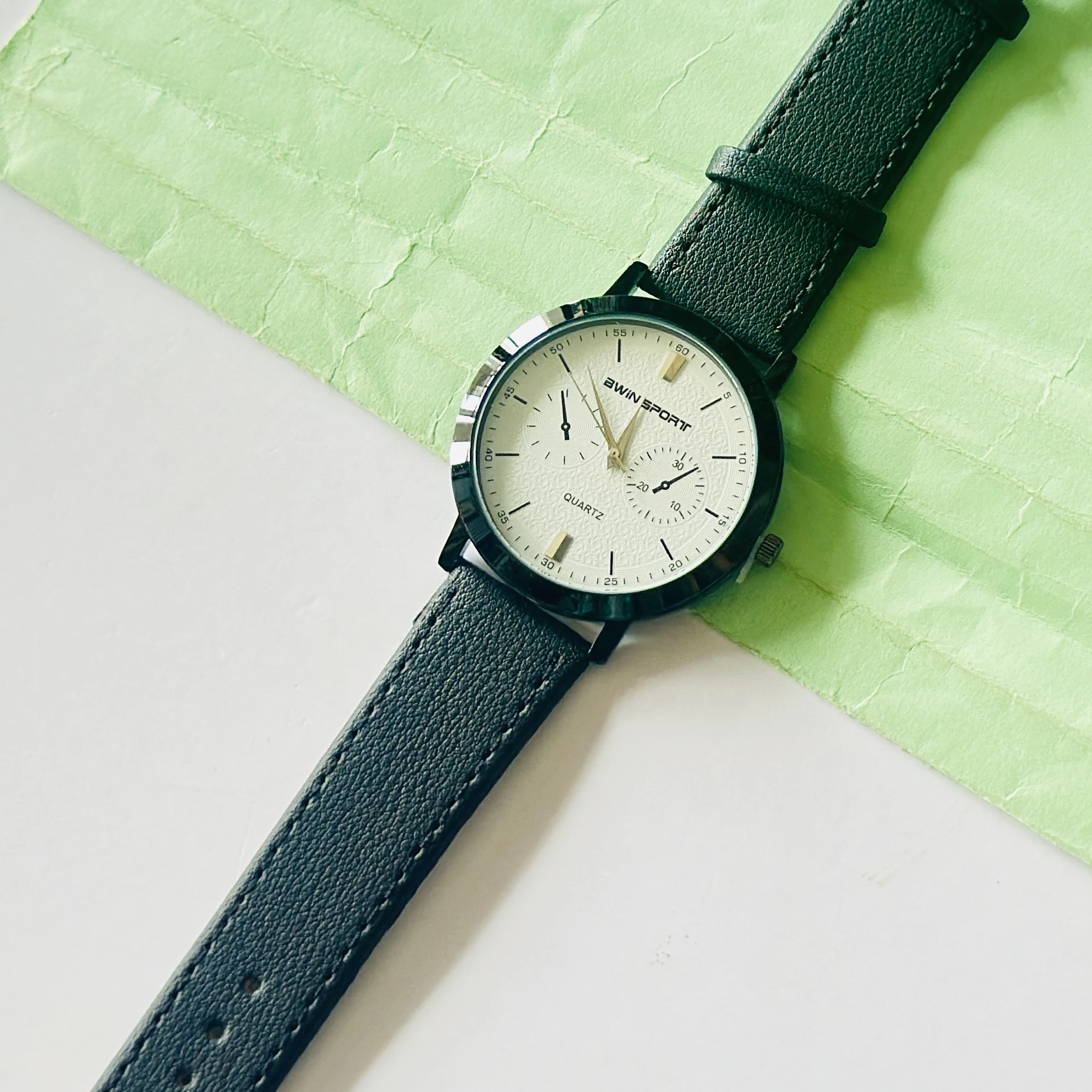 Quartz’s wristwatch featuring a white dial, black markers, and a matching black leather strap.