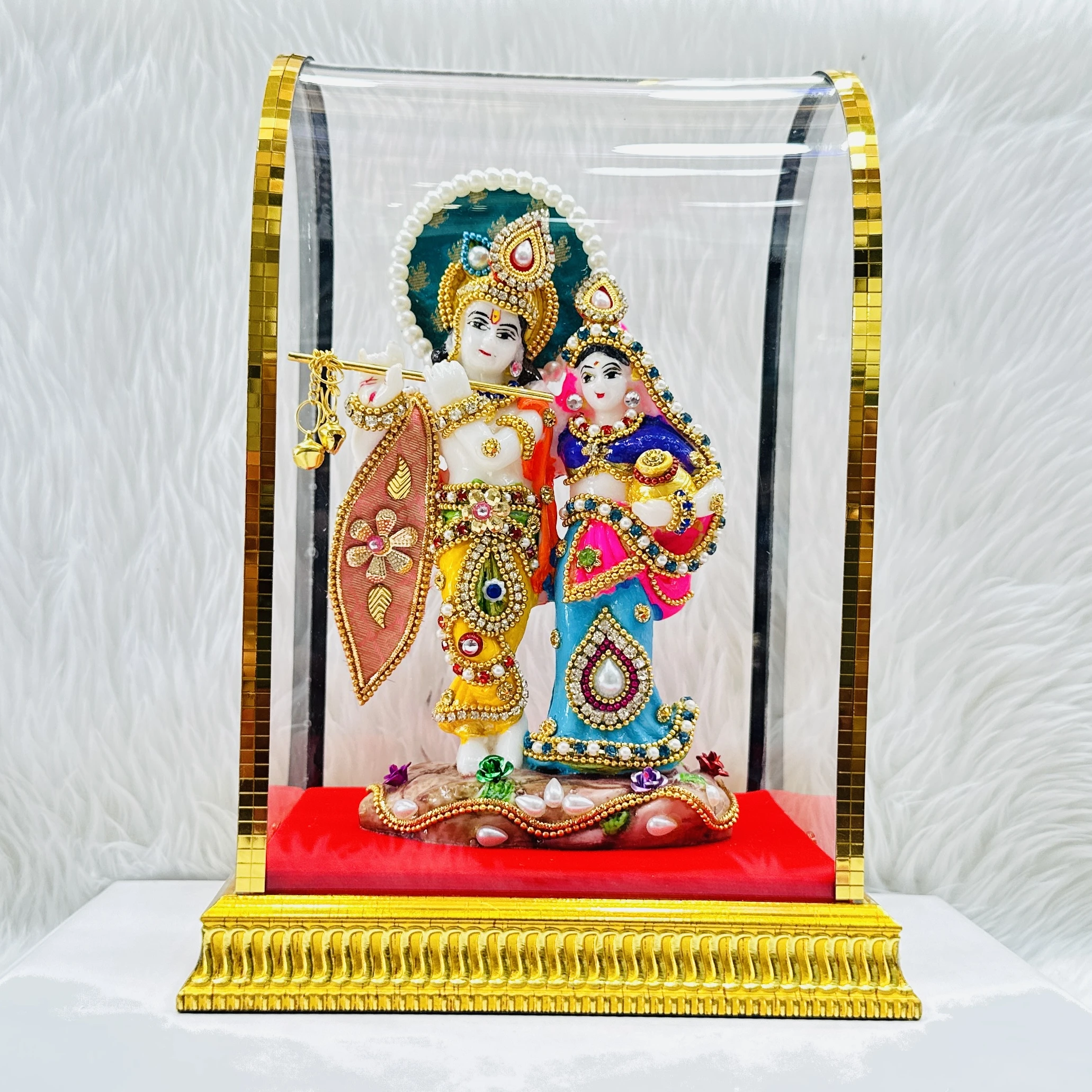 👉 Theme :- Radha Krishna statue enclosed in a protective glass case.