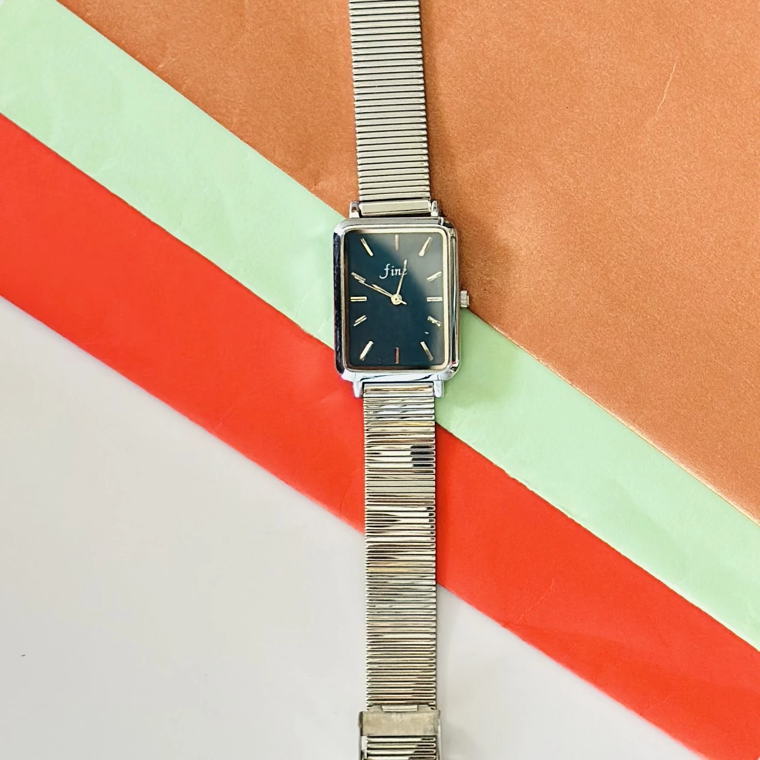 👉 Theme :- rectangular-dial analog watch with a mesh strap.