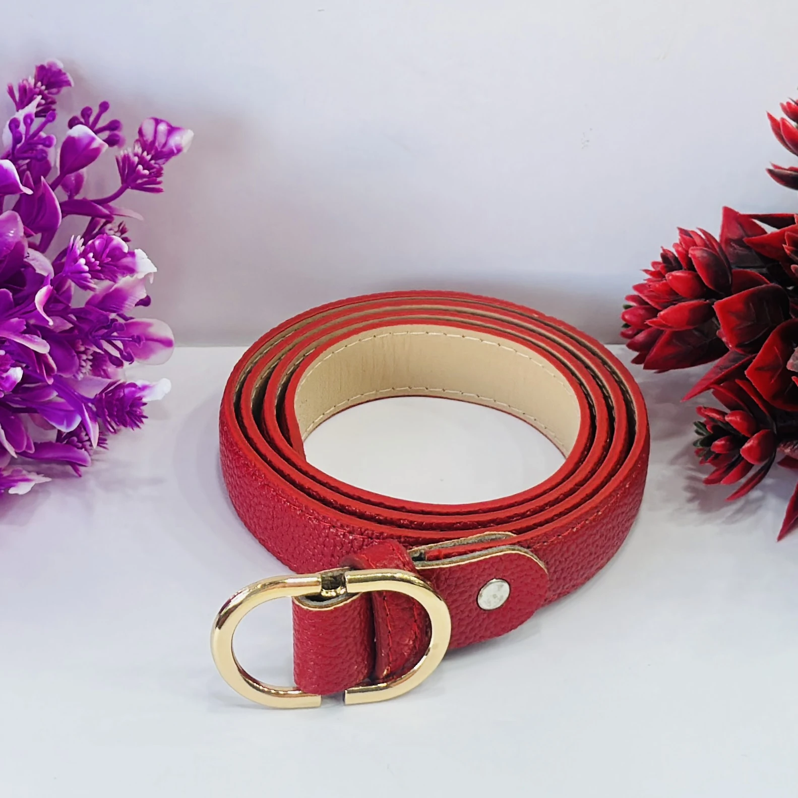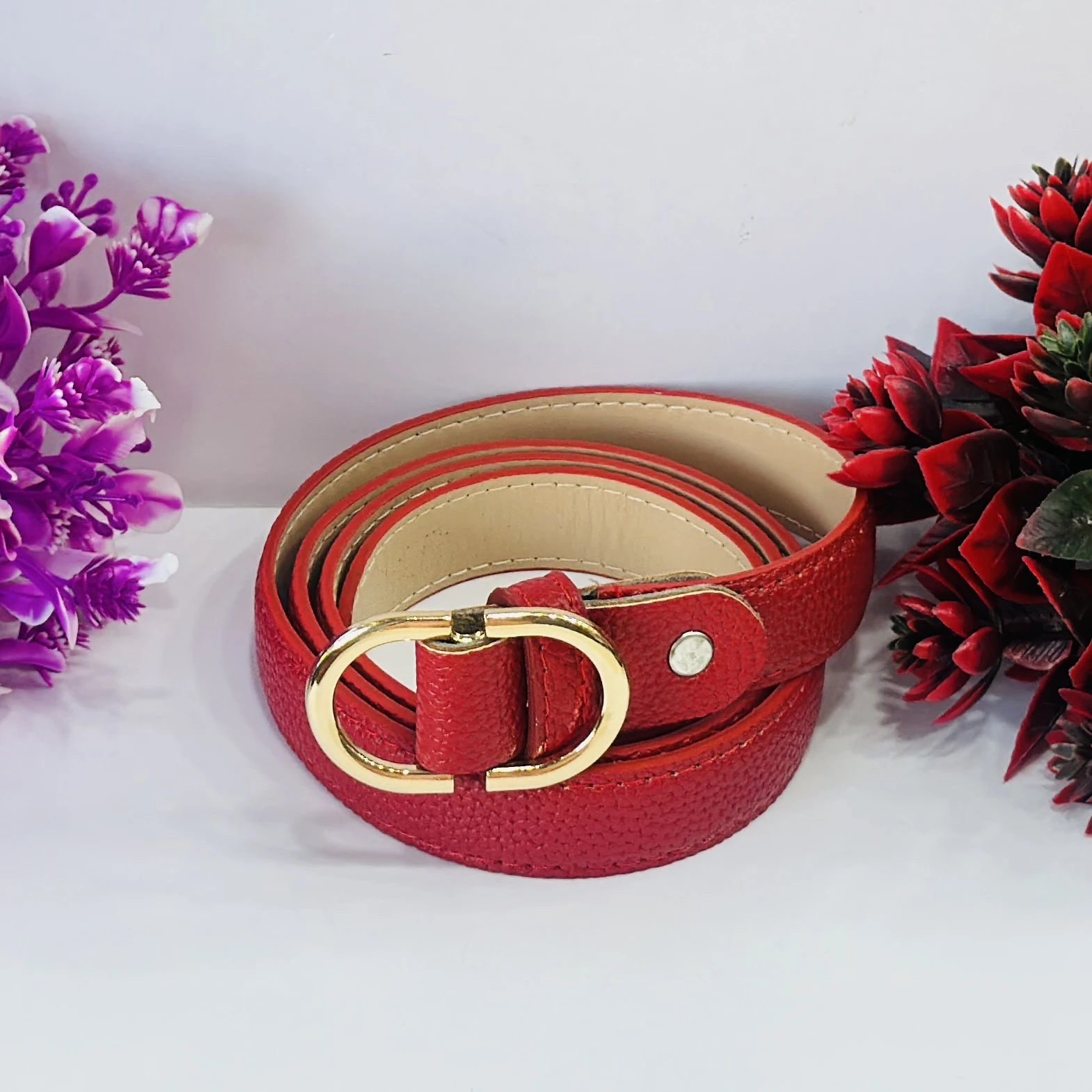 👉 Theme :- Red leather belt with a gold-colored buckle.