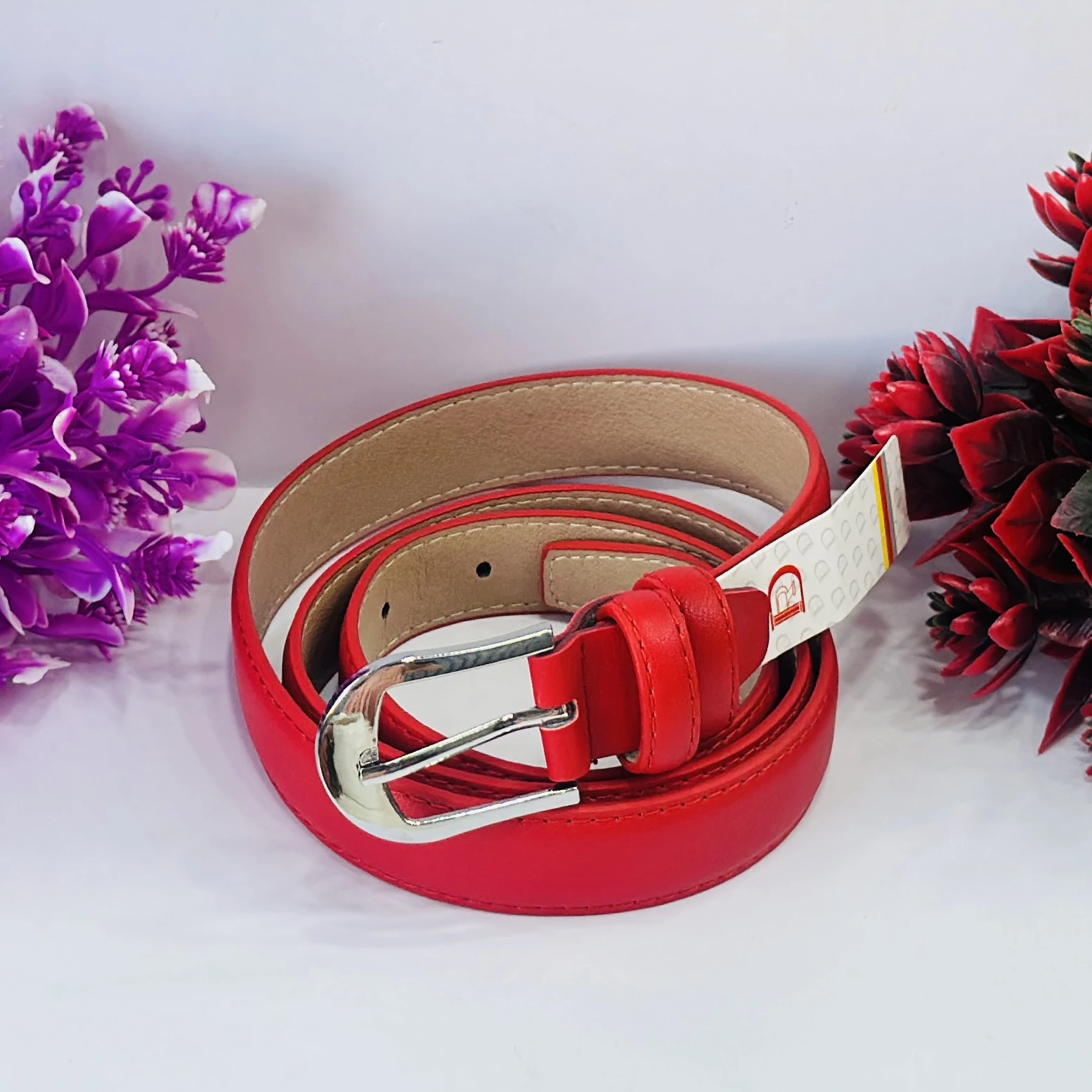👉 Theme :- Red women's belt with a gold-tone oval buckle.