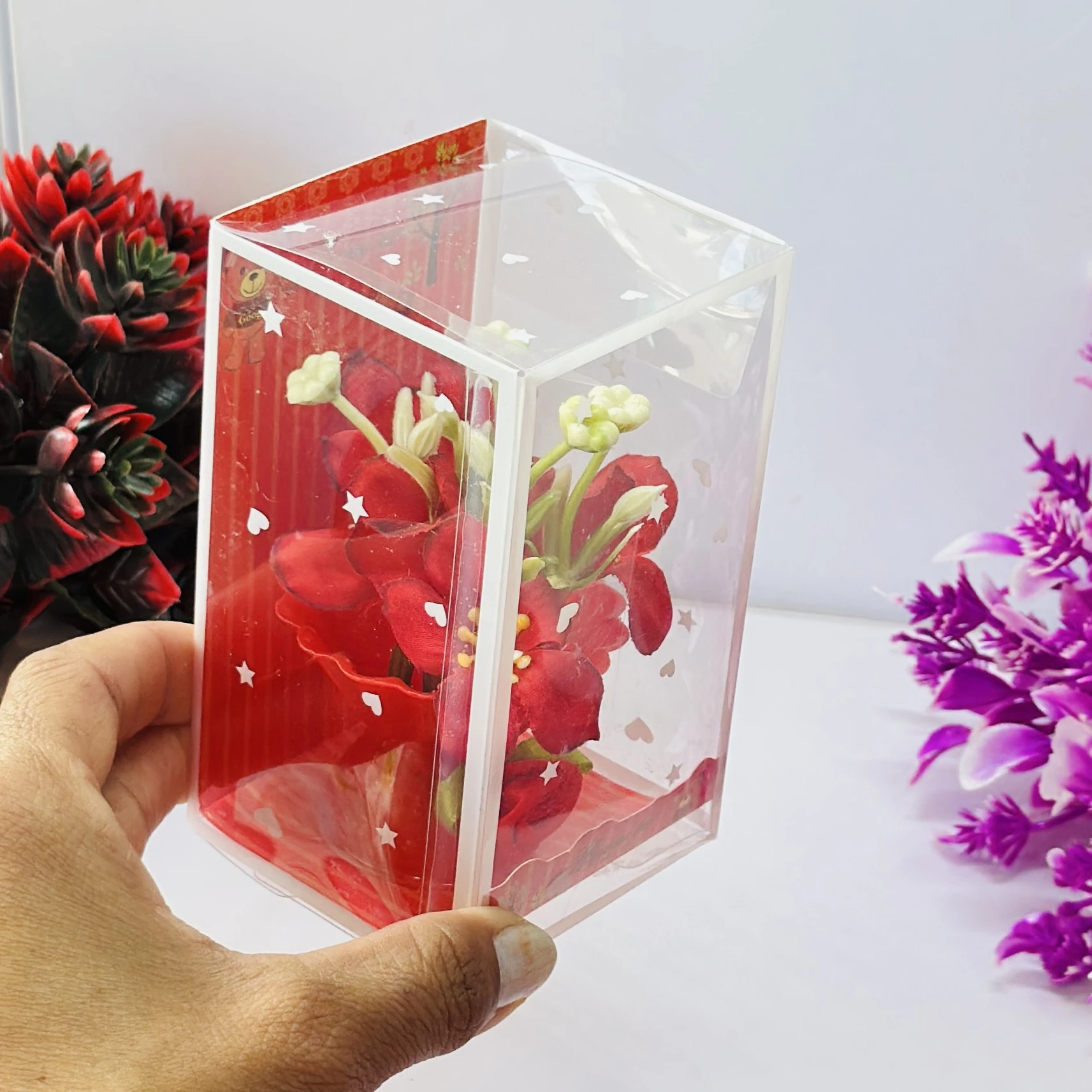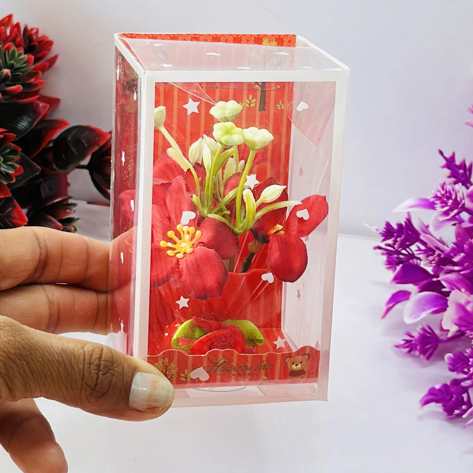 👉 Theme :- Small artificial flower arrangement in a decorative plastic vase, packaged in a clear display box.