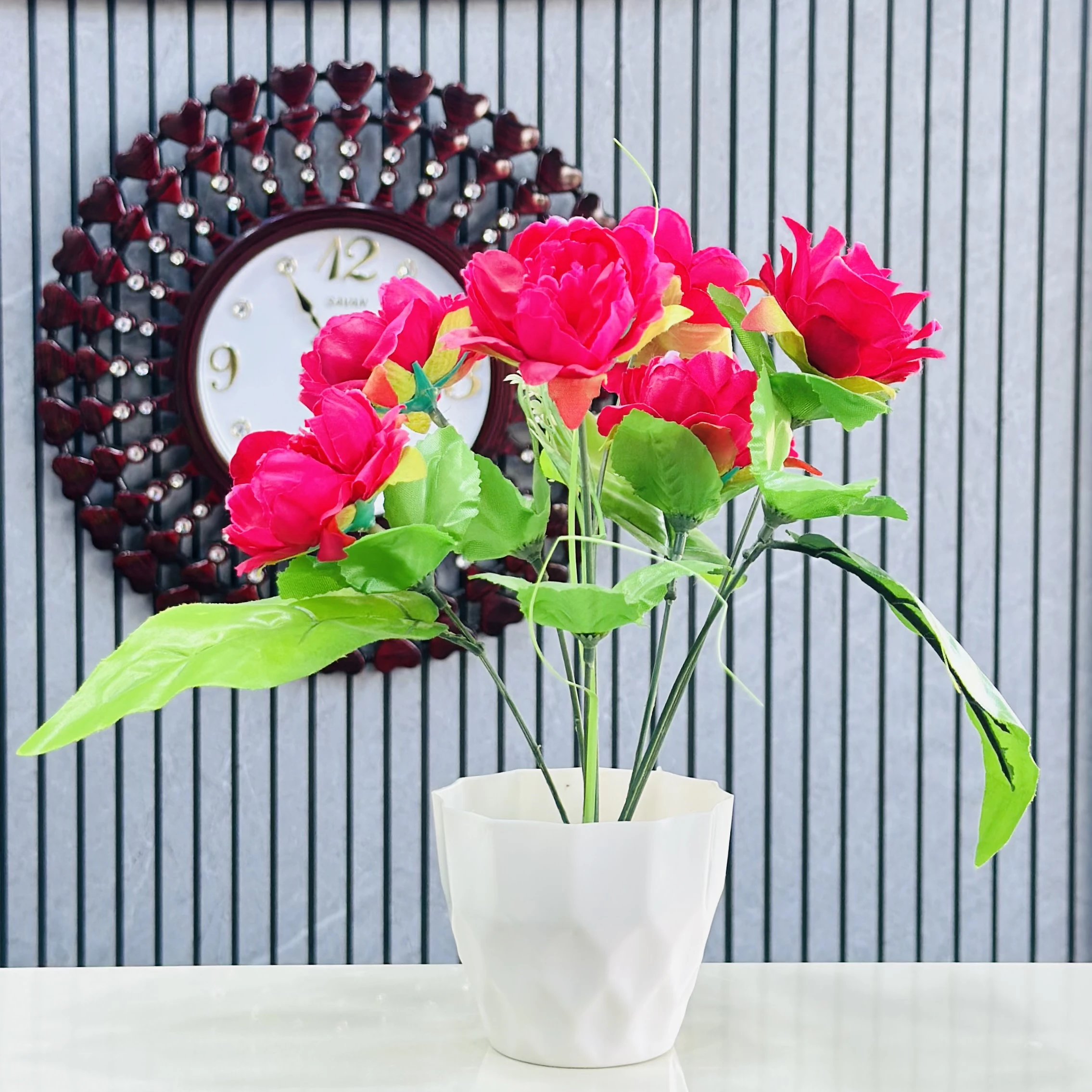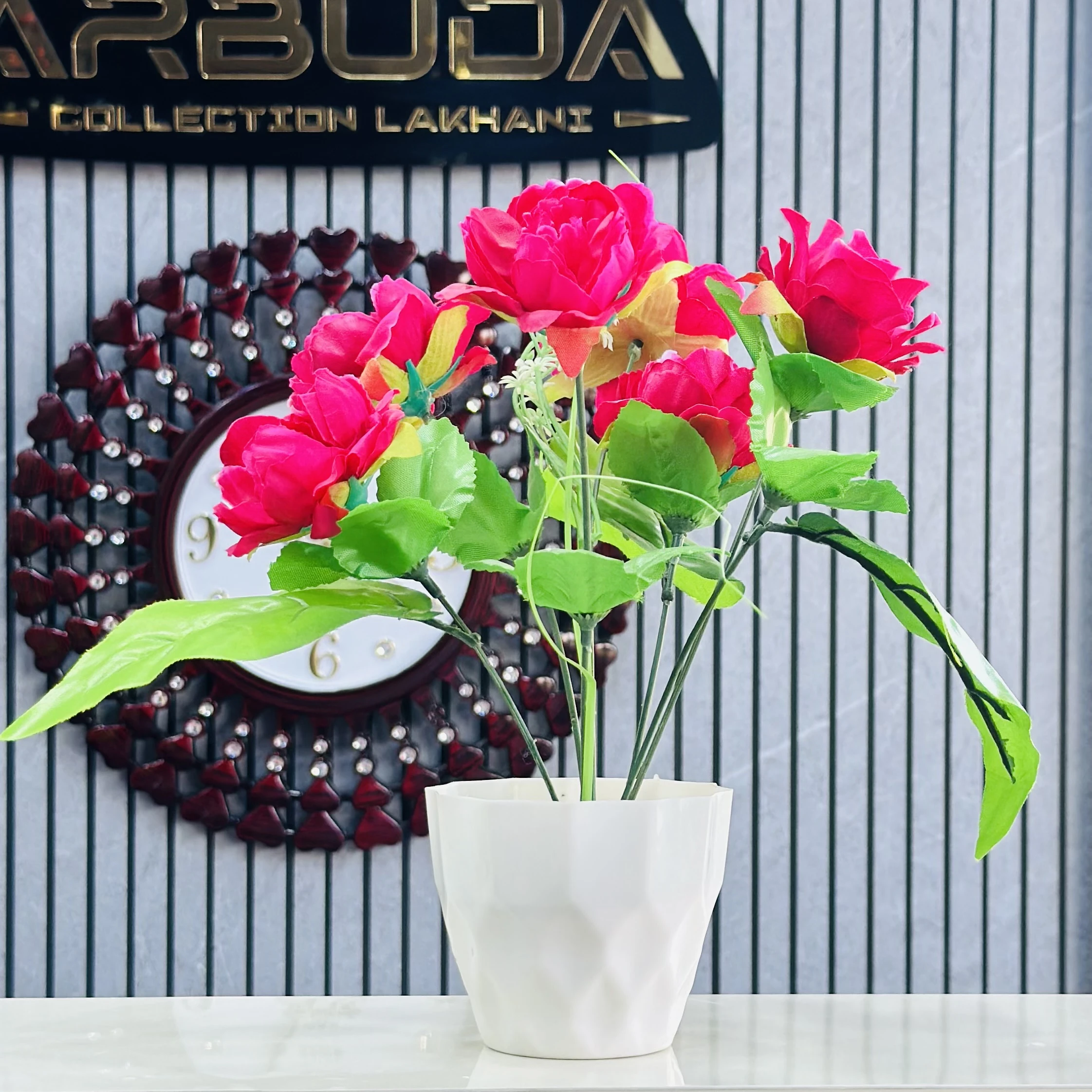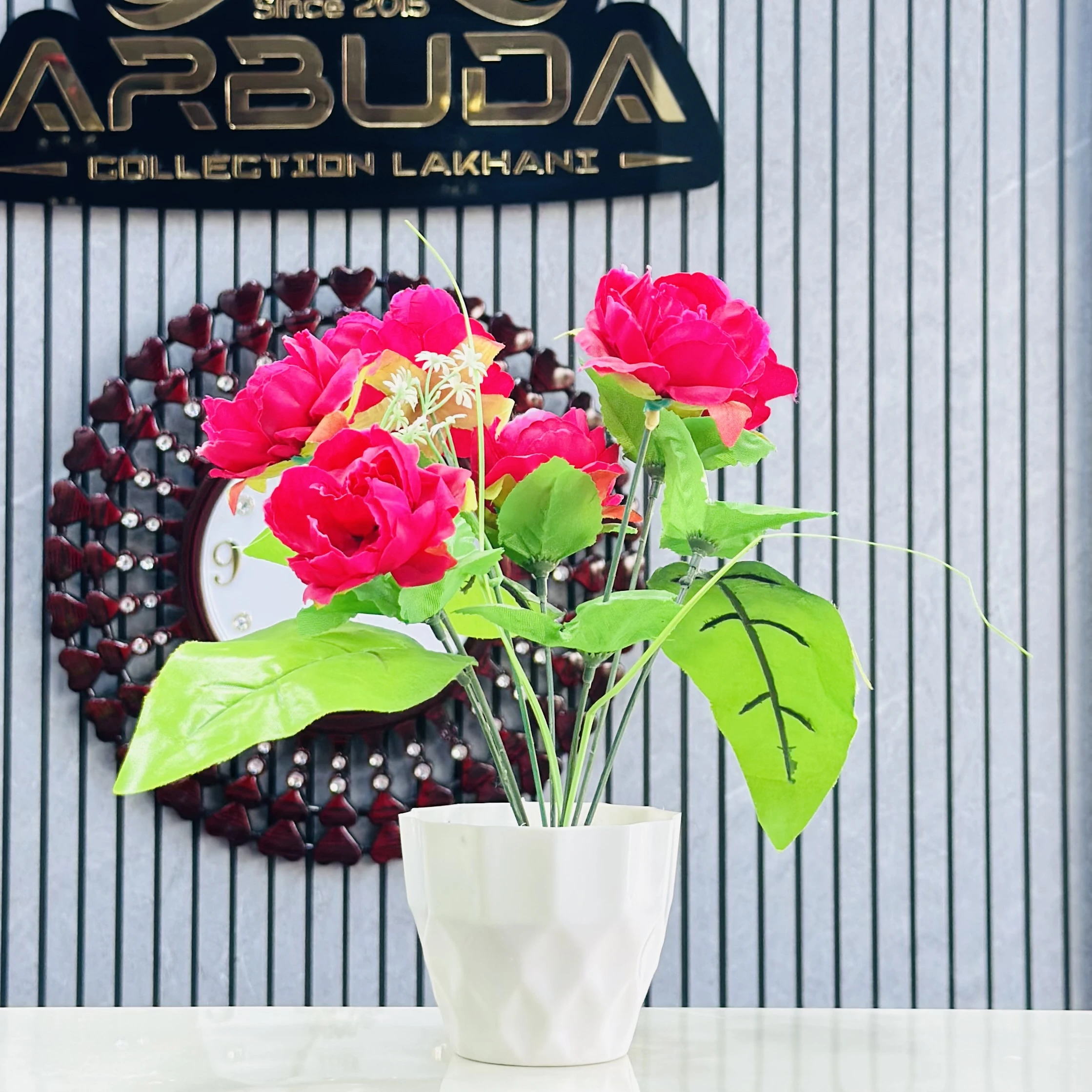 👉 Theme :- Red rose flower arrangement in a white pot.