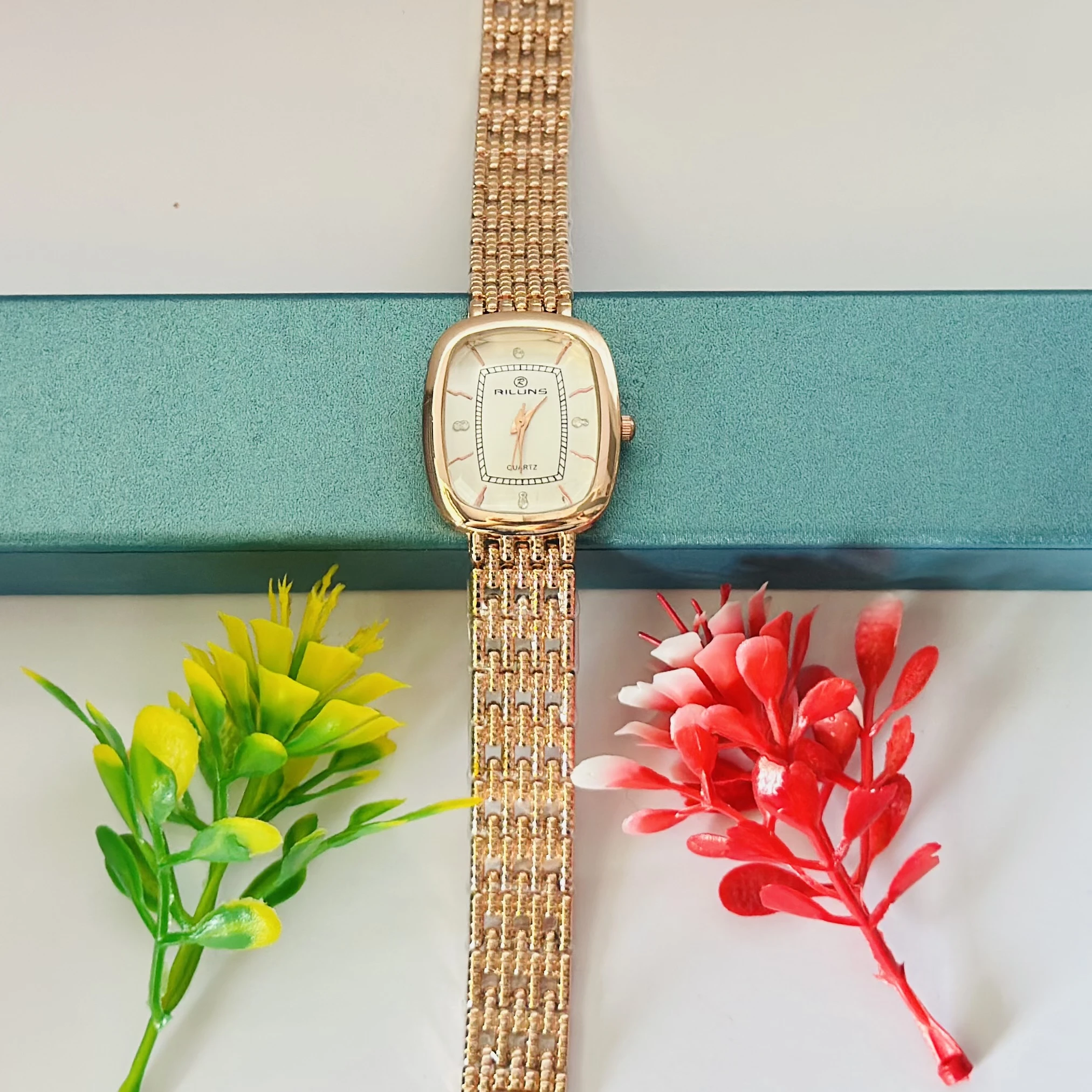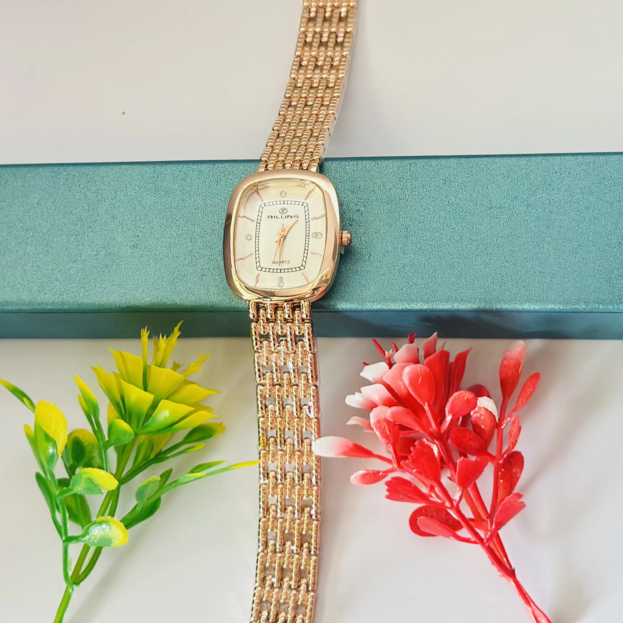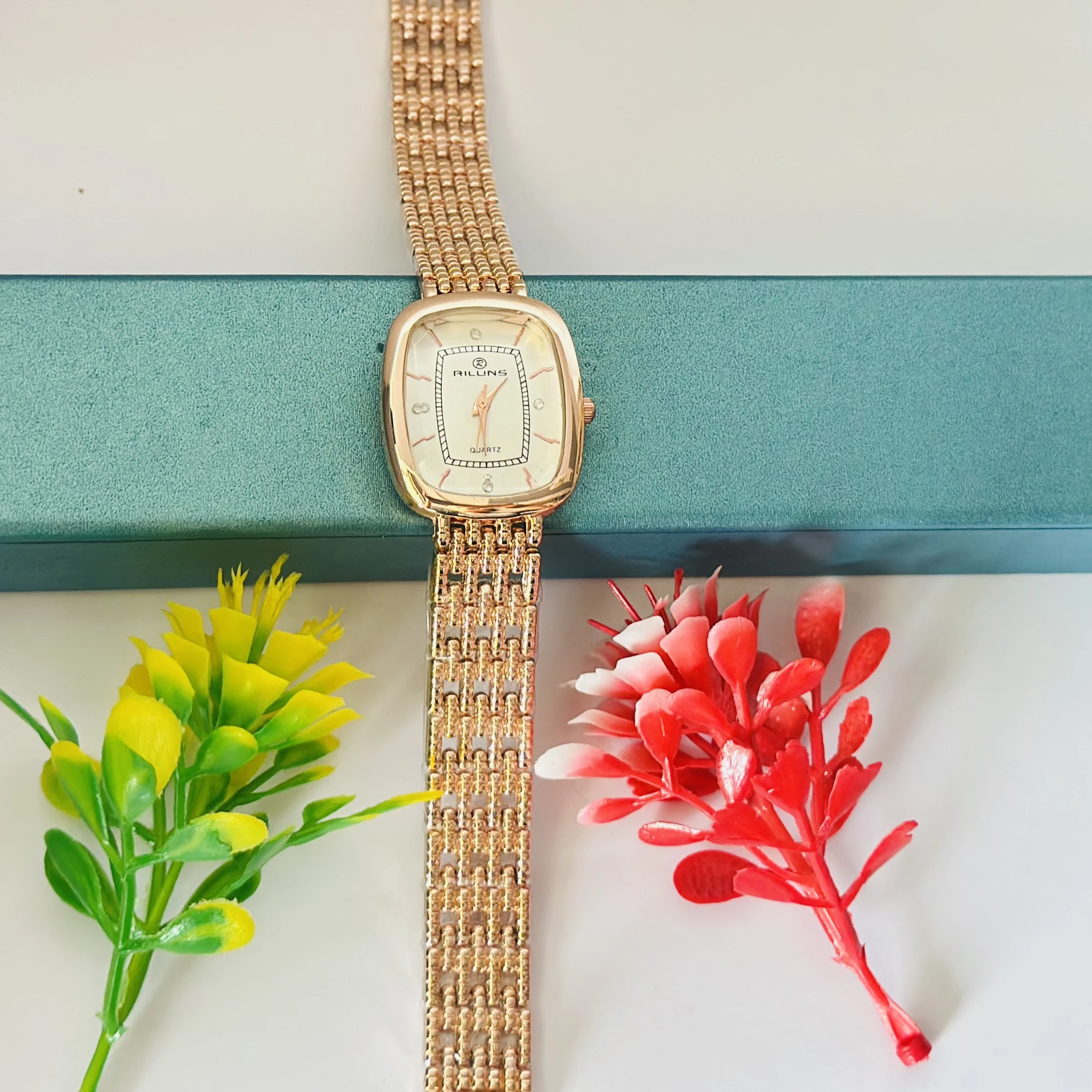👉 Theme :- Riluns quartz watch with a rose gold-toned case and a linked bracelet.