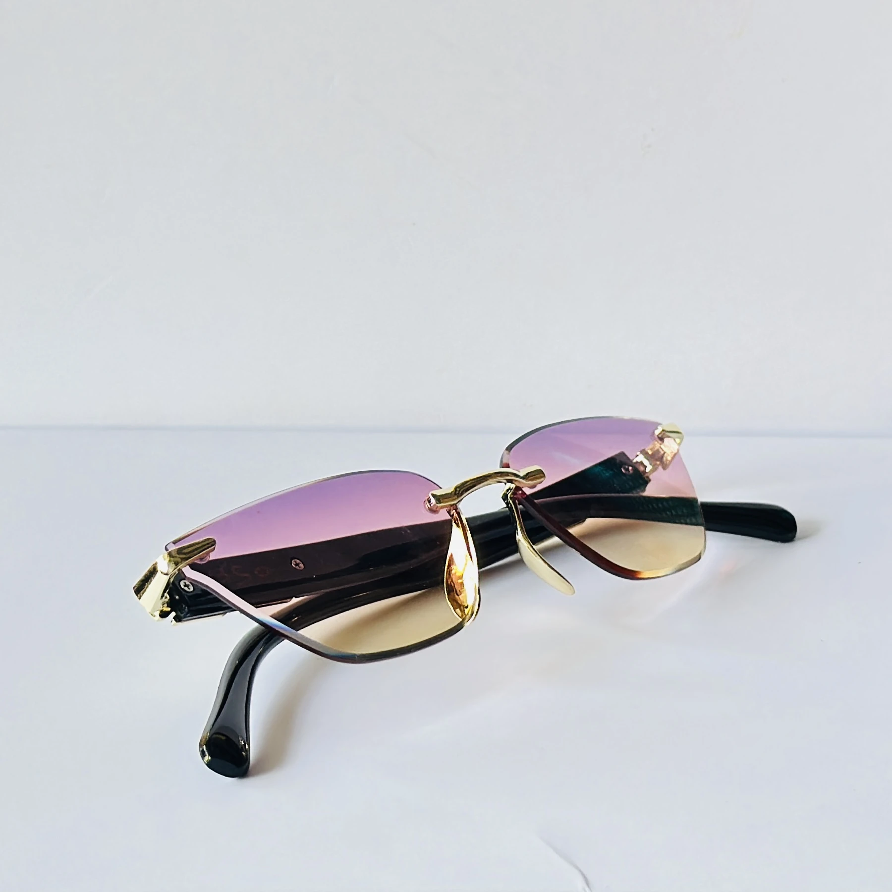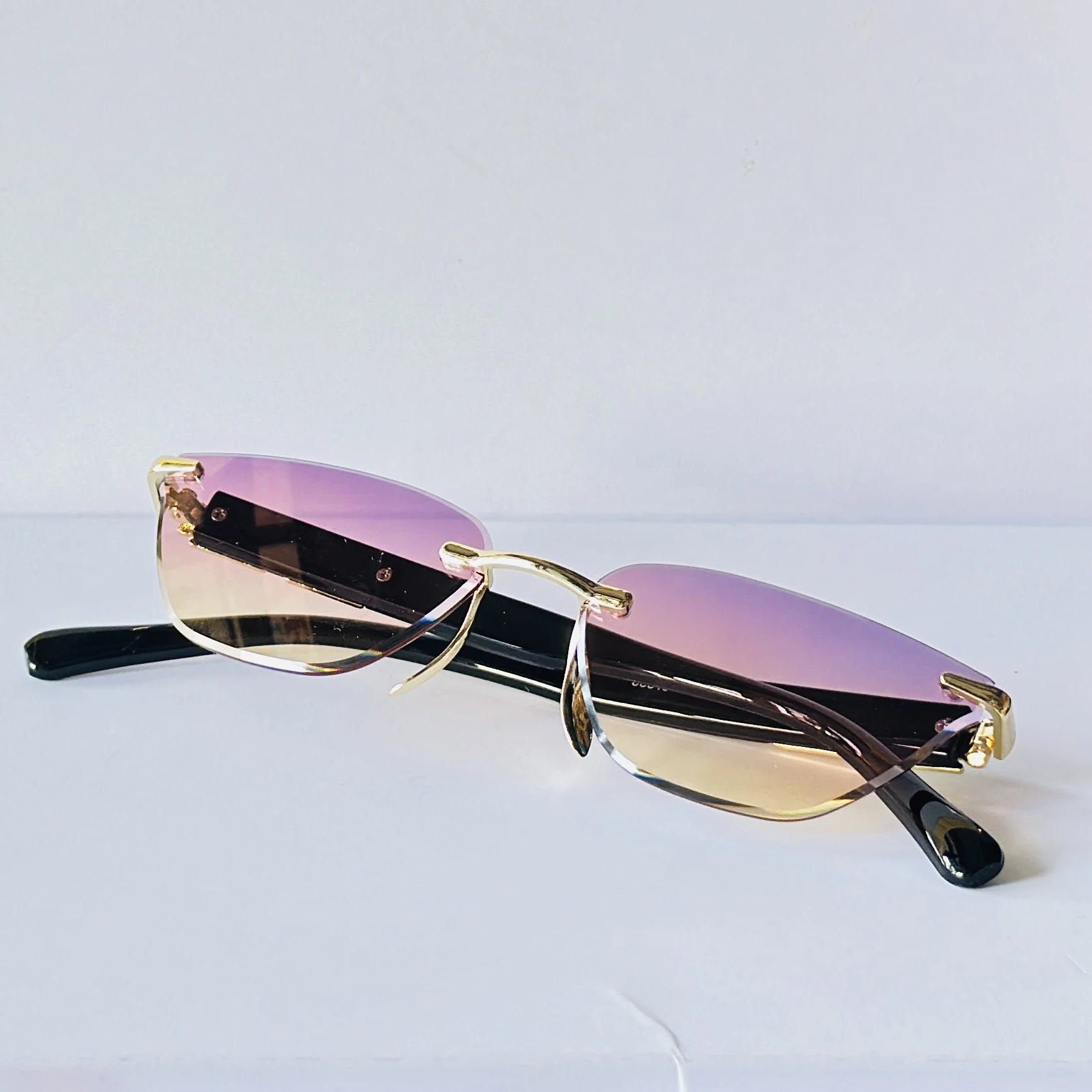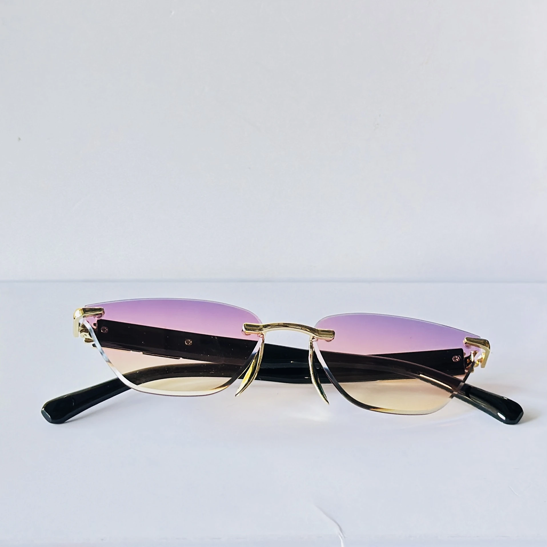 👉 Theme :-  appears to be similar to rimless cat-eye sunglasses featuring a gold-tone frame and gradient lenses,.