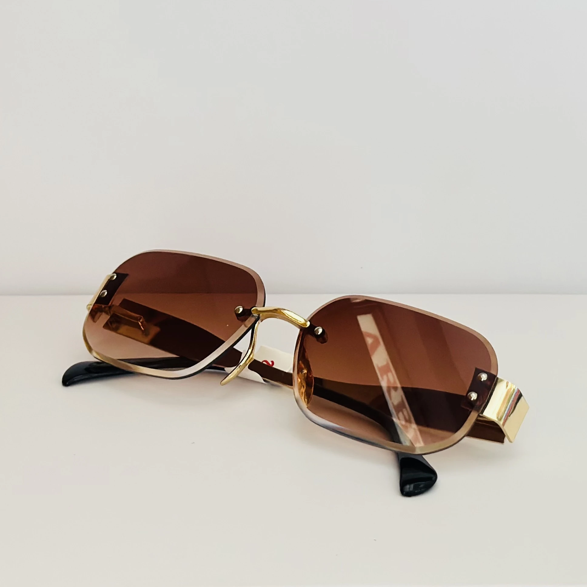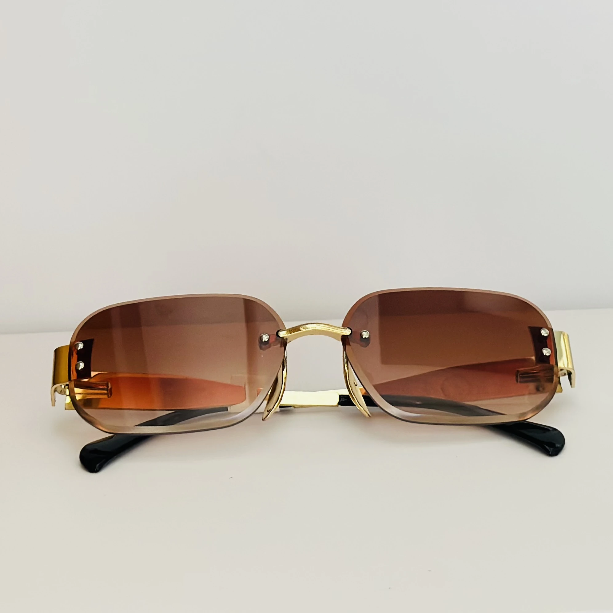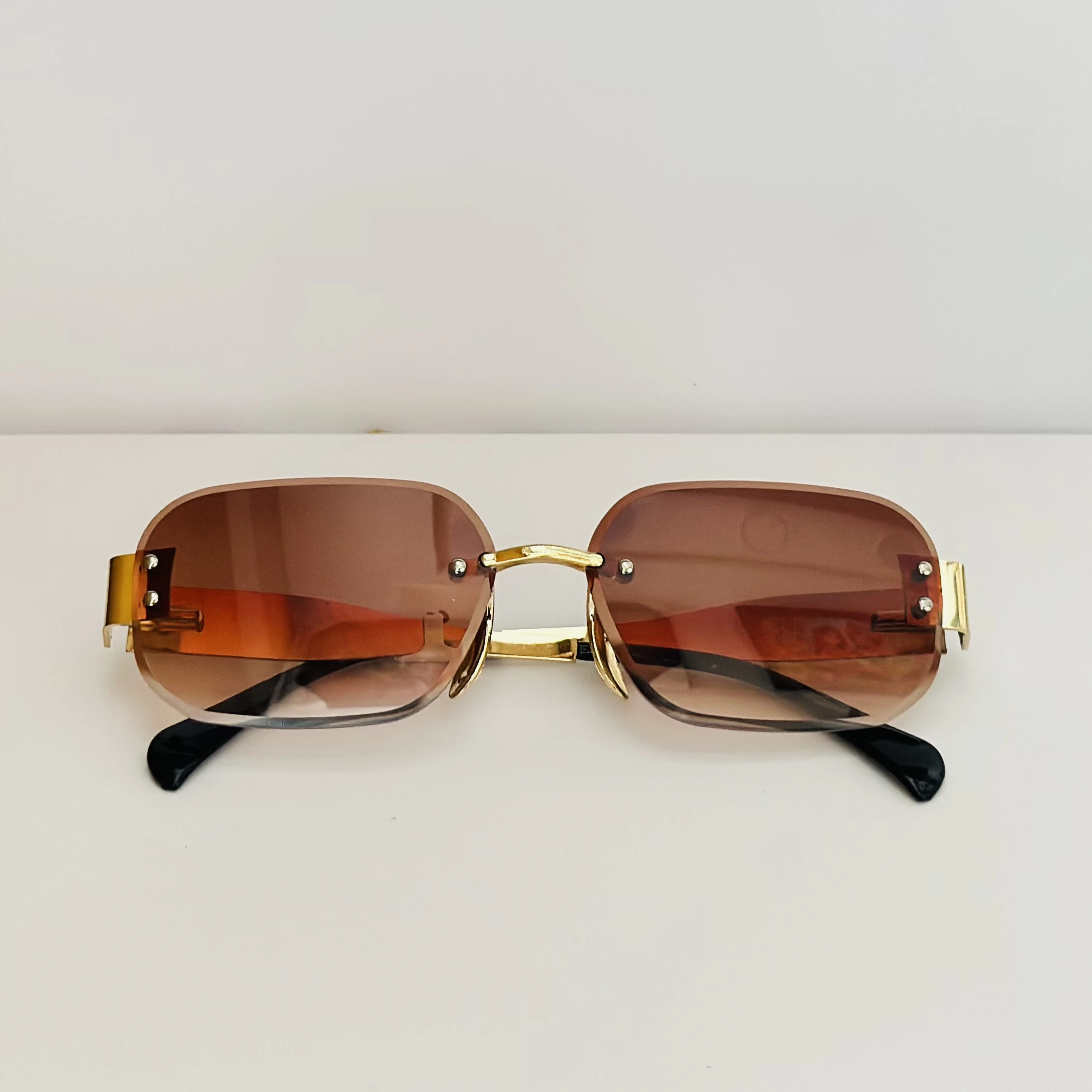 👉 Theme :- Cartier Santos de Cartier CT0460S rimless rectangular sunglasses with gold-finish metal frames and gray lenses.