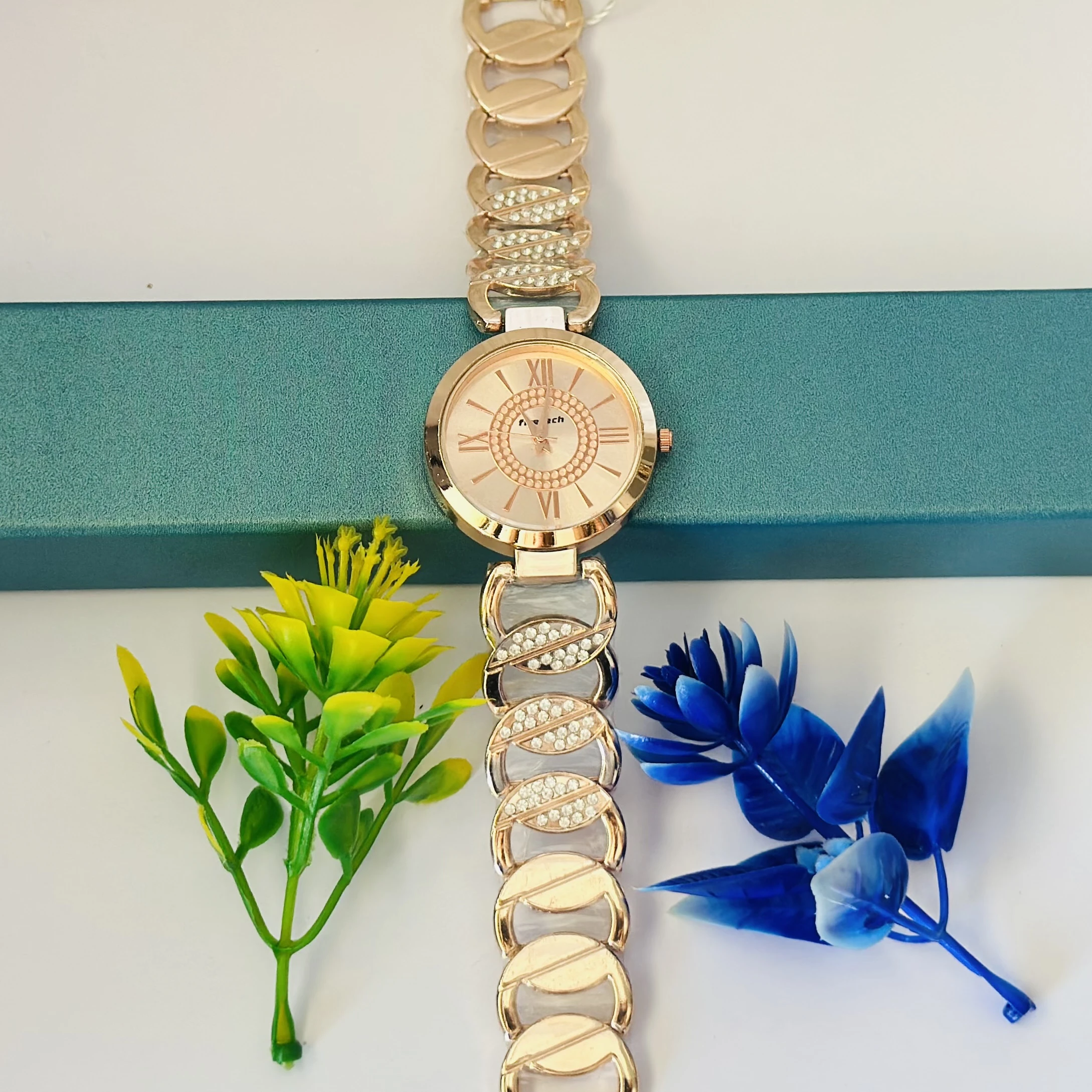 👉 Theme :- Rose gold-toned crystal link round face watch.