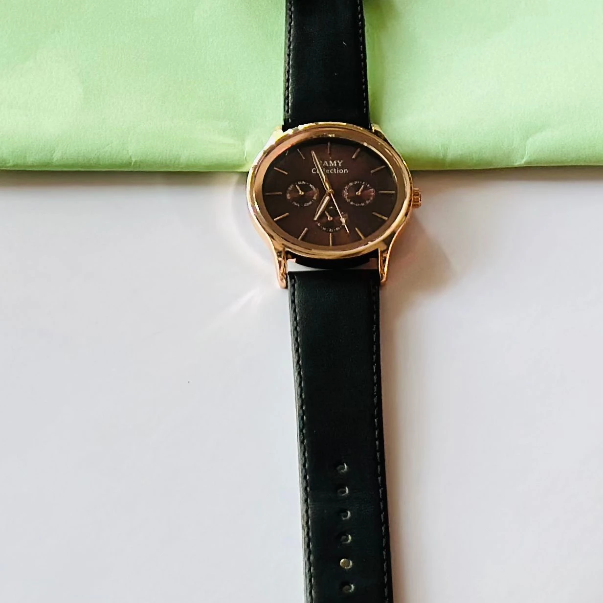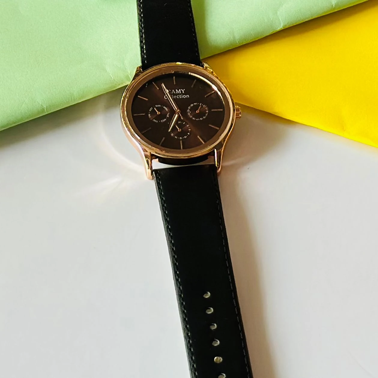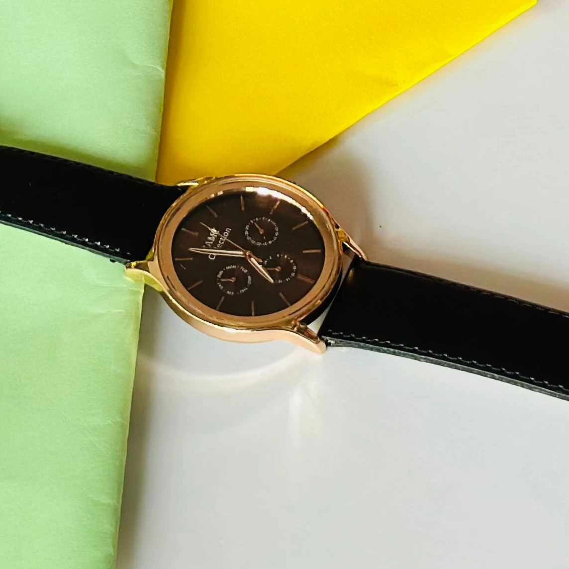 👉 Theme :- Quartz Multifunction watch for men with a black dial and a black leather strap.