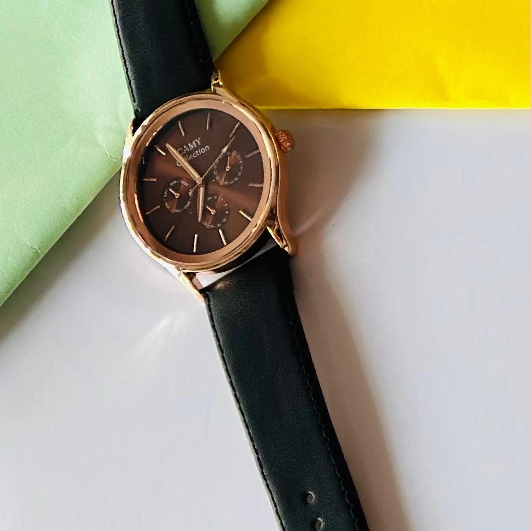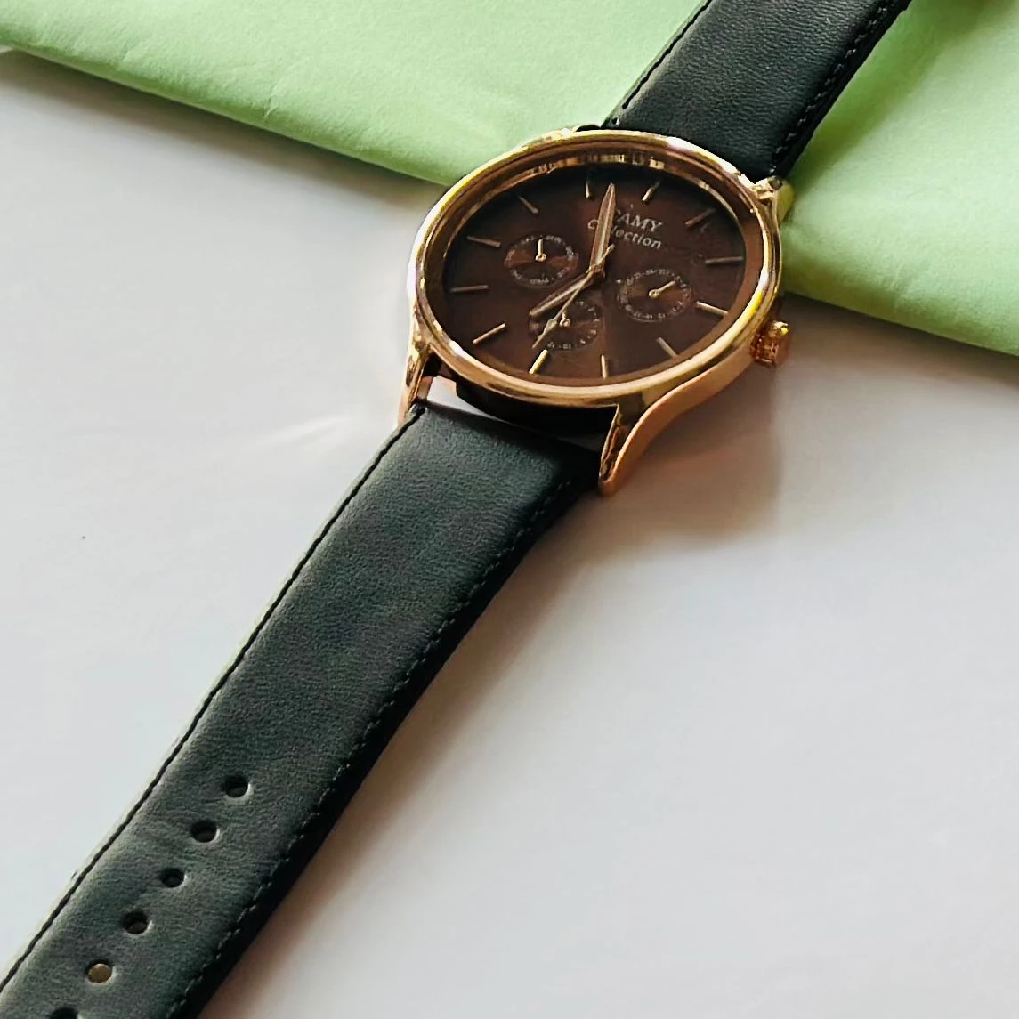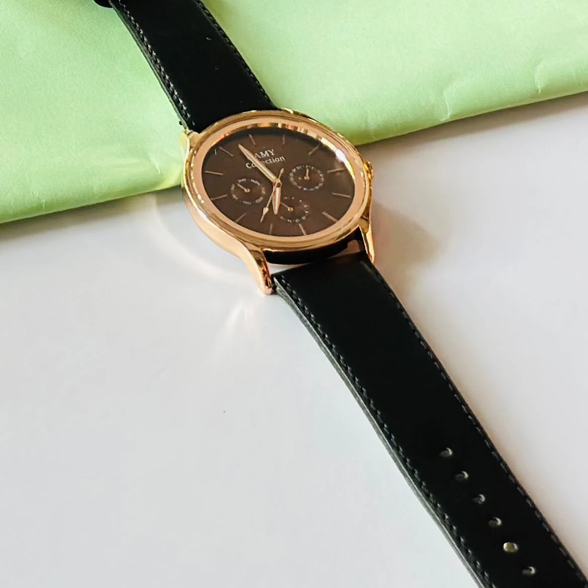 👉 Theme :- Quartz Multifunction watch for men with a black dial and a black leather strap.