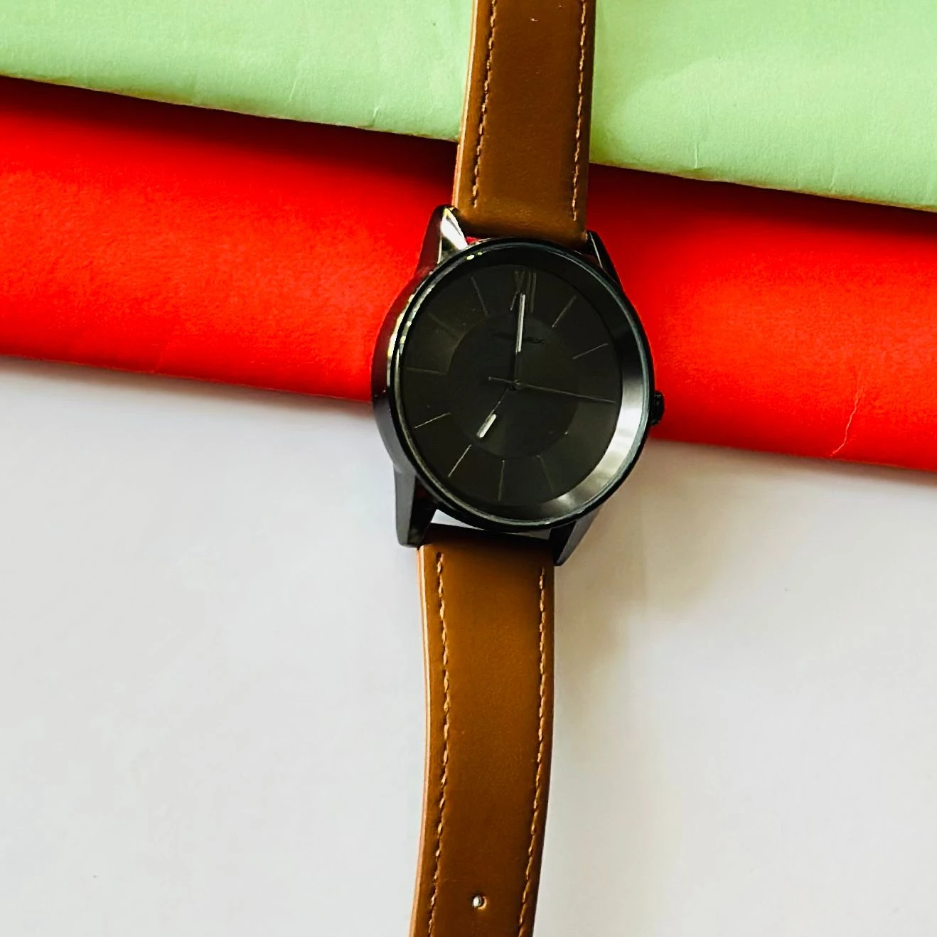 👉 Theme :- Round analog watch with a brown leather strap