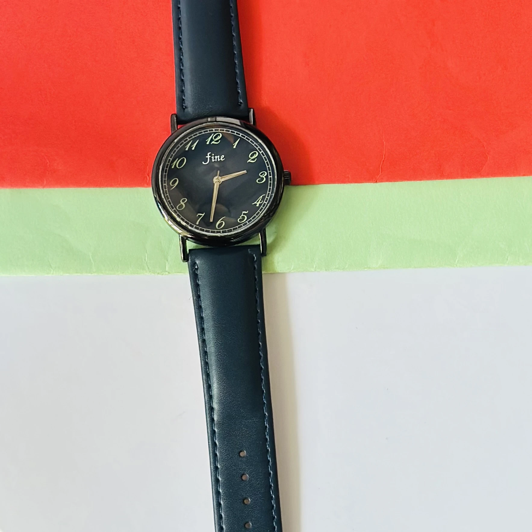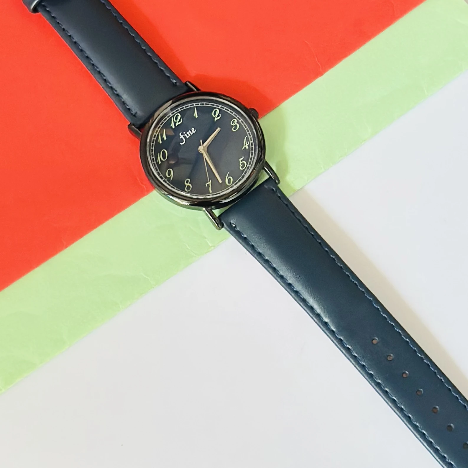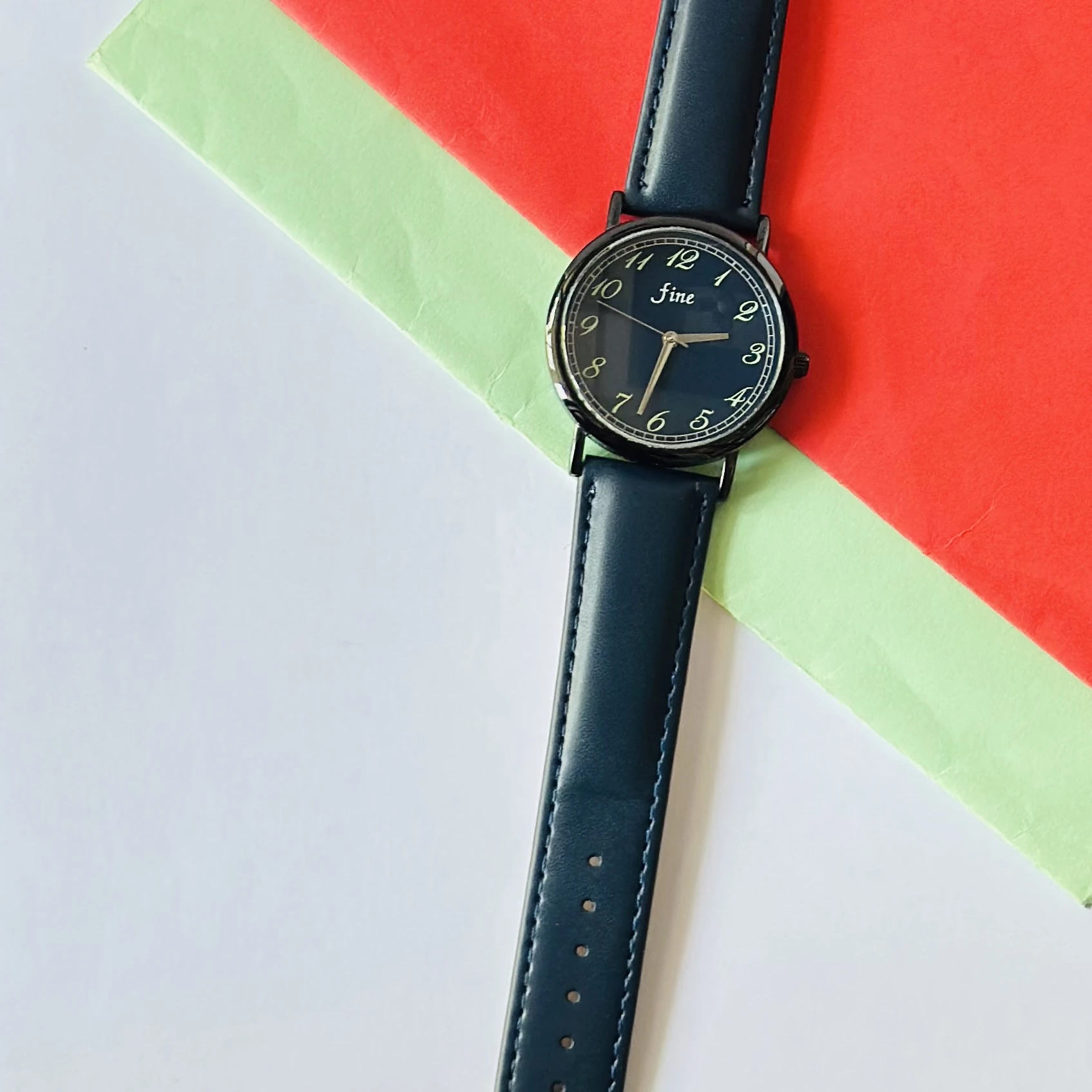 👉 Theme :- Round analog watch with a dark blue dial and a faux leather strap.