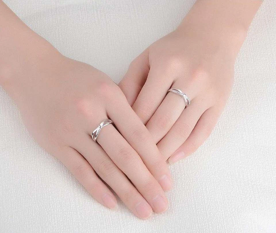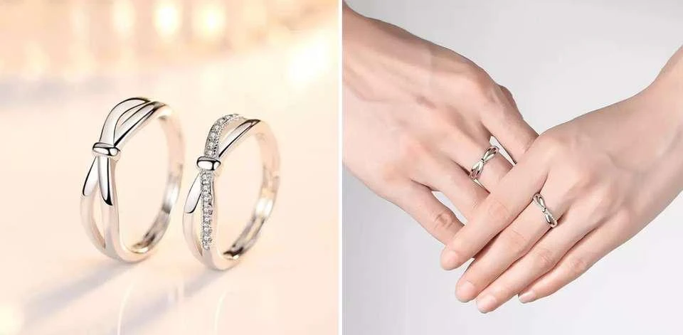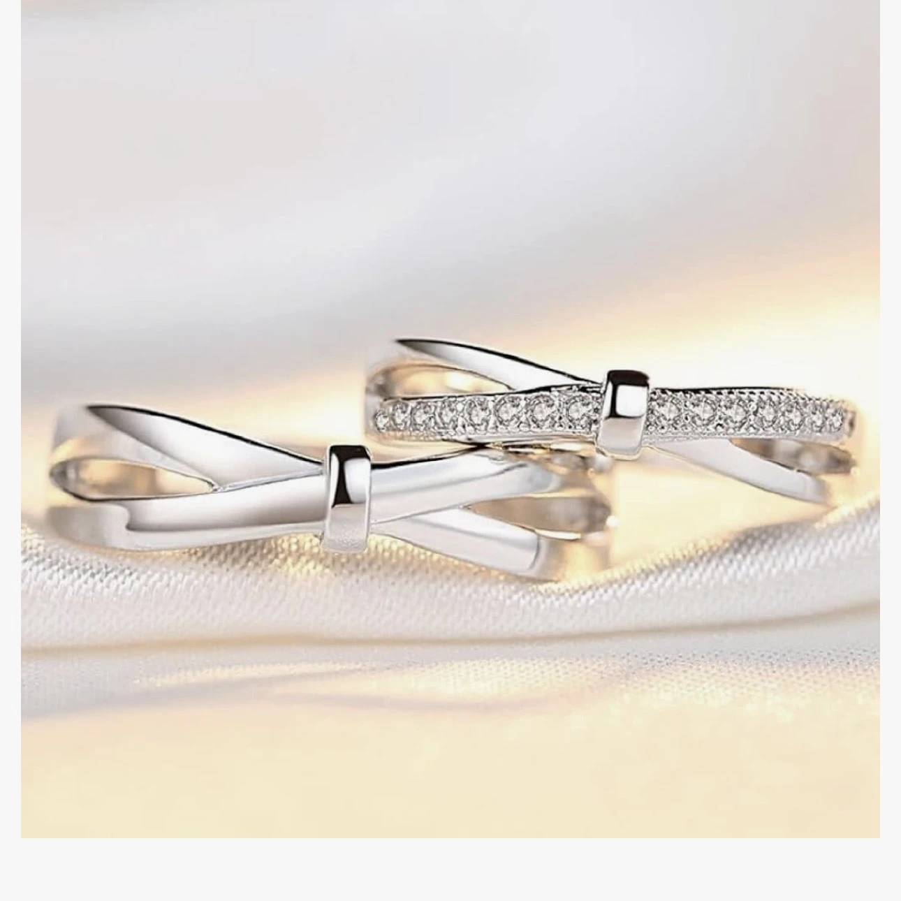 👉 Theme :- Set of silver-plated, adjustable couple rings featuring a double bowknot design, with one ring studded with cubic zirconia stones.