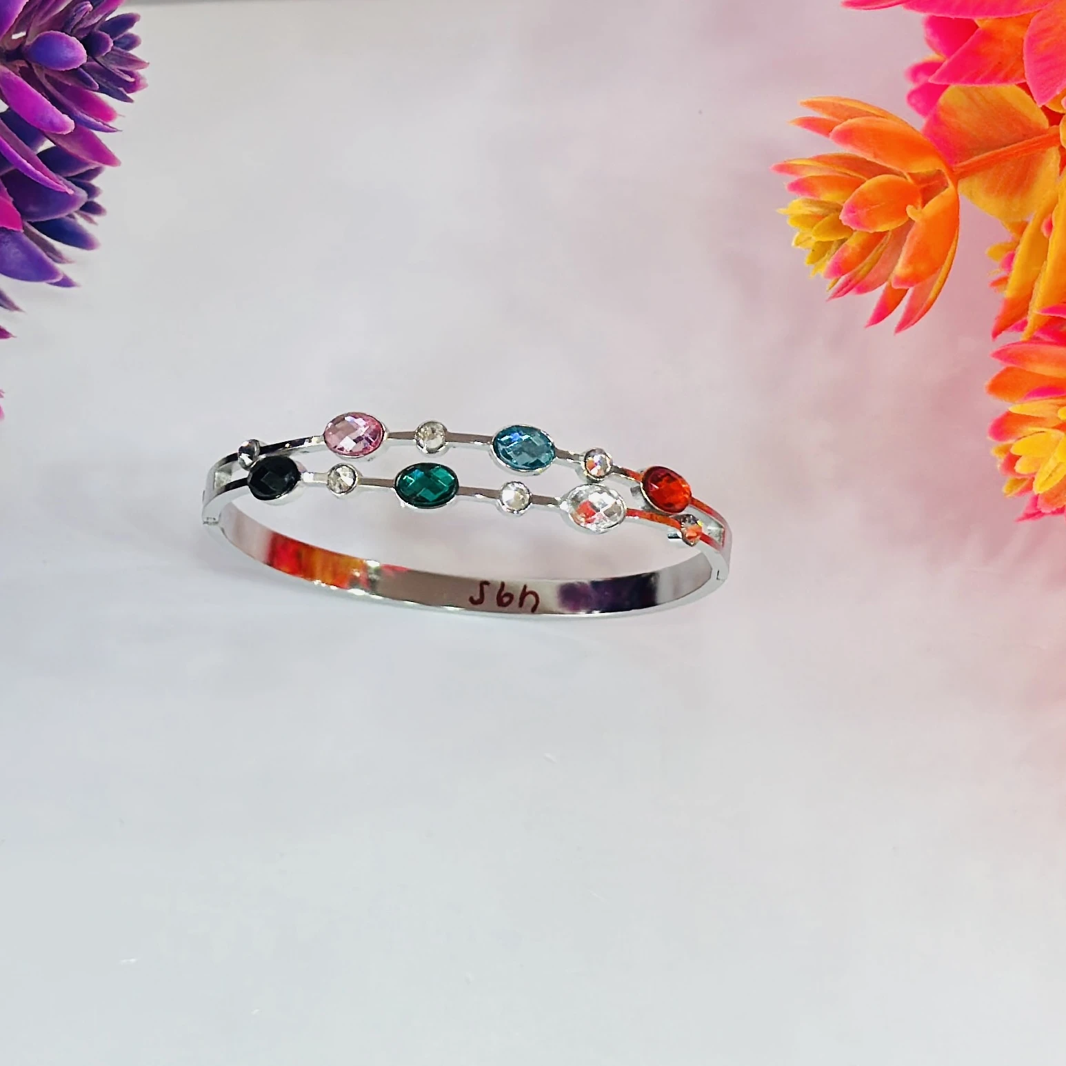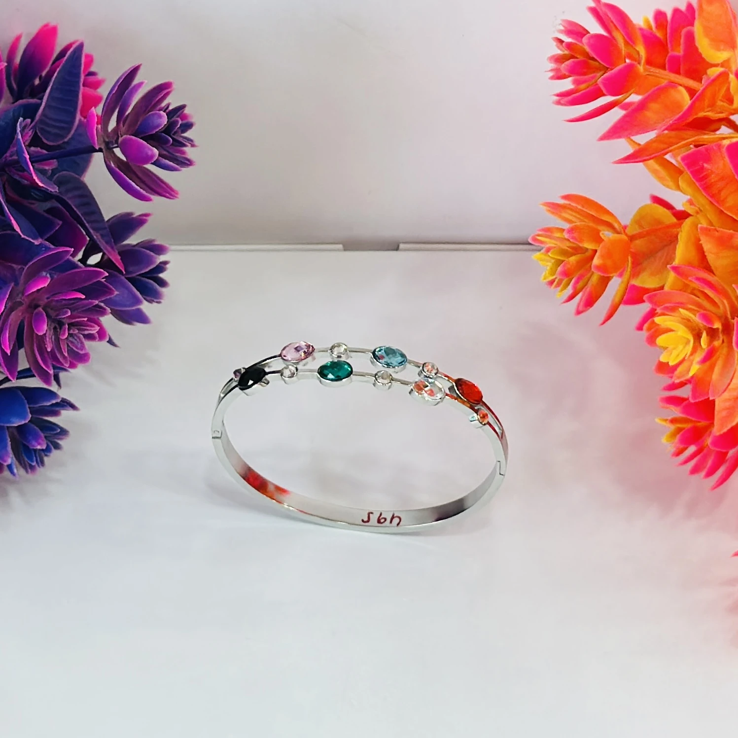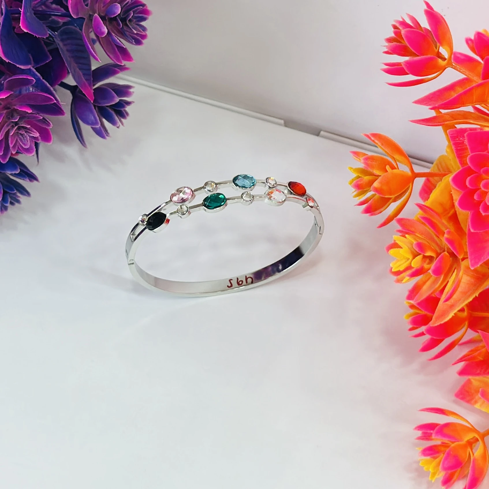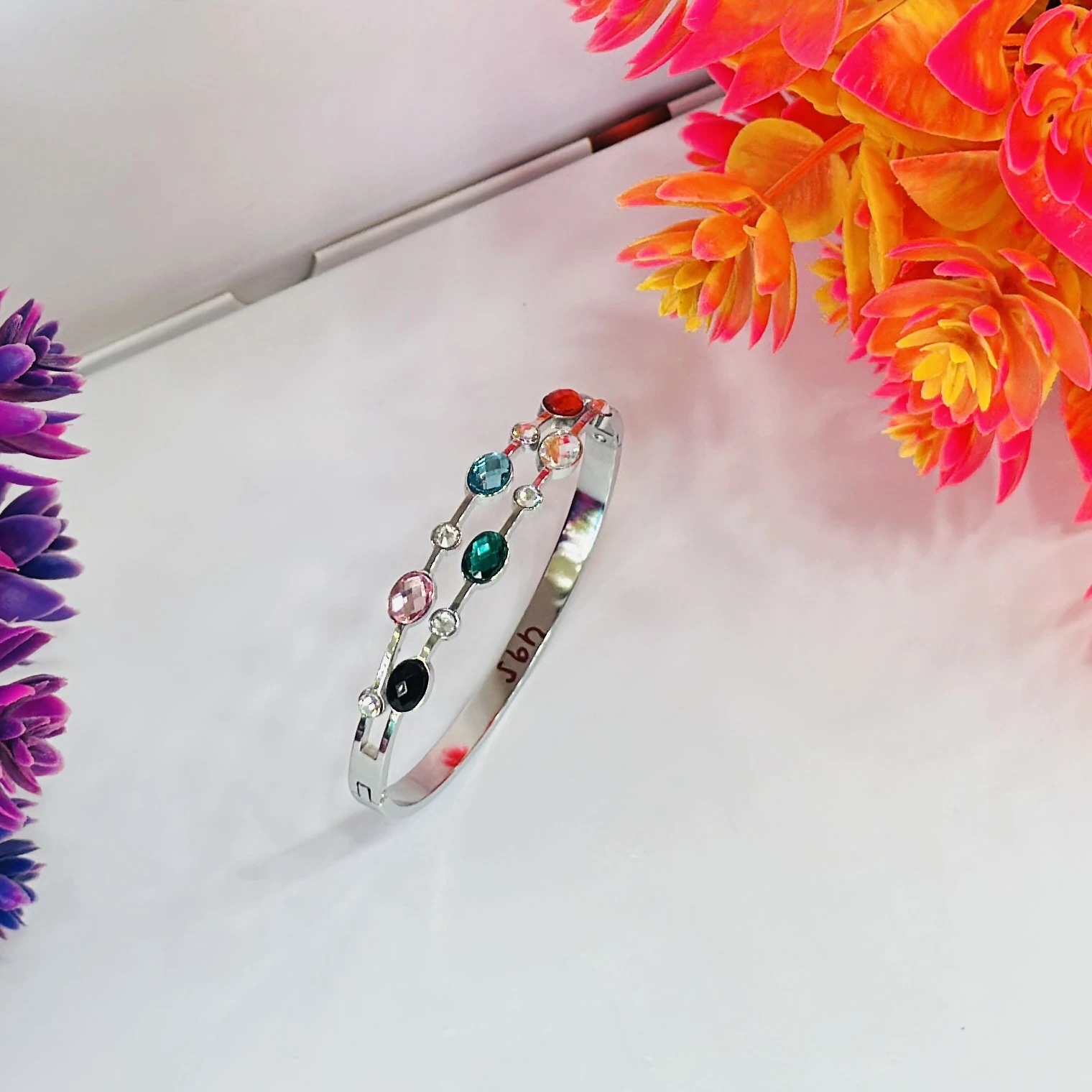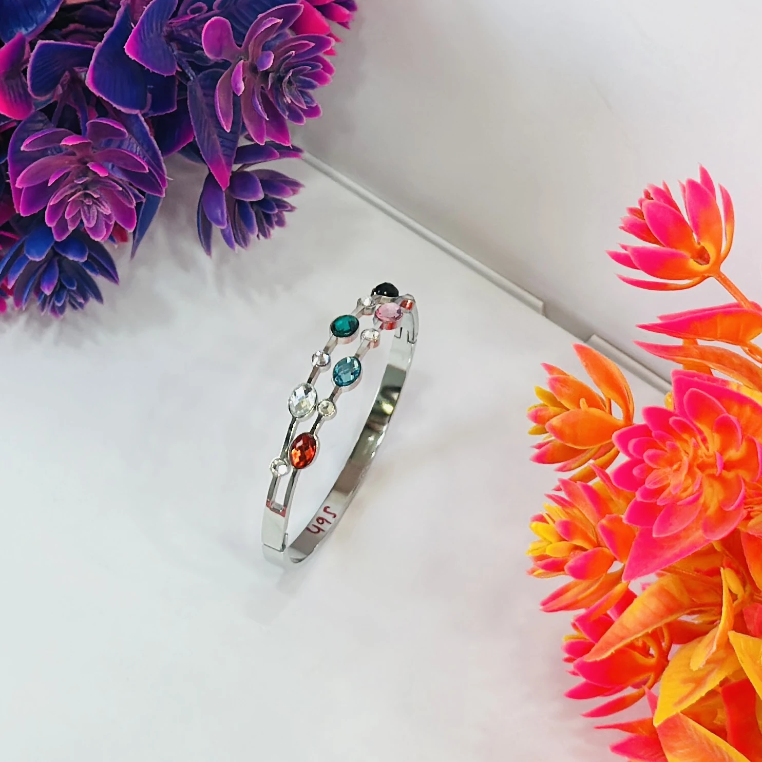 👉Theme :- Silver -colored stainless steel cuff bangle bracelet with multicolor crystals.