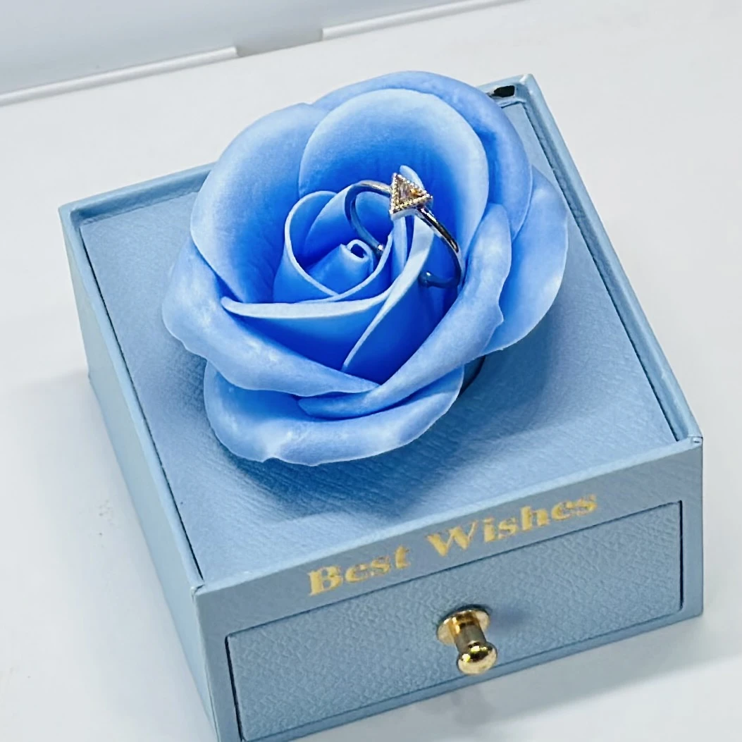 👉 Theme :- silver-toned adjustable ring featuring a triangle-shaped crystal, presented in a blue rose gift box.