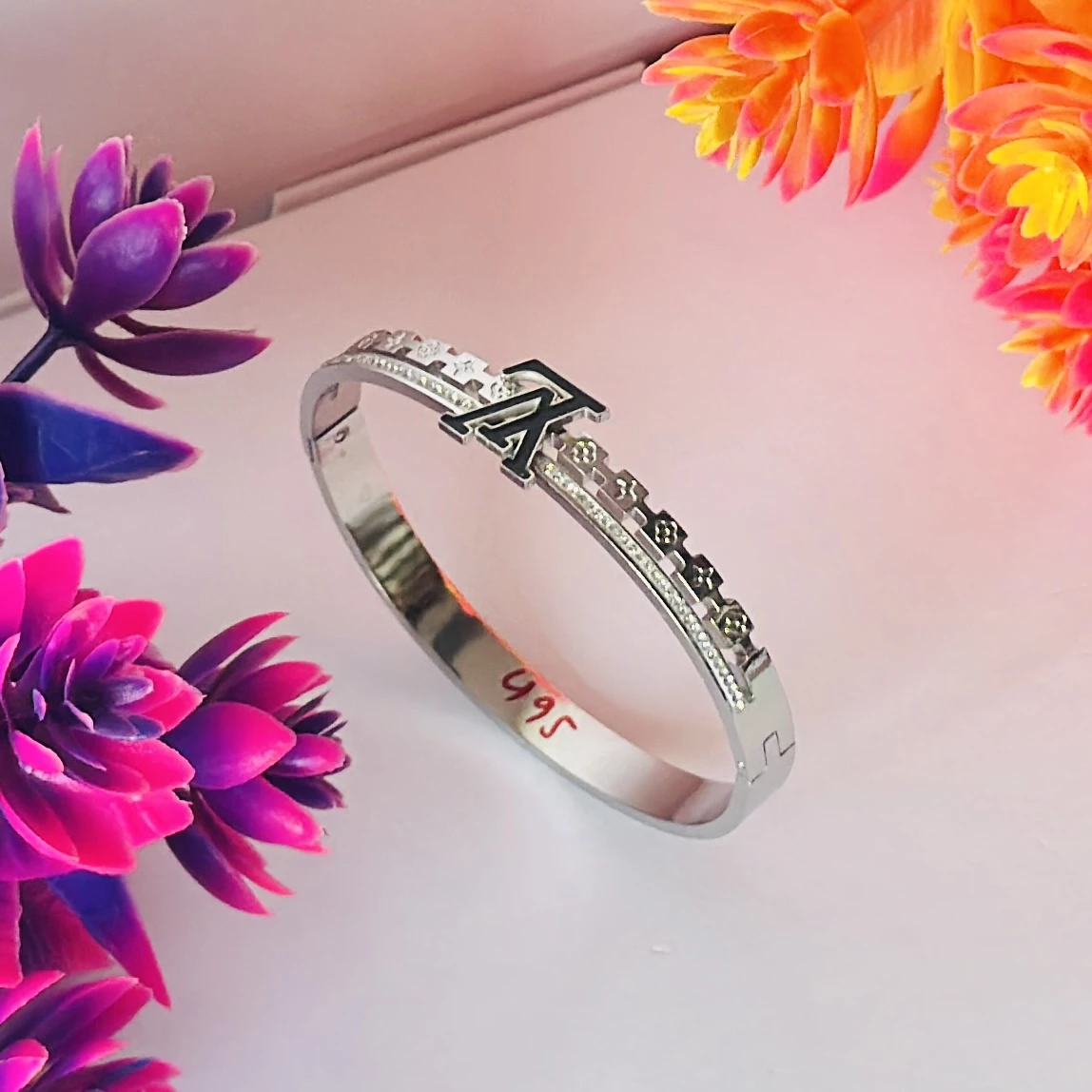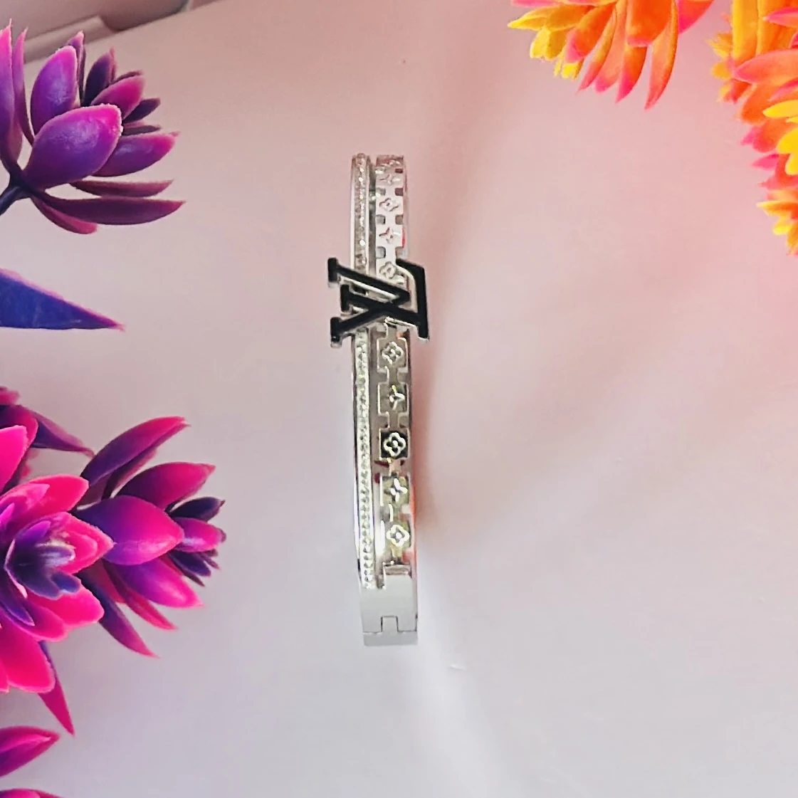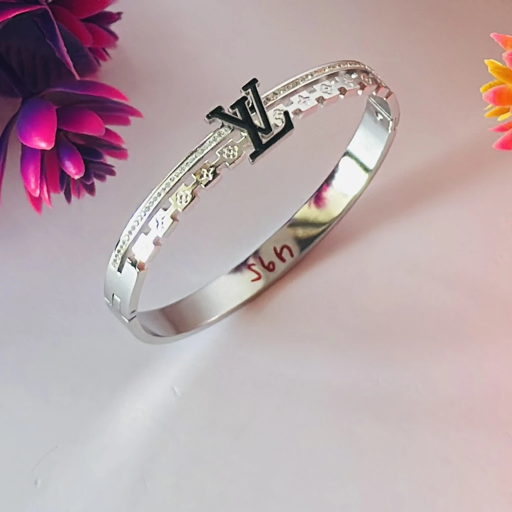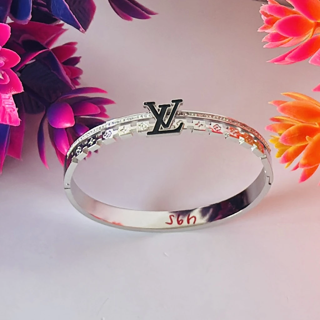 👉Theme :- Silver toned Louis Vuitton-style monogram bangle bracelet.