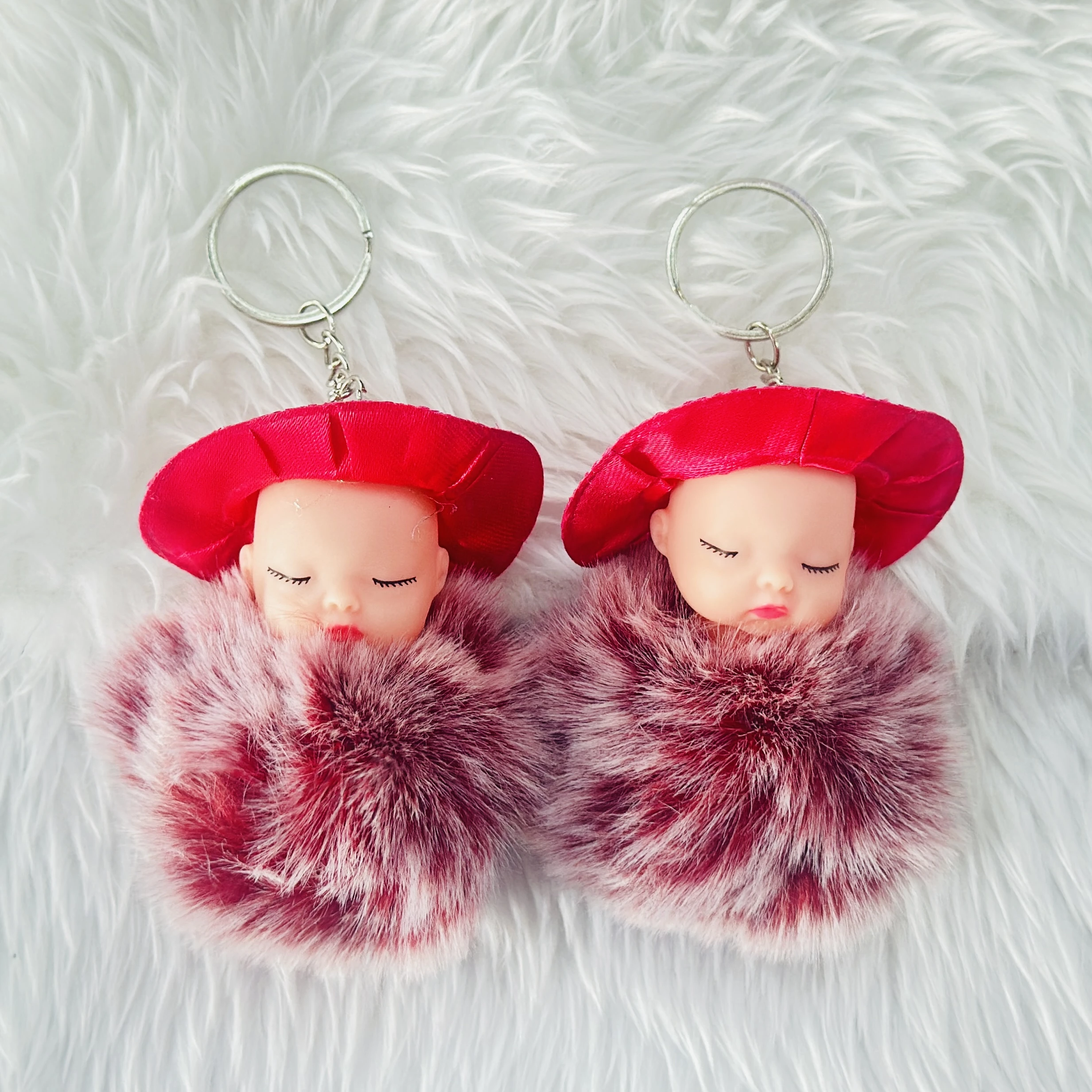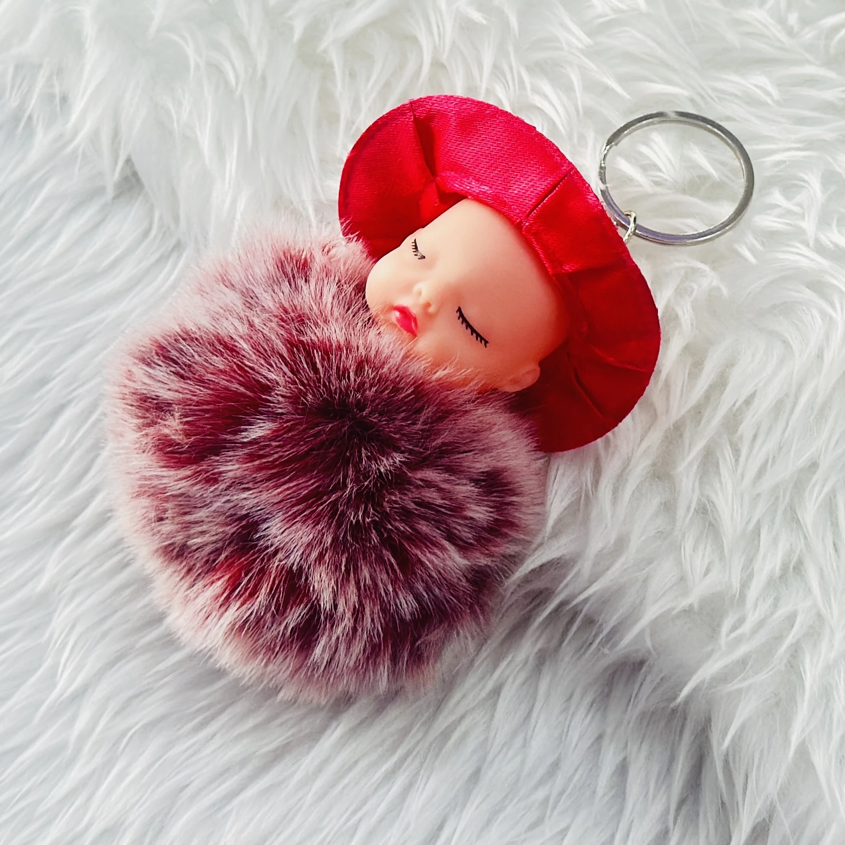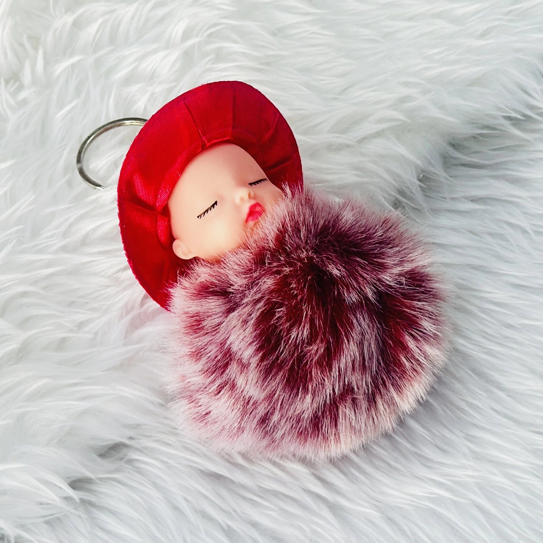sleeping baby doll fluffy pom pom keychain