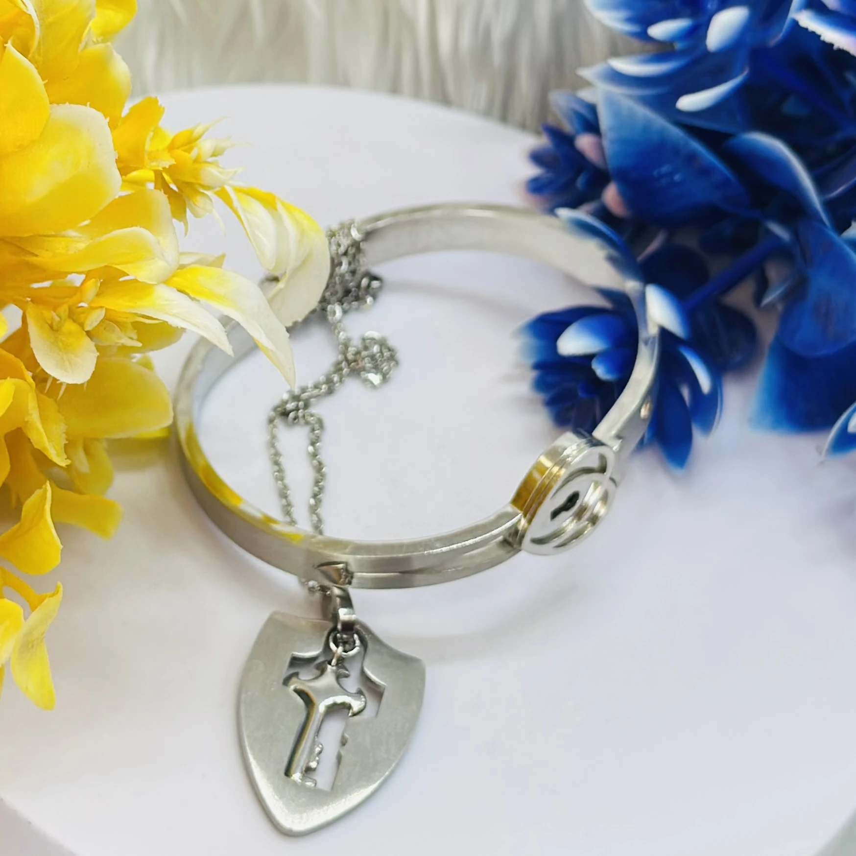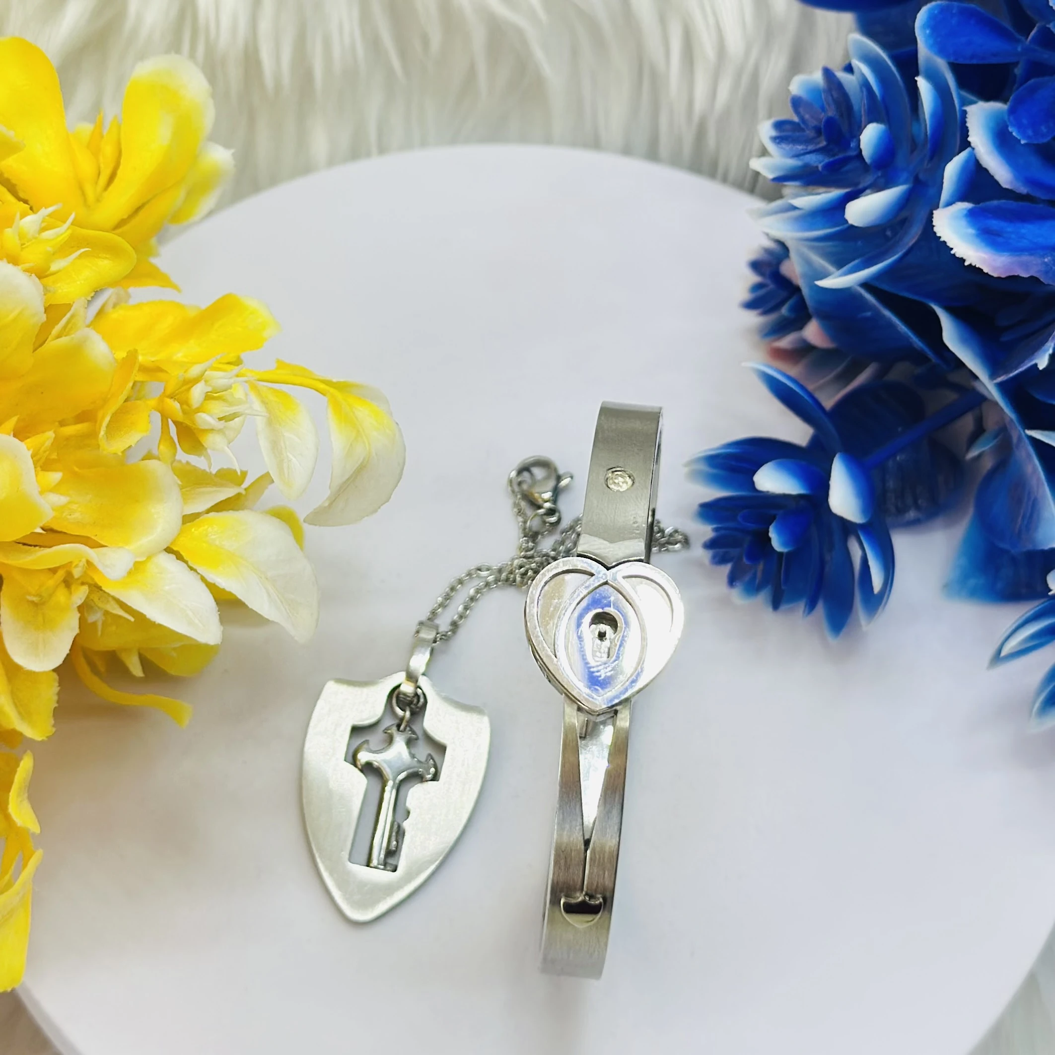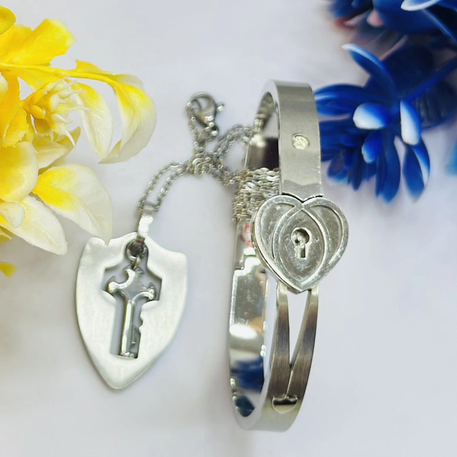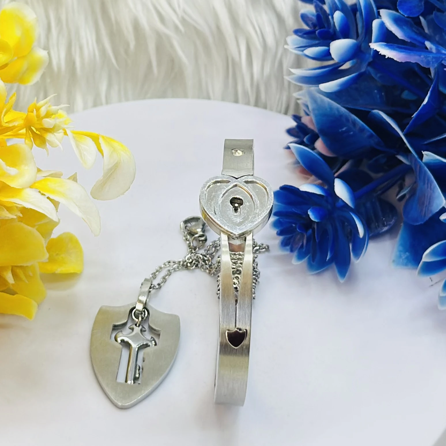 👉Theme :- stainless steel lock bracelet and shield key pendant necklace set for couples.