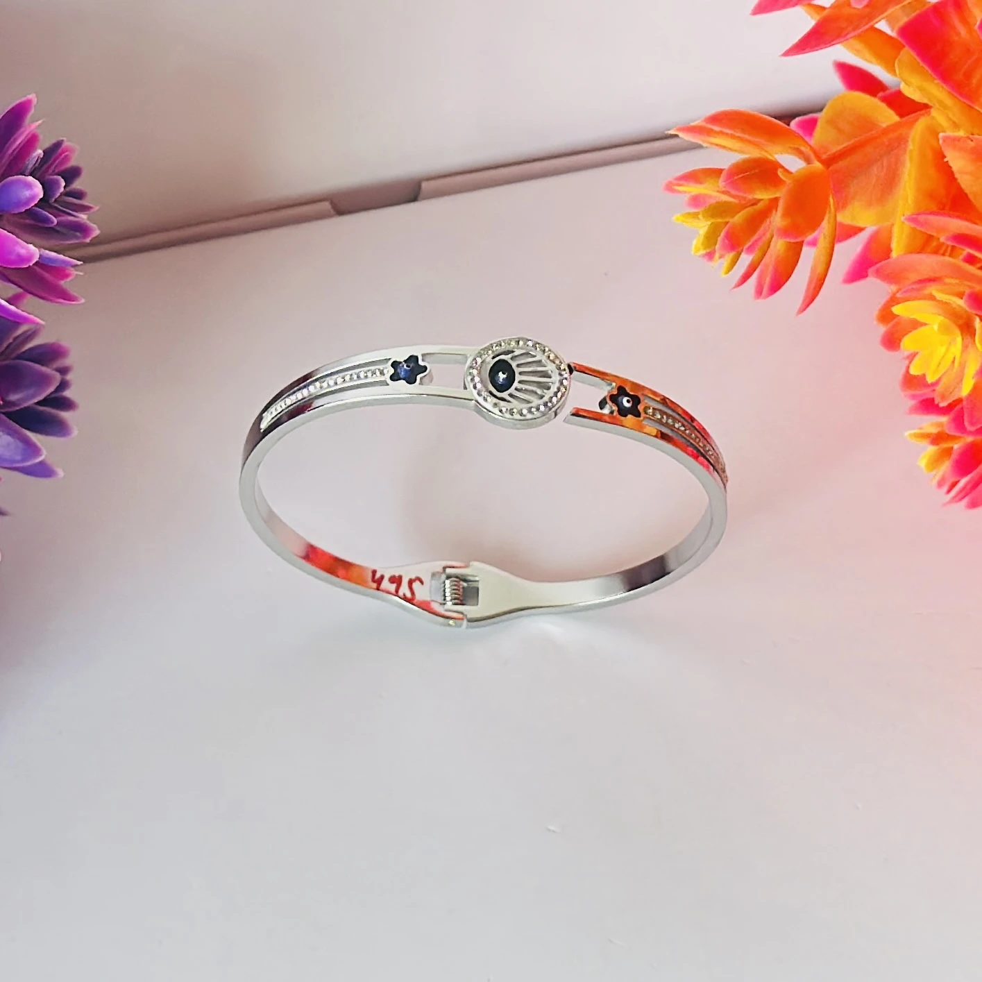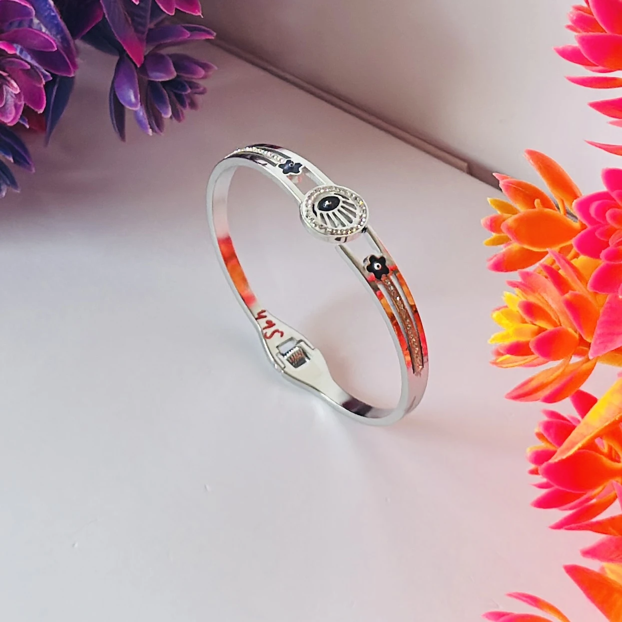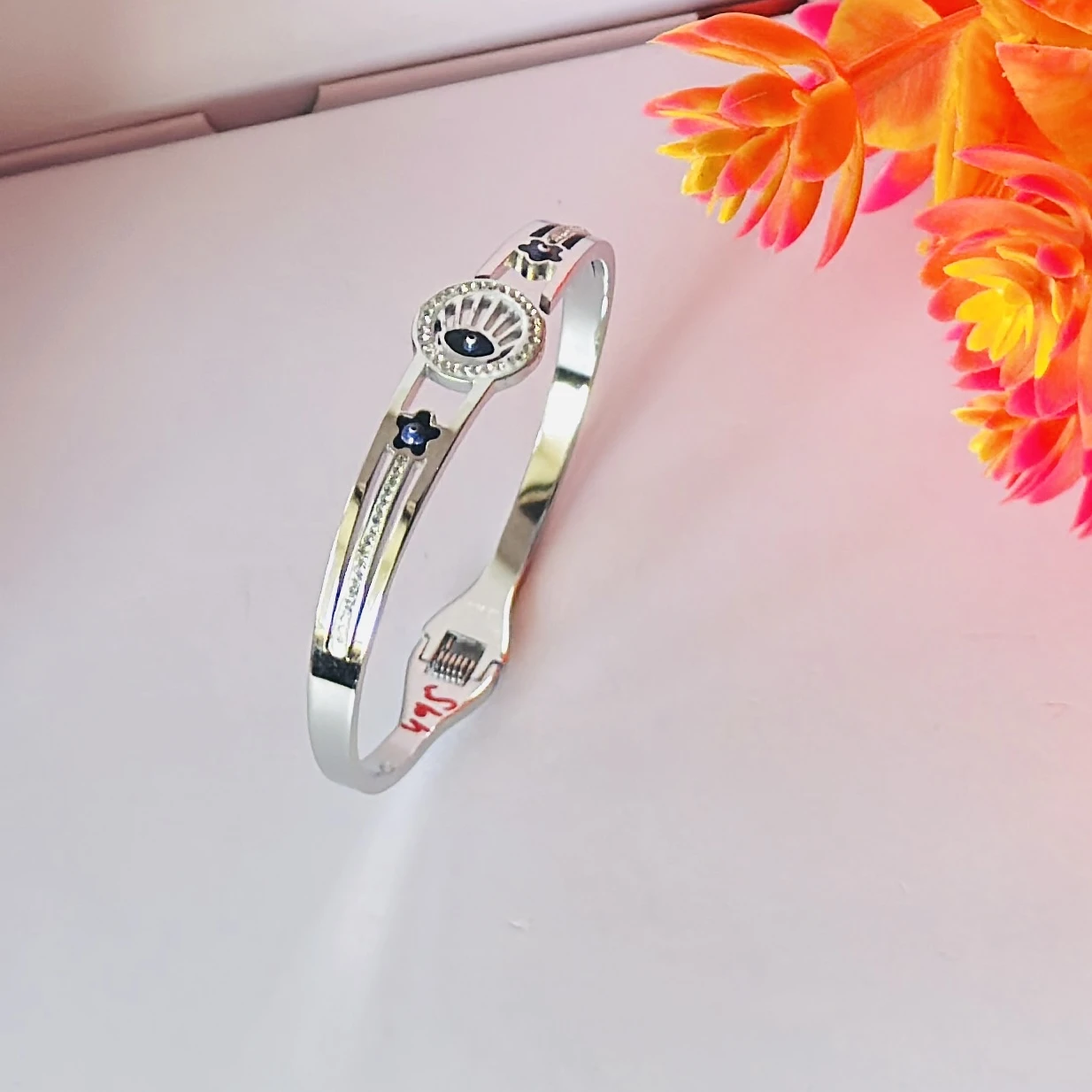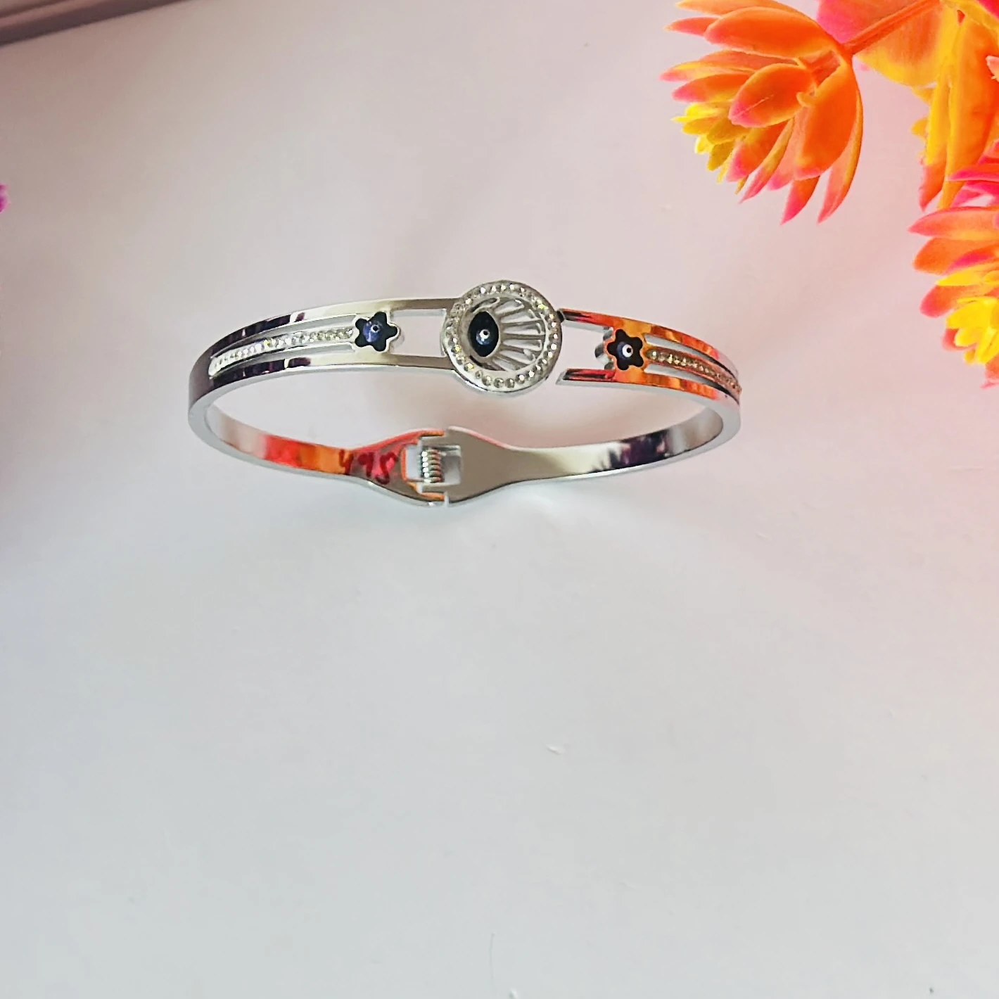 👉Theme :- stainless steel silver-plated evil eye bangle bracelet.