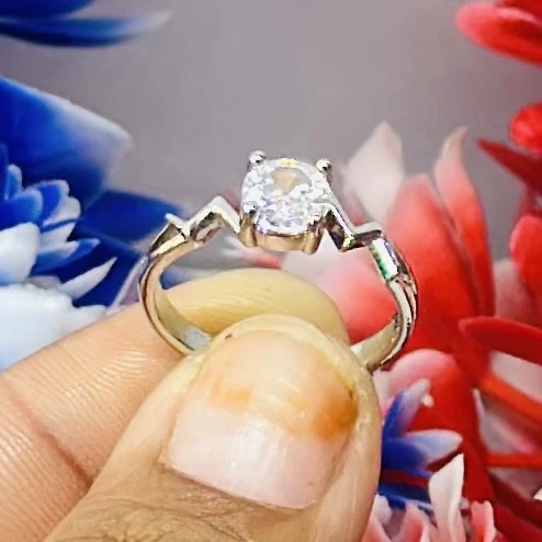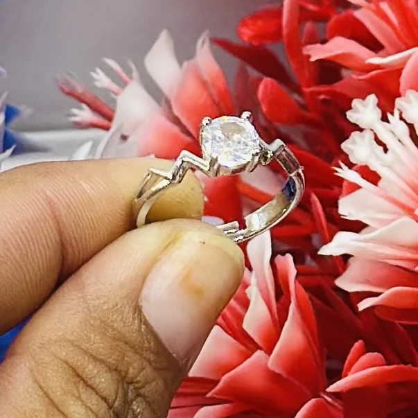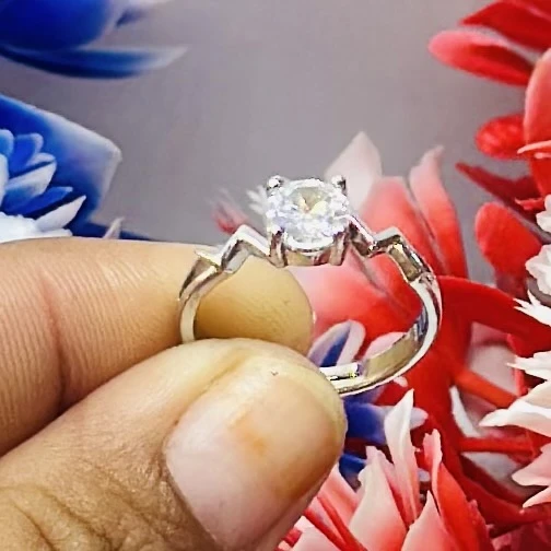 👉 Theme :- silver engagement ring with a round, clear gemstone, possibly a moissanite, in a twisted setting.