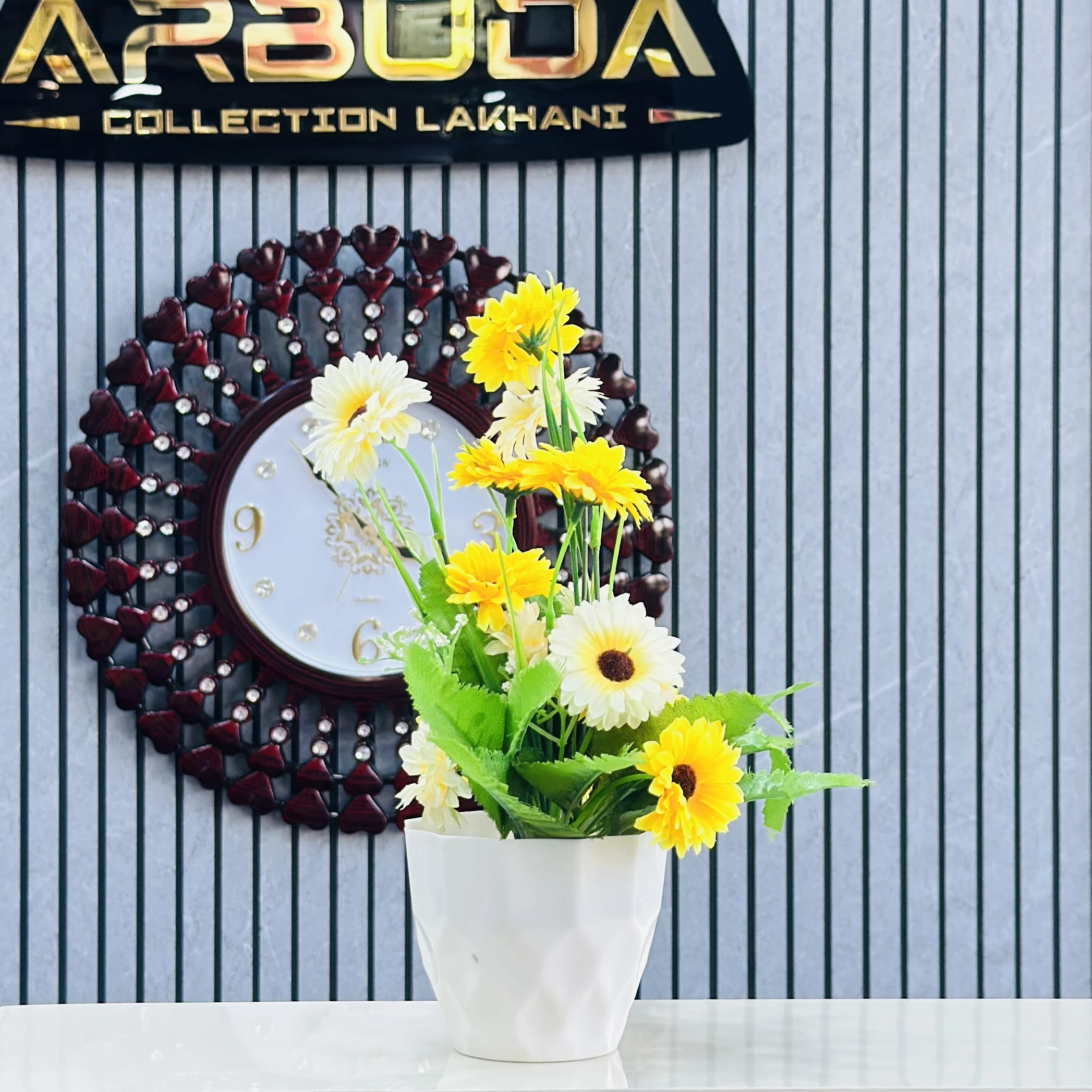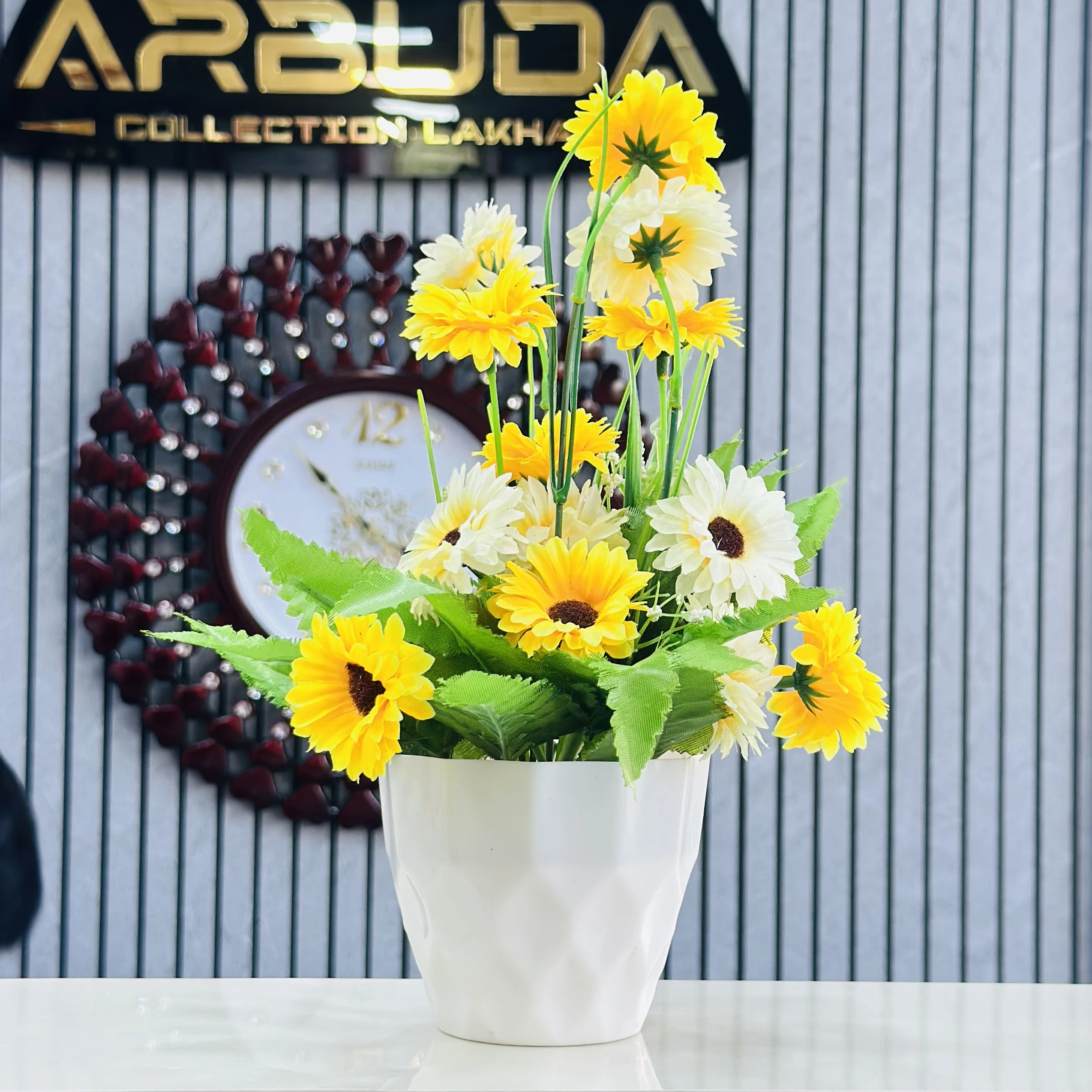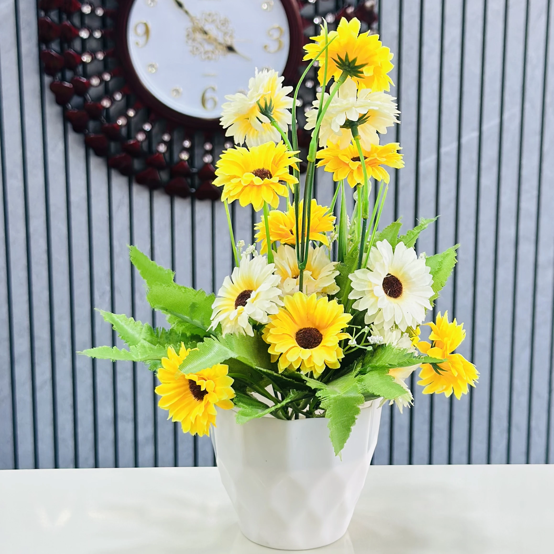 👉 Theme :- Sunflower arrangement in a white ceramic pot.