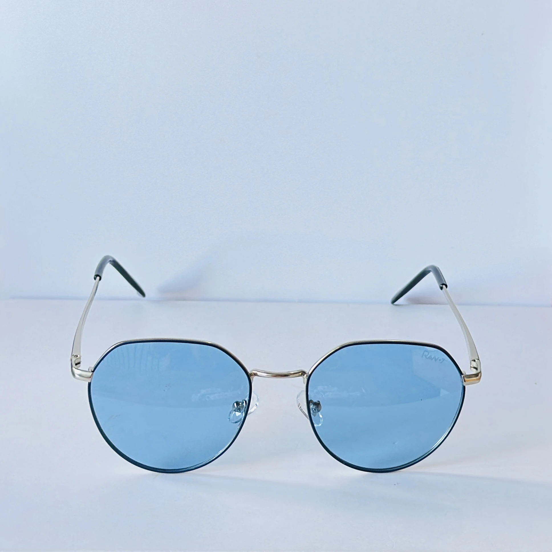 sunglasses appear to be the IRUS S1133 Hexagonal model with a silver frame and blue lenses.
