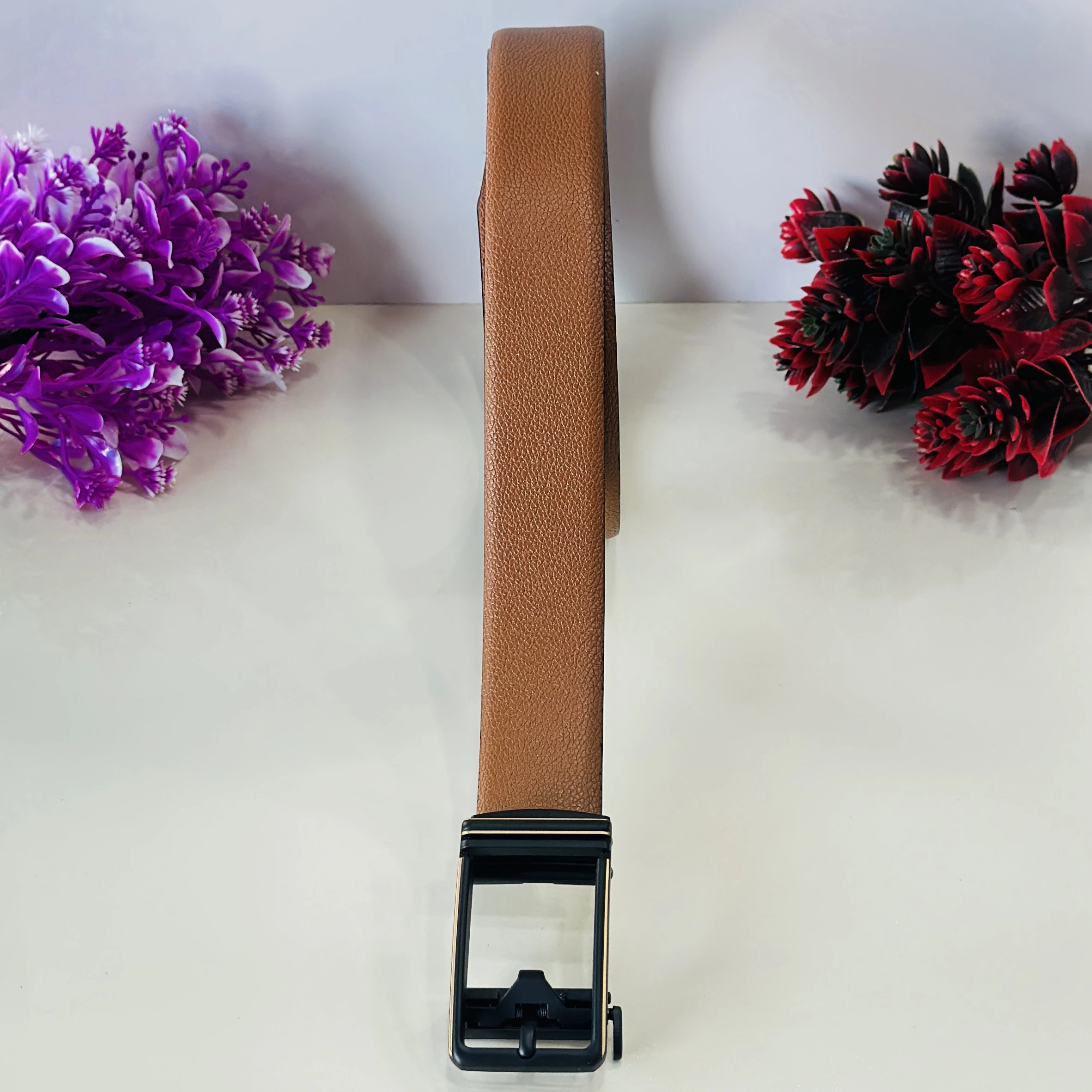 👉 Theme :- Tan and black reversible formal belt with an auto-lock buckle.